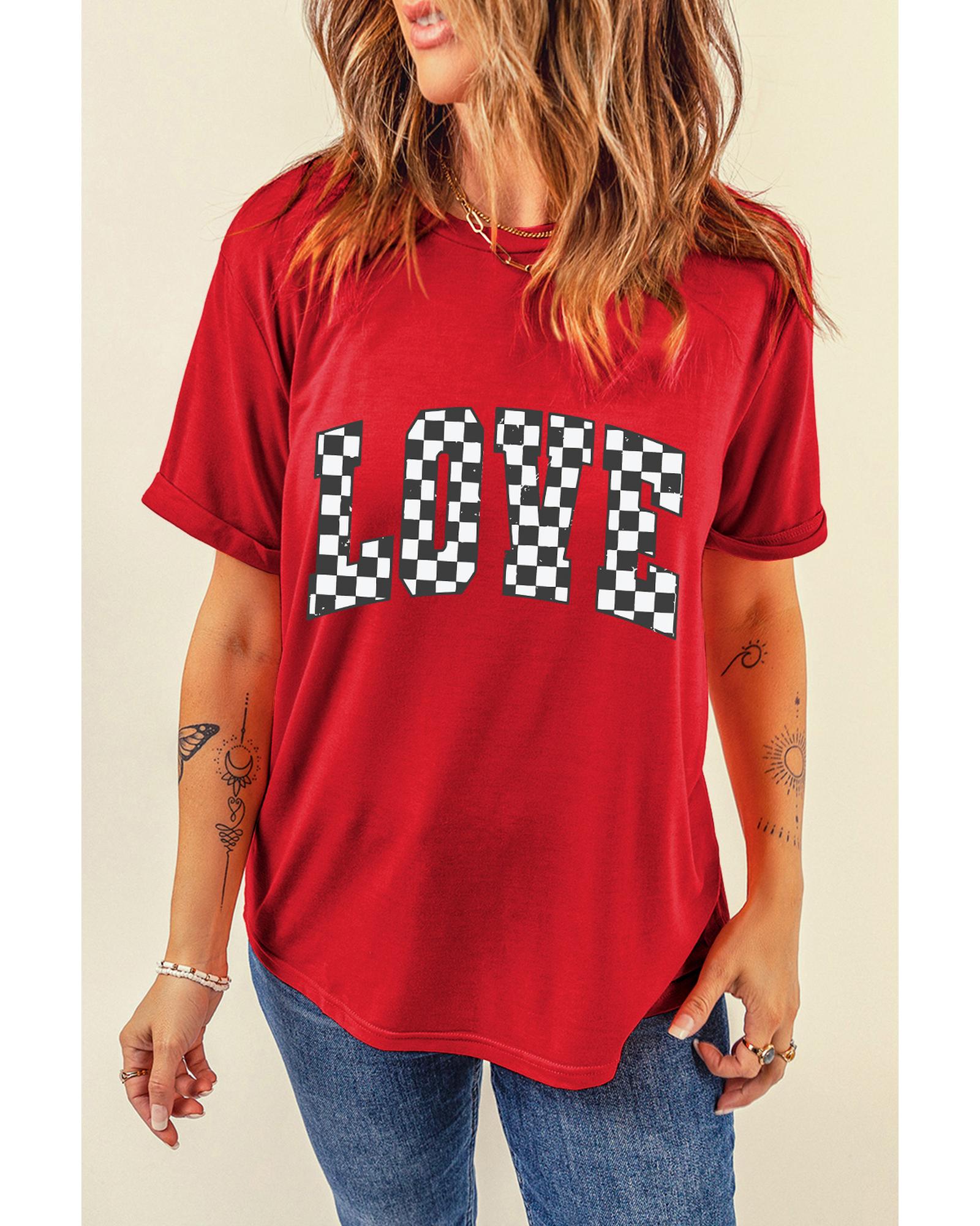 Red Checkered LOVE Letter Graphic Valentines T Shirt – L