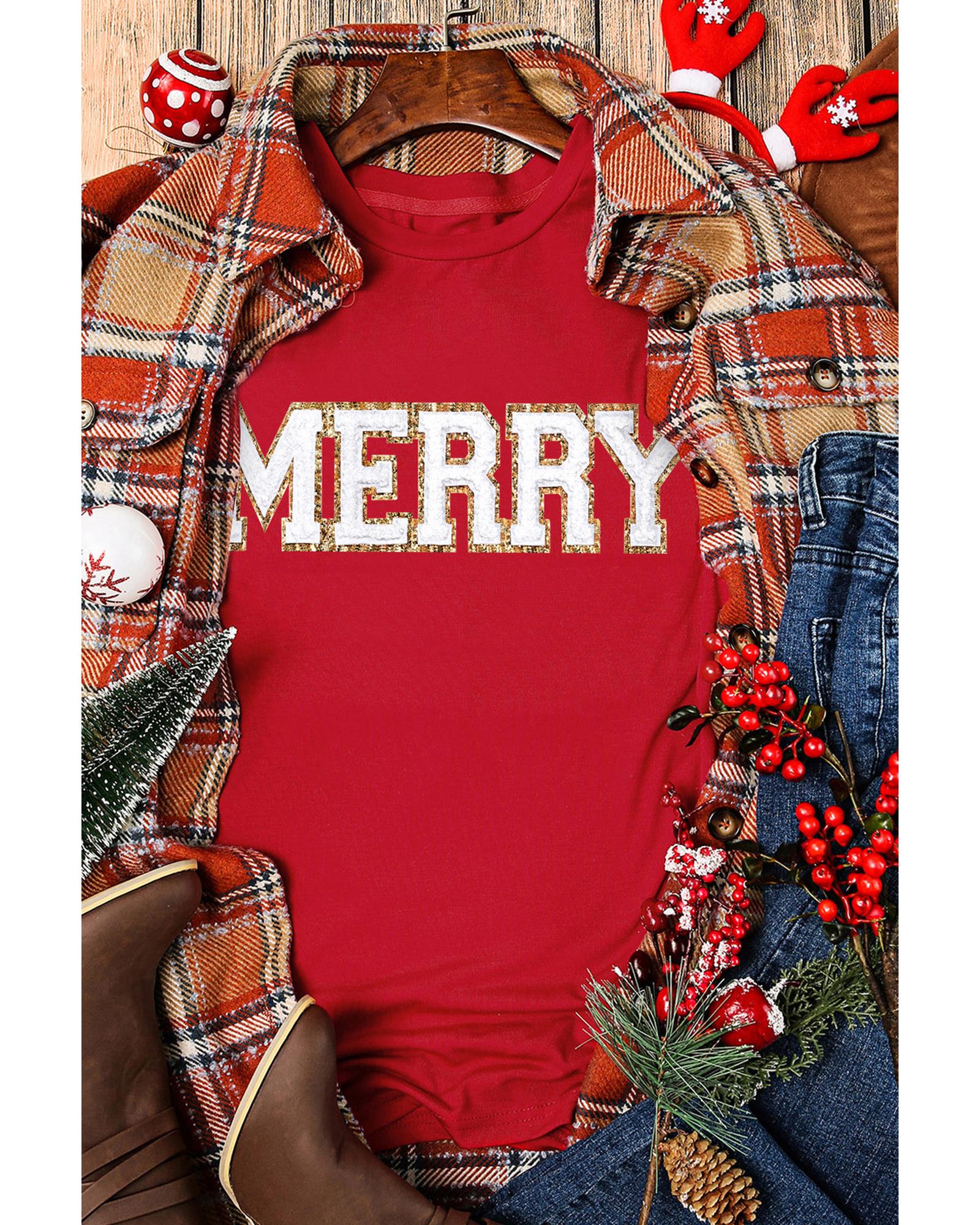 Red Christmas MERRY Graphic Cuffed Sleeve T Shirt – L