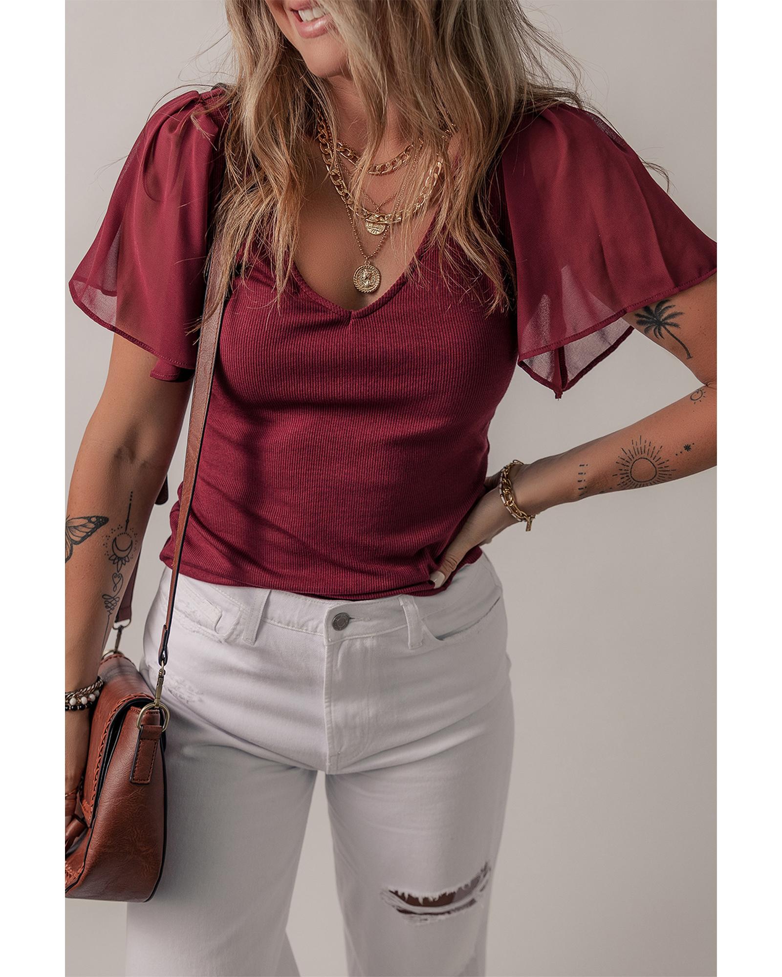 Red Dahlia Mesh Ruffled Sleeve Slim Fit V Neck Top – M