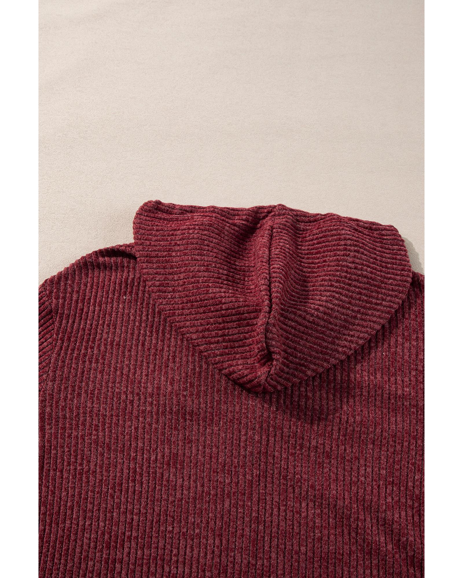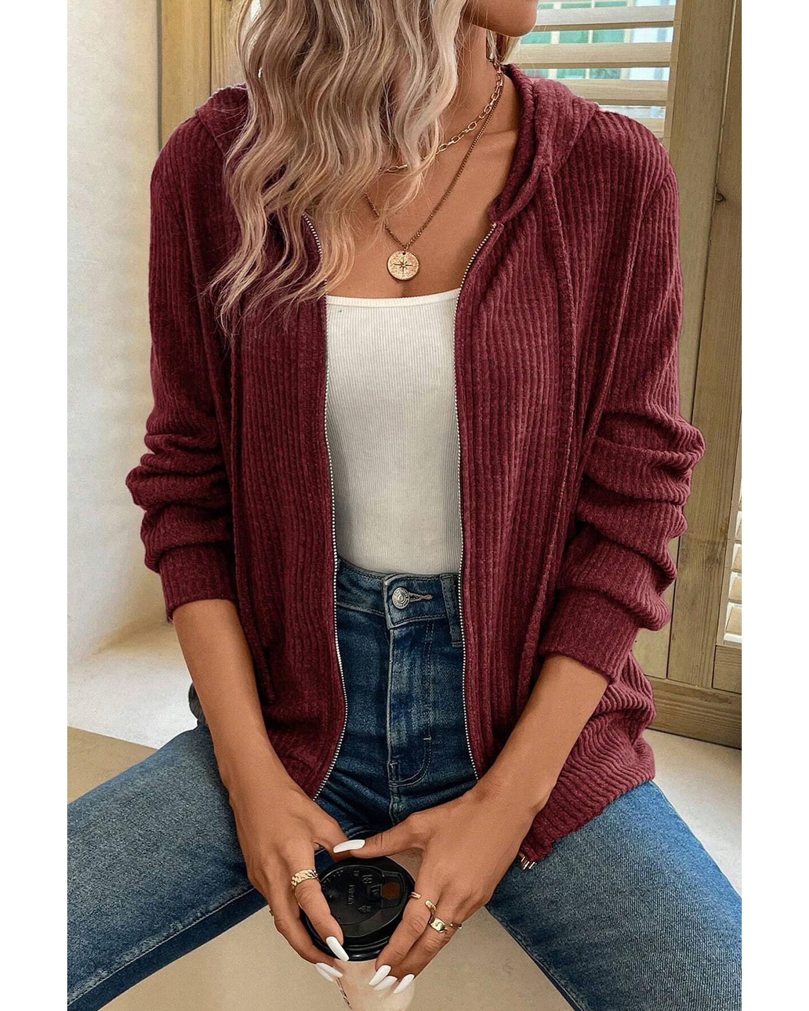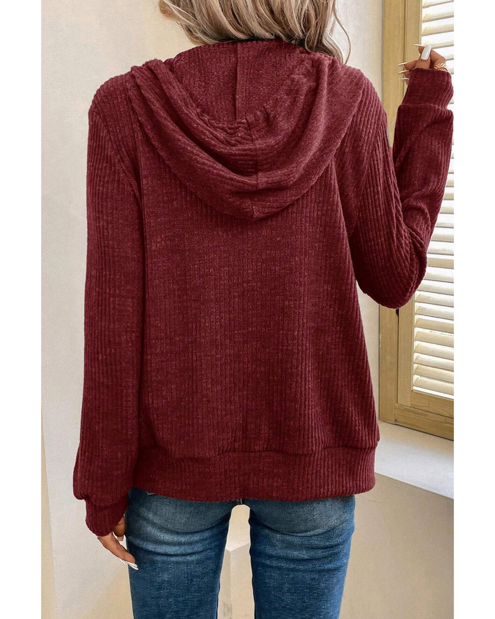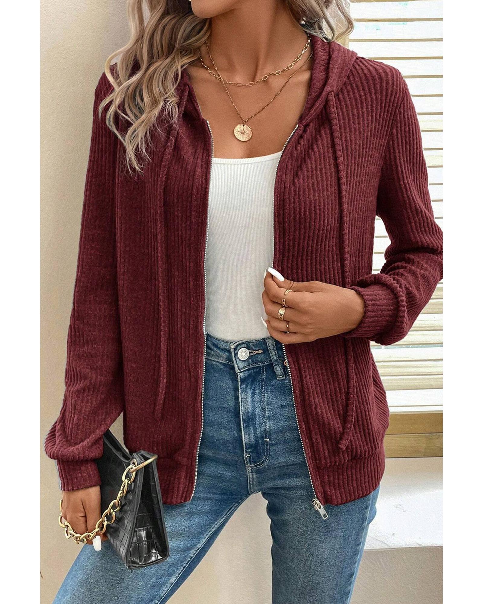 Red Dahlia Ribbed Zip Up Front Drawstring Hoodie – L