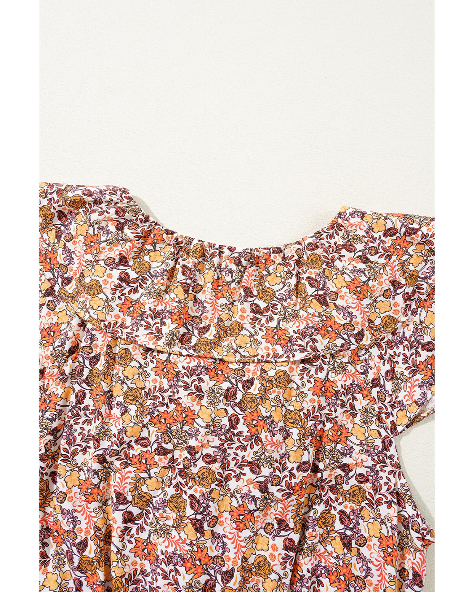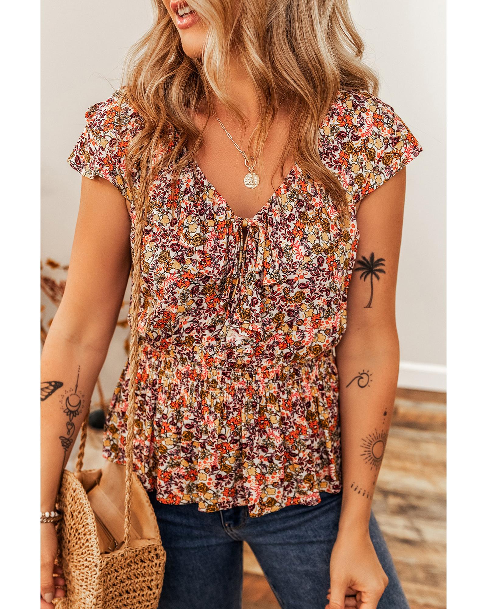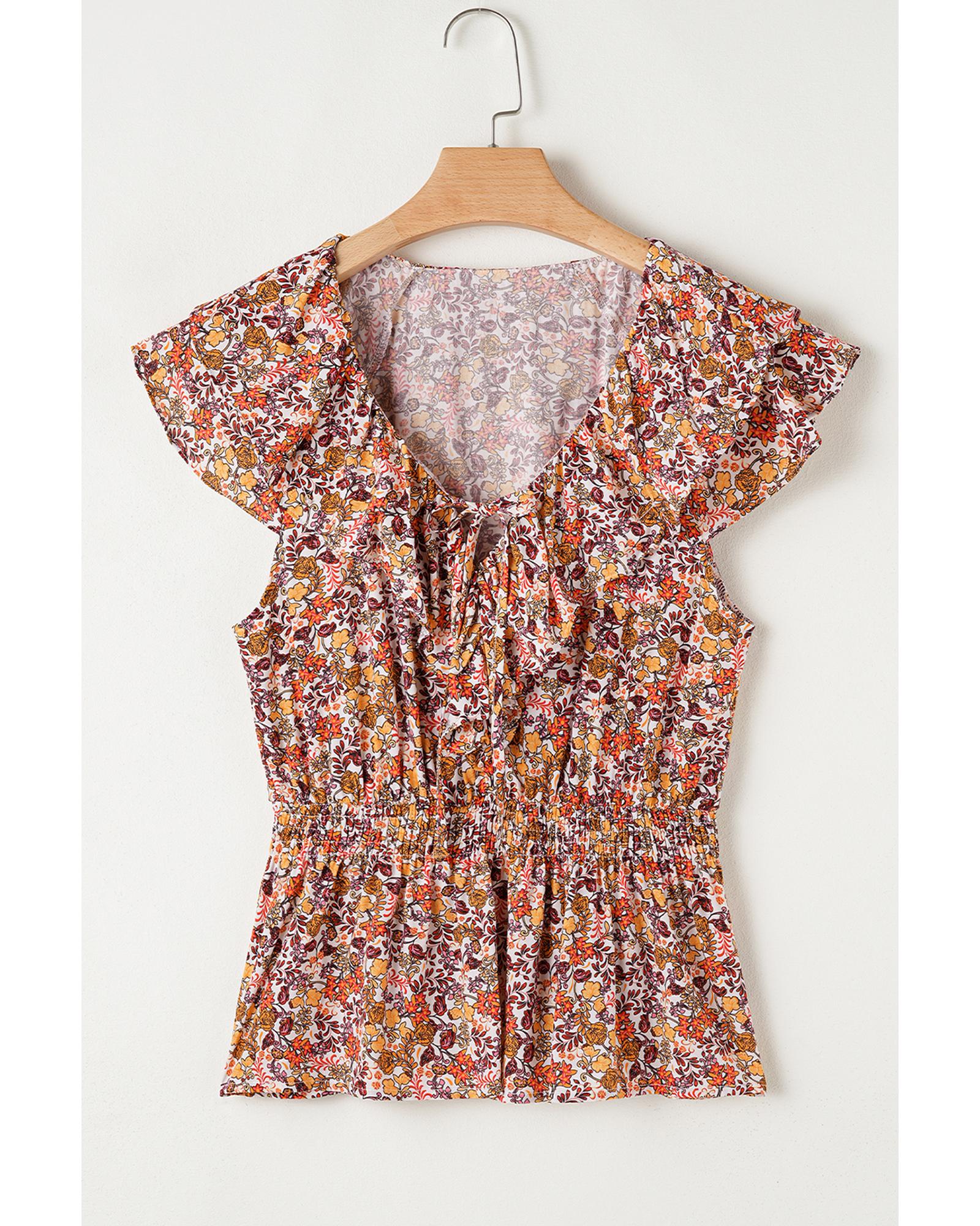 Red Floral Print Knot V Neck Ruffled Sleeve Blouse – XL