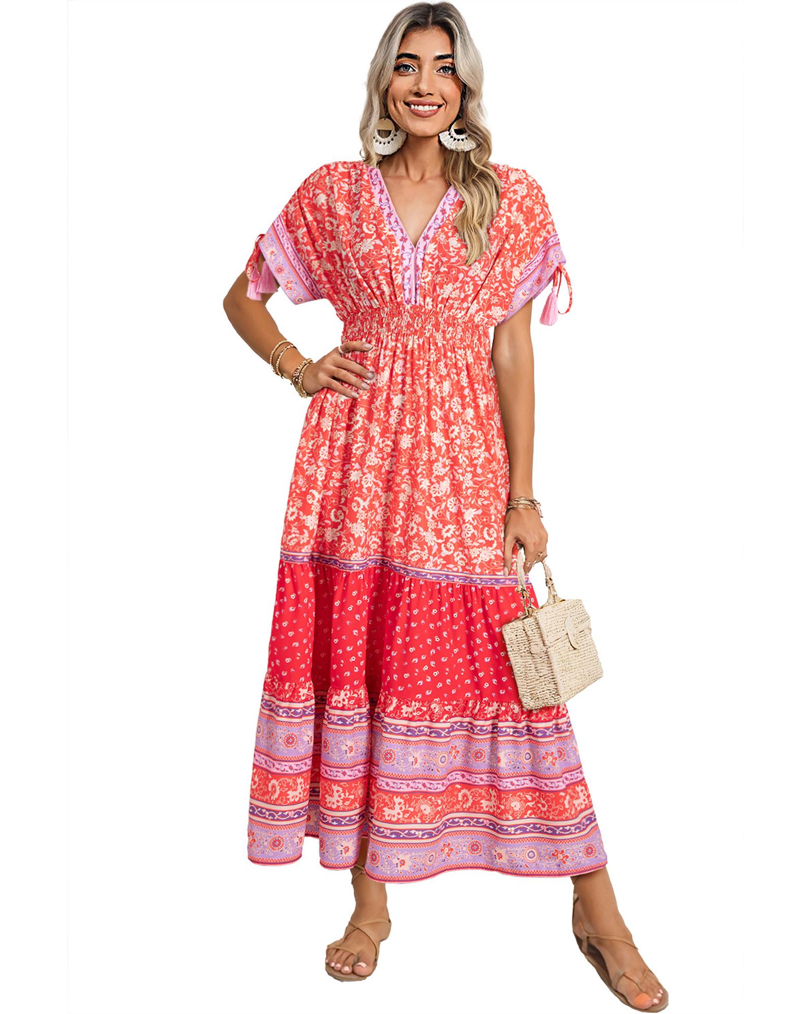 Red Floral Print Tasseled Tied Sleeve Empire Waist Maxi Dress – XL