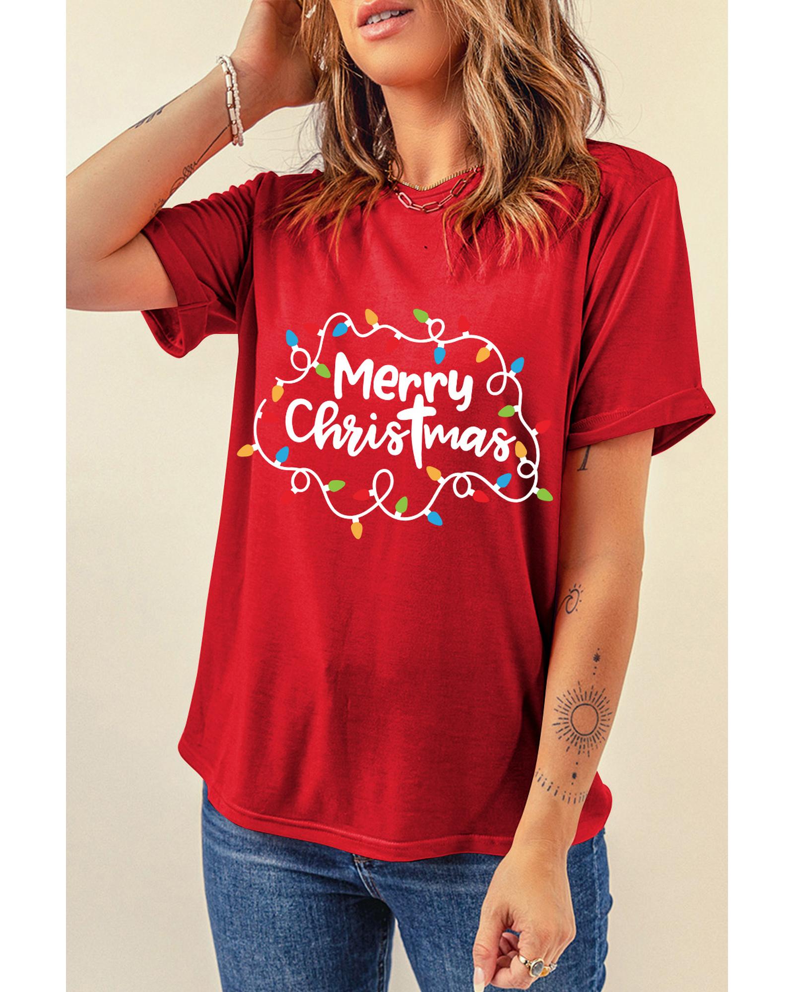 Red Merry Christmas Lights Print Crew Neck T Shirt - L