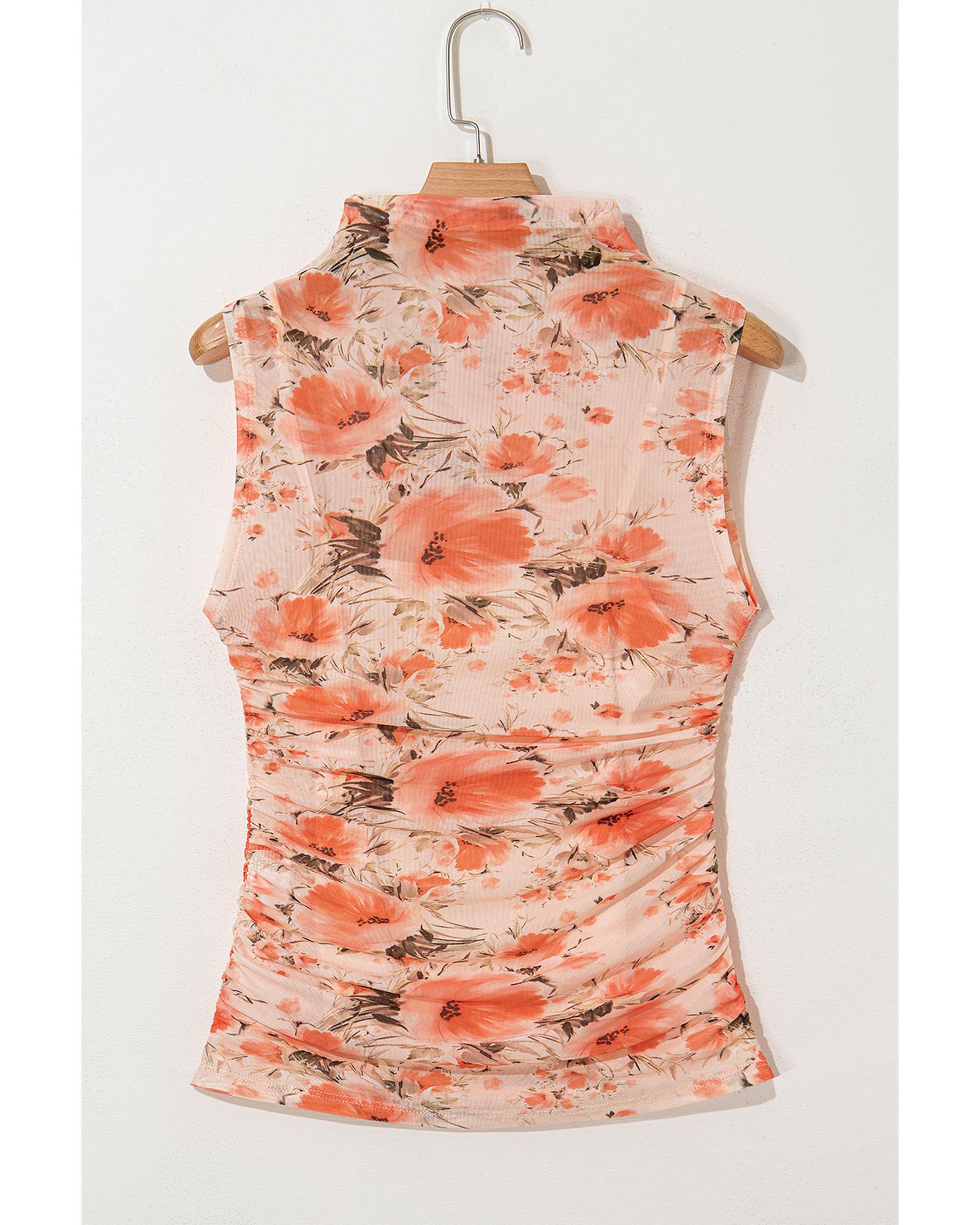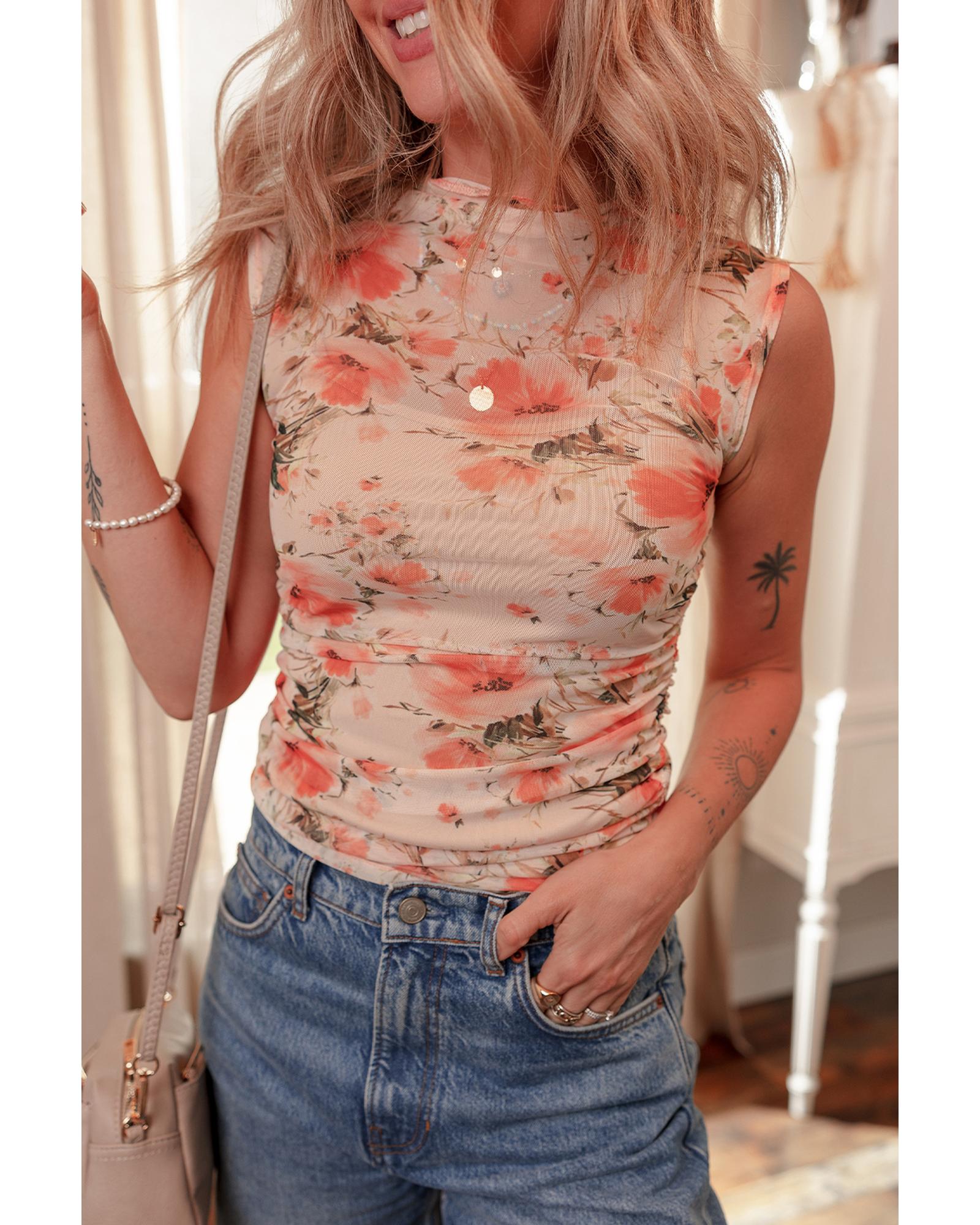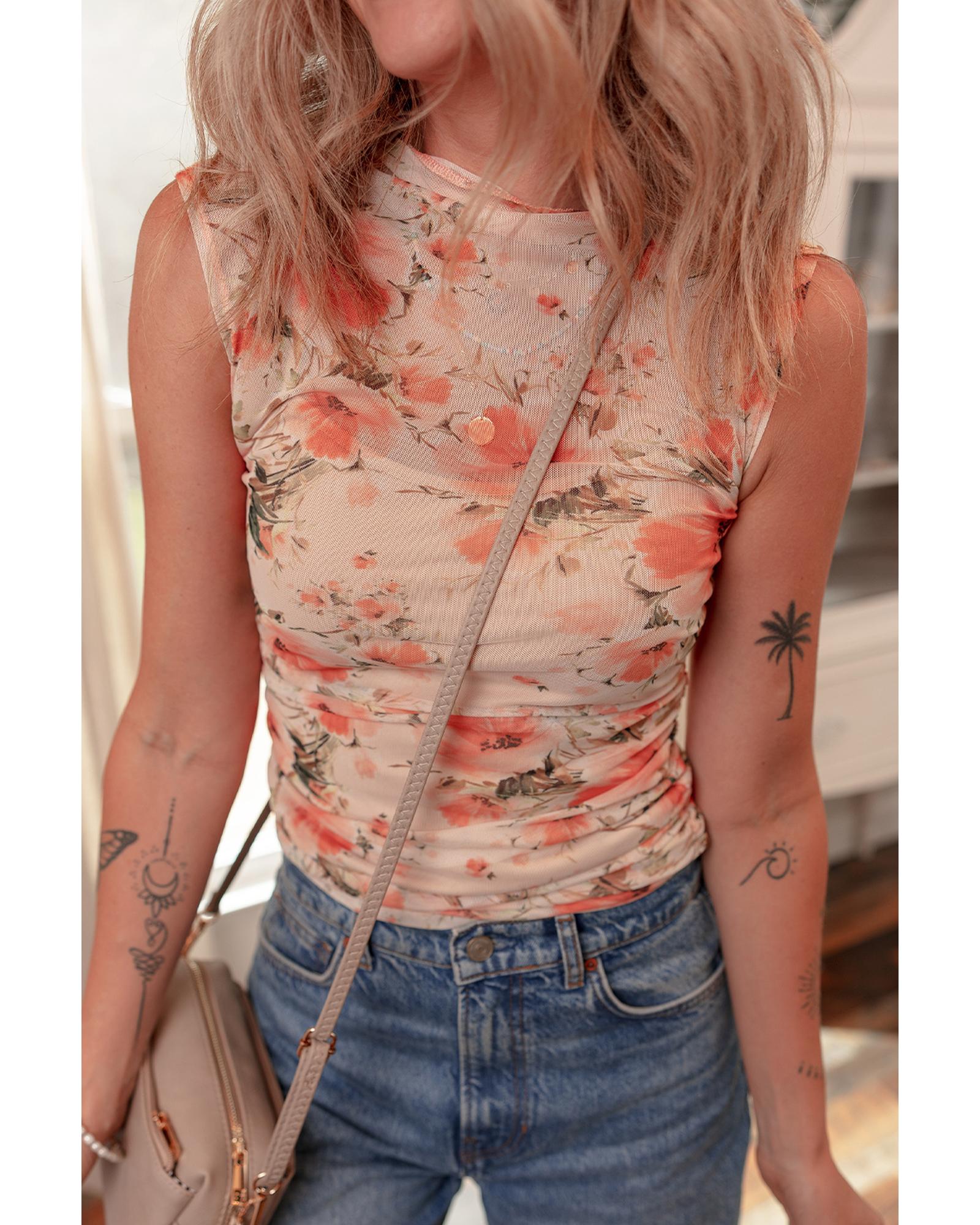 Red Mesh Floral Printed Slim Fit Tank Top – L
