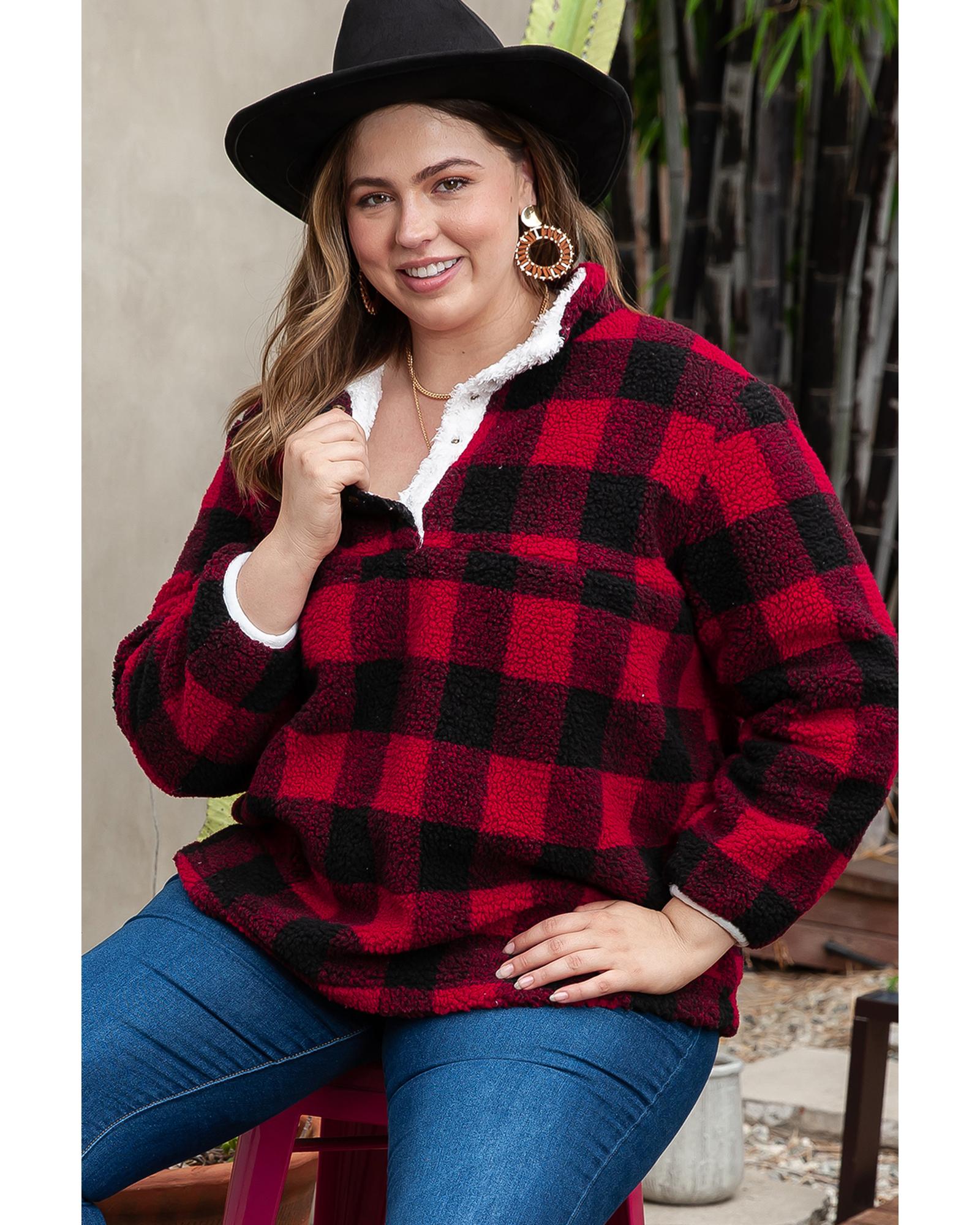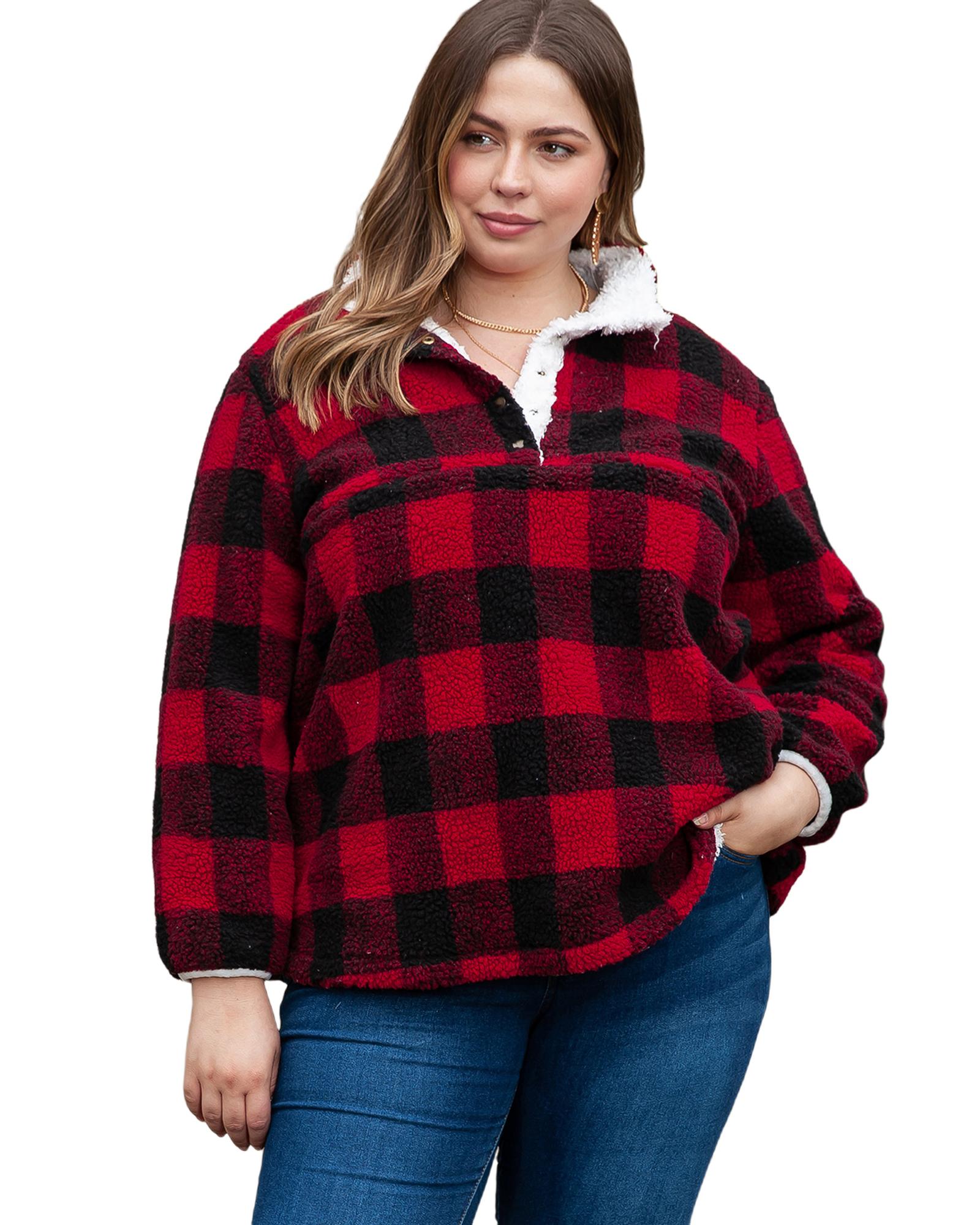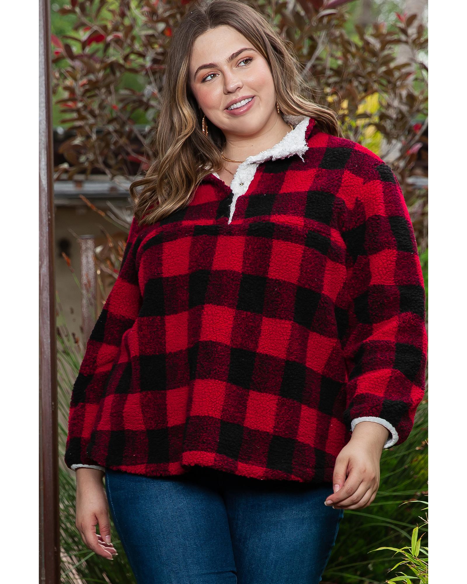 Red Plus Size Buffalo Plaid Sherpa Henley Sweatshirt – 1X