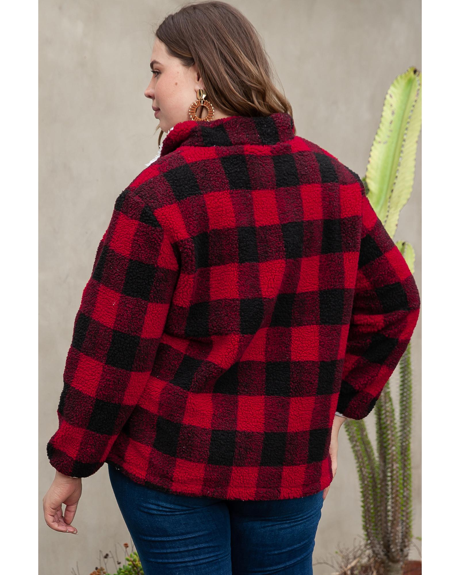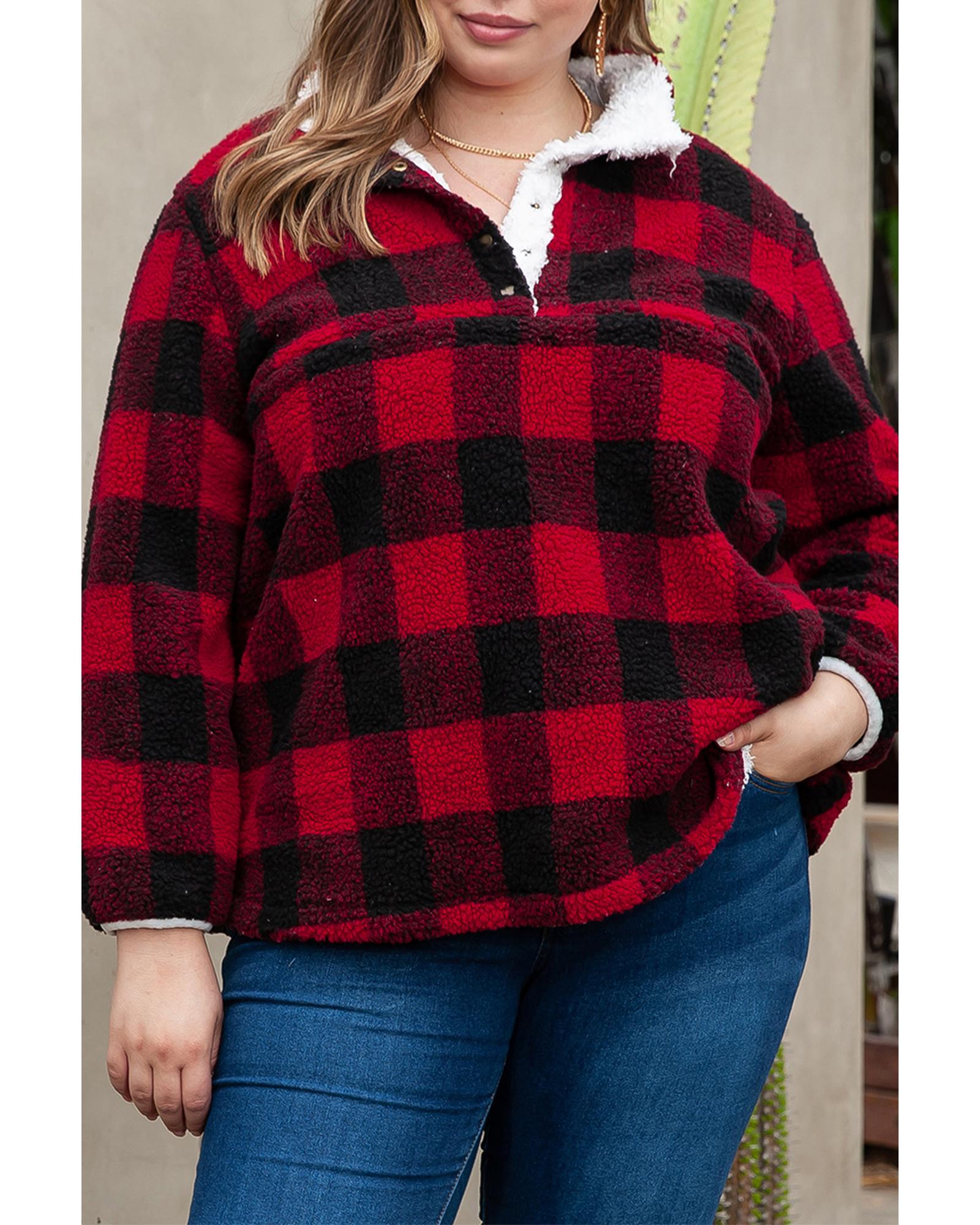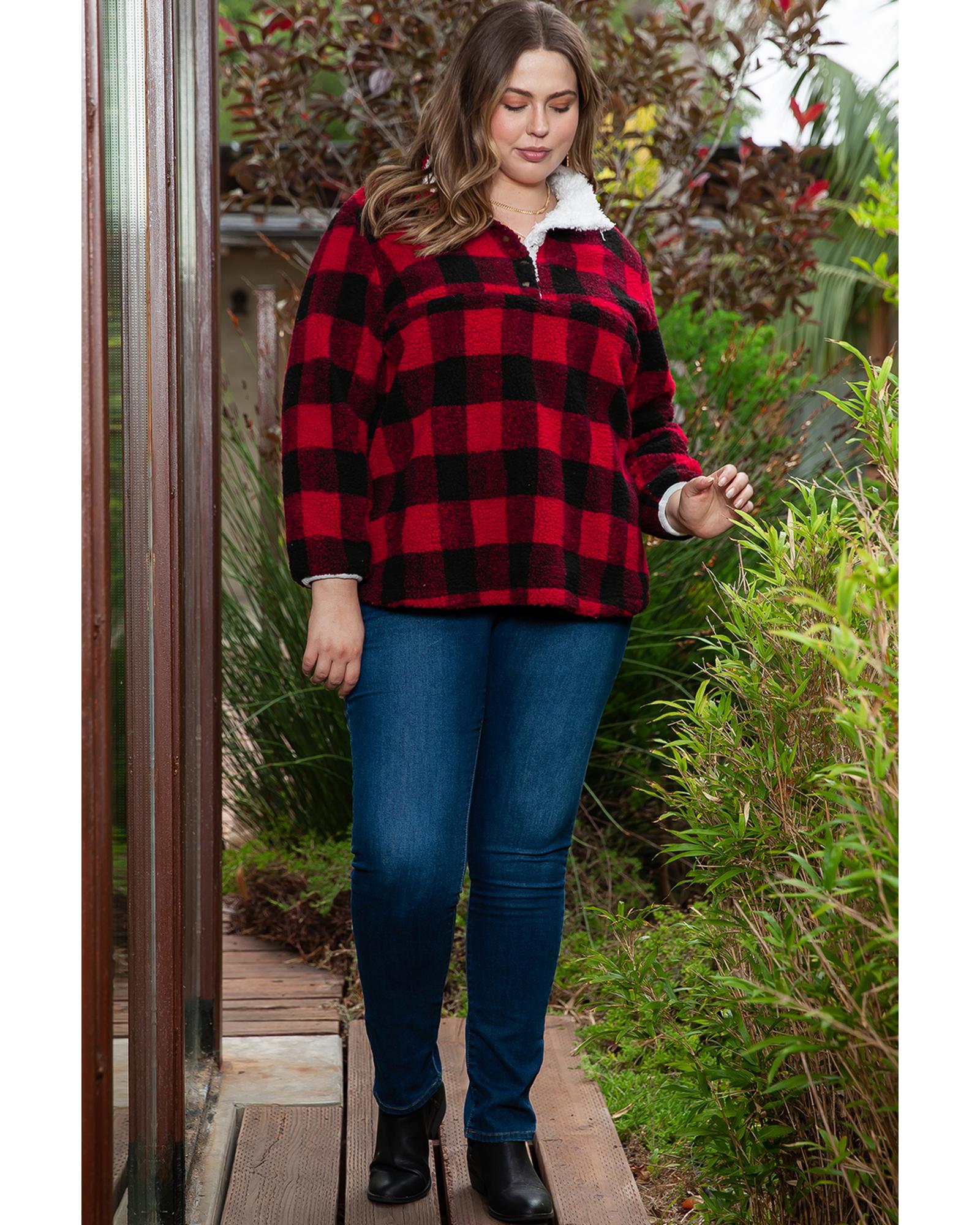 Red Plus Size Buffalo Plaid Sherpa Henley Sweatshirt – 1X