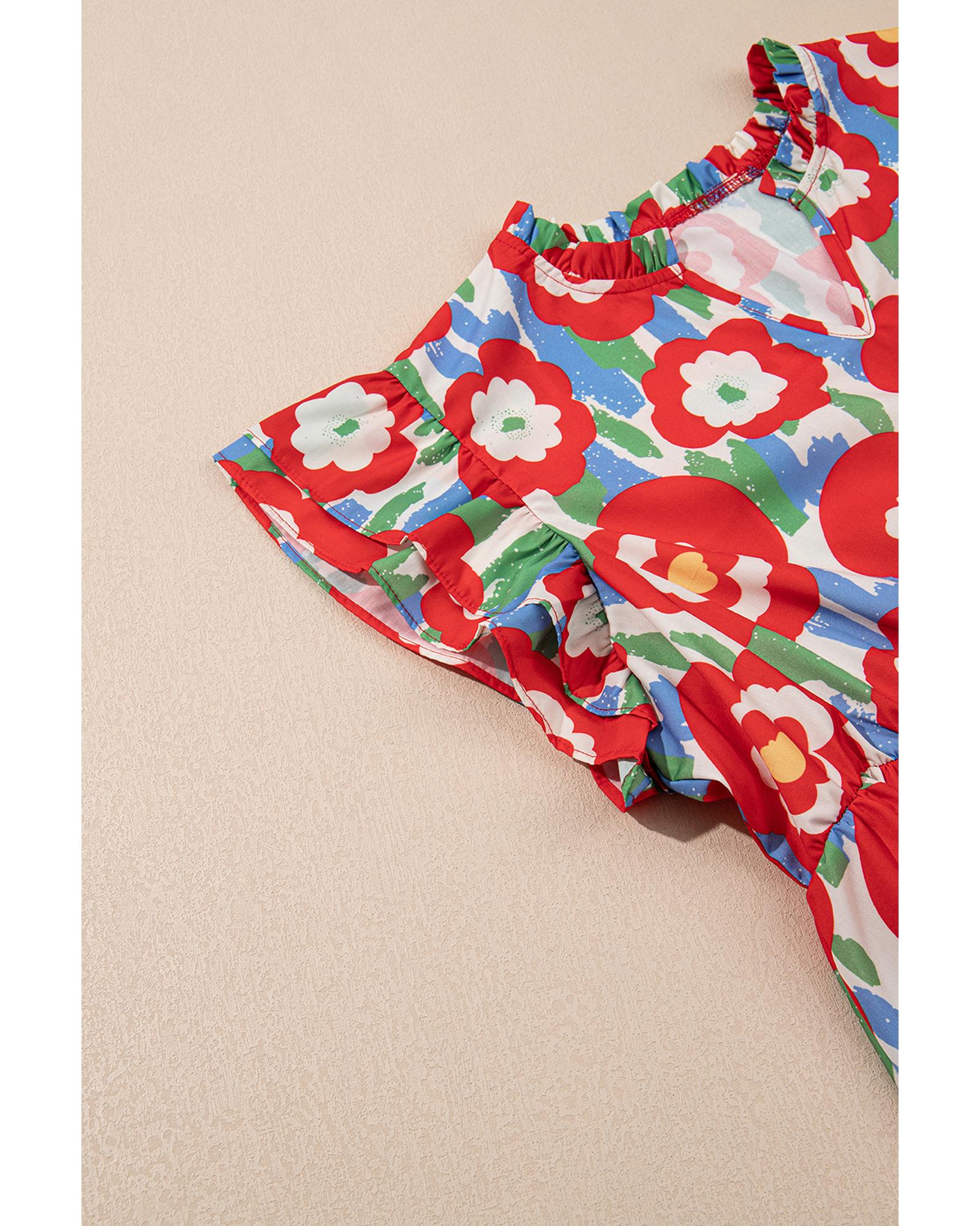 Red Plus Size Floral Print Ruffle Trim Split Neck Peplum Top - 2X