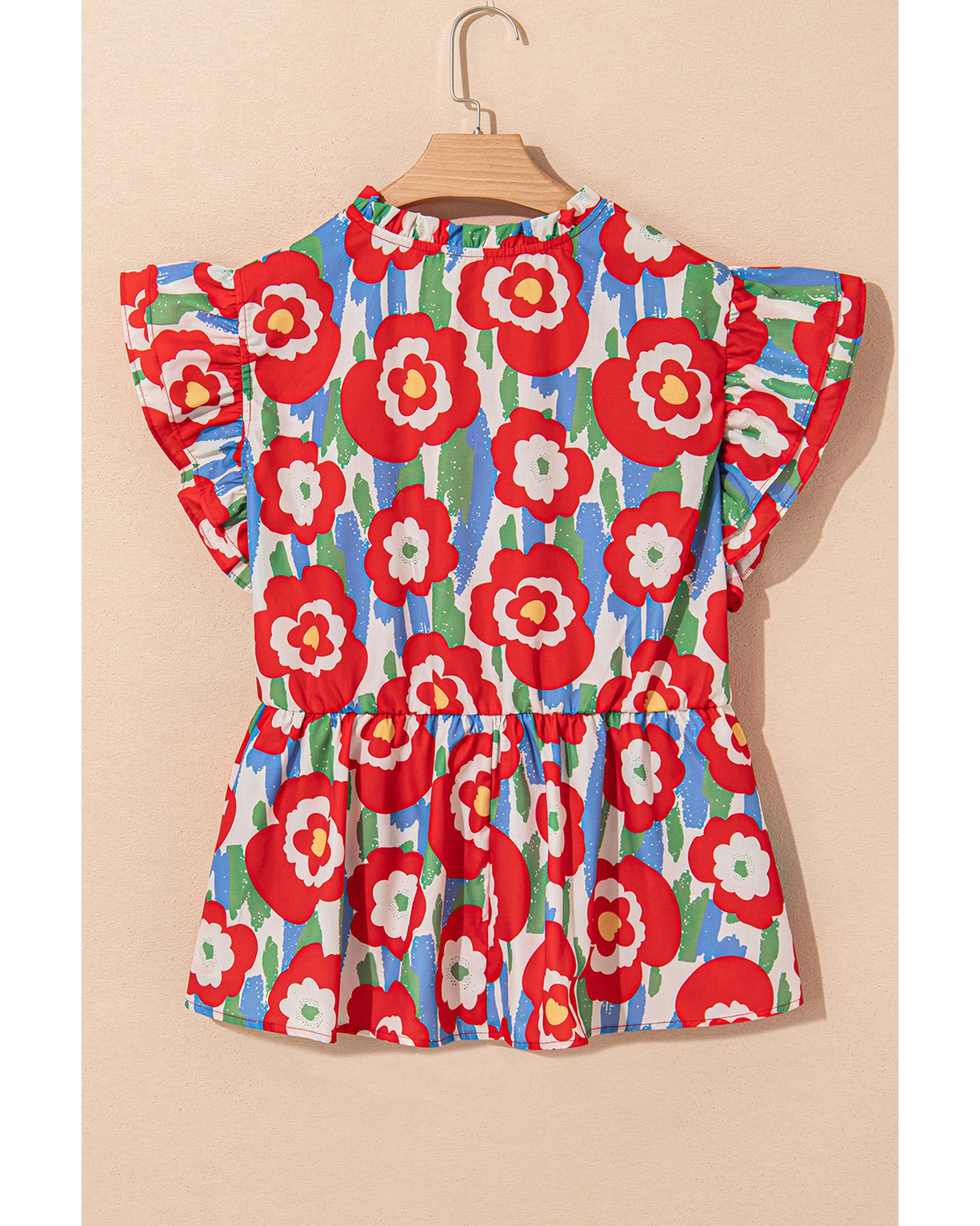 Red Plus Size Floral Print Ruffle Trim Split Neck Peplum Top – 4X