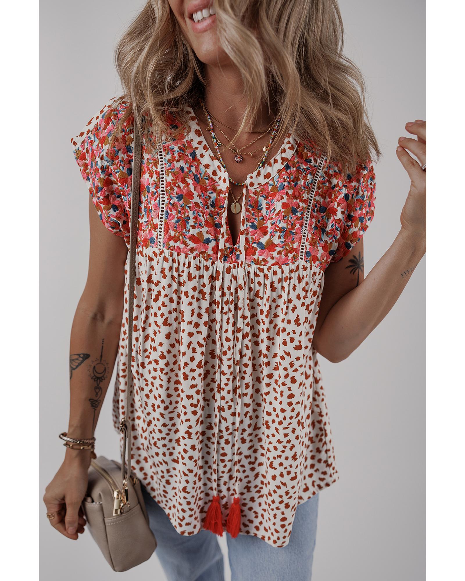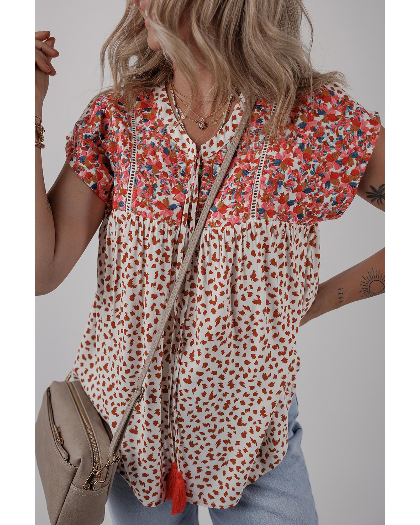 • Red Printed Embroidery Detail Tie Split Neck Blouse