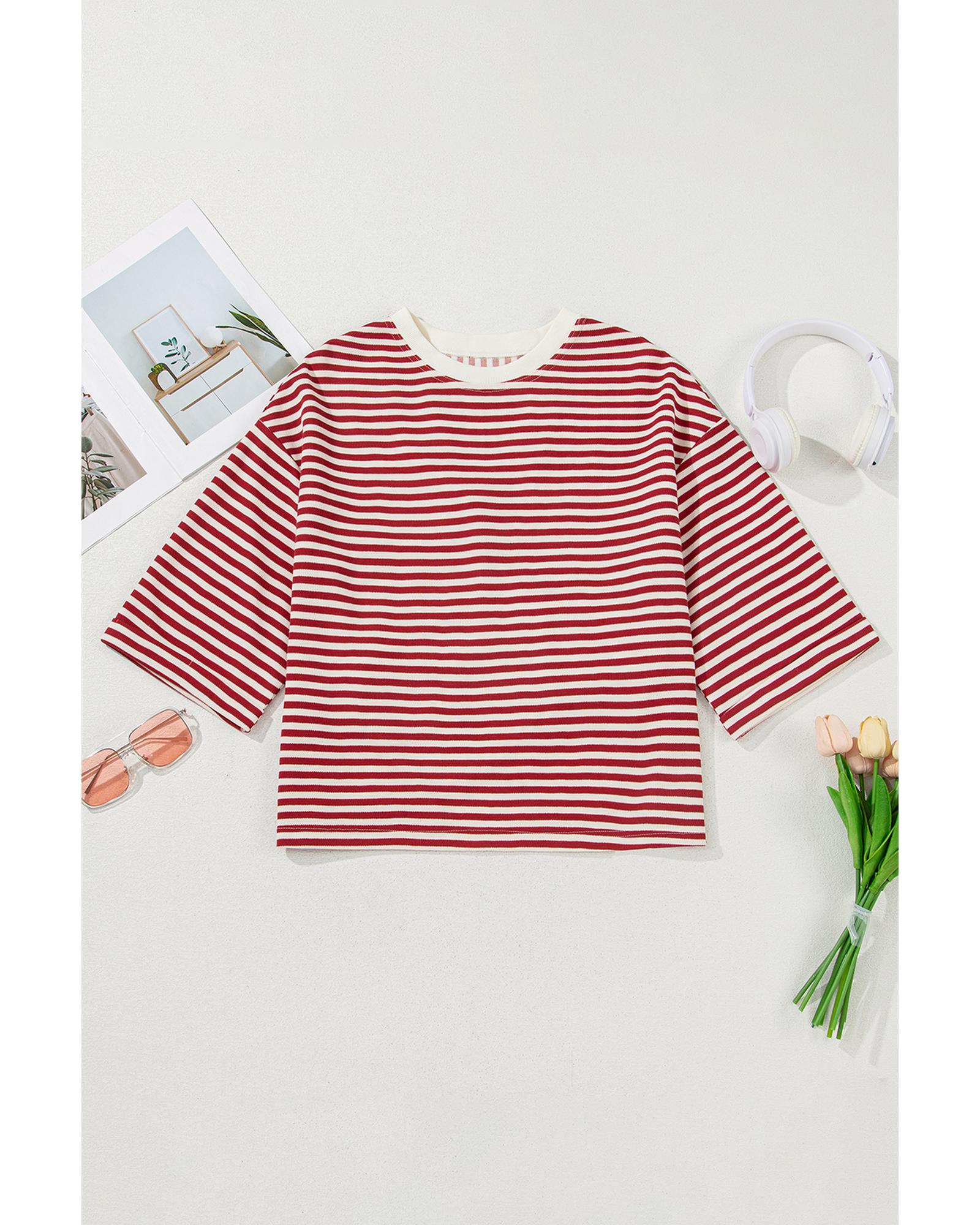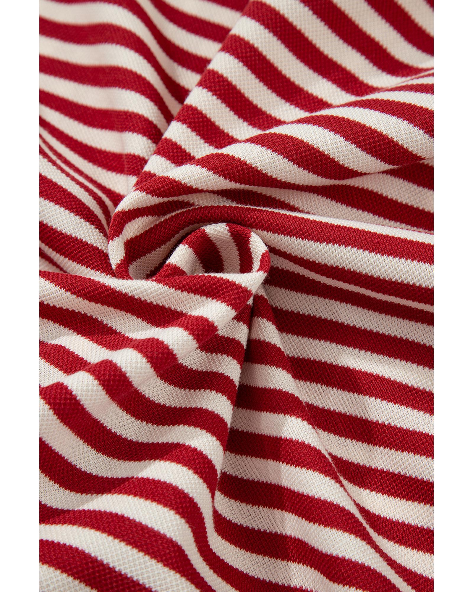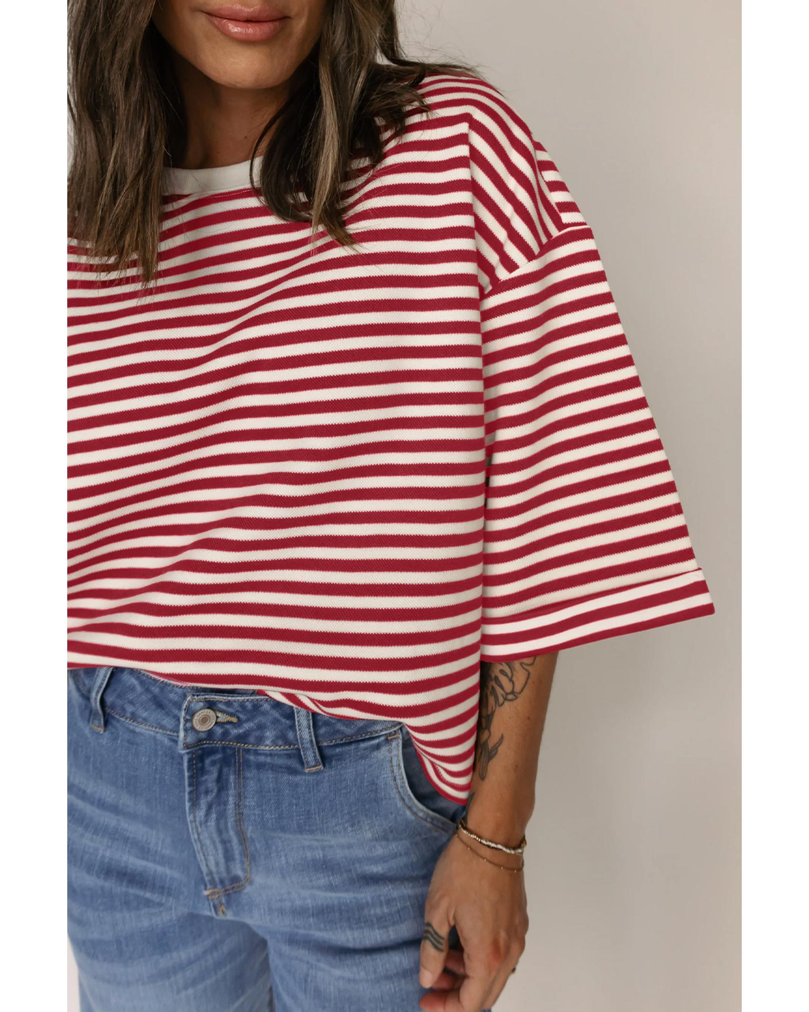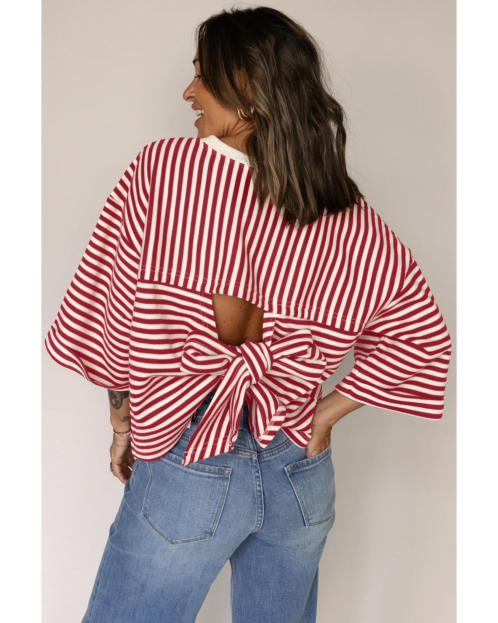 Red Stripe Bowknot Cutout Back Drop Shoulder Wide Bracelet Sleeve Loose Tee – XL