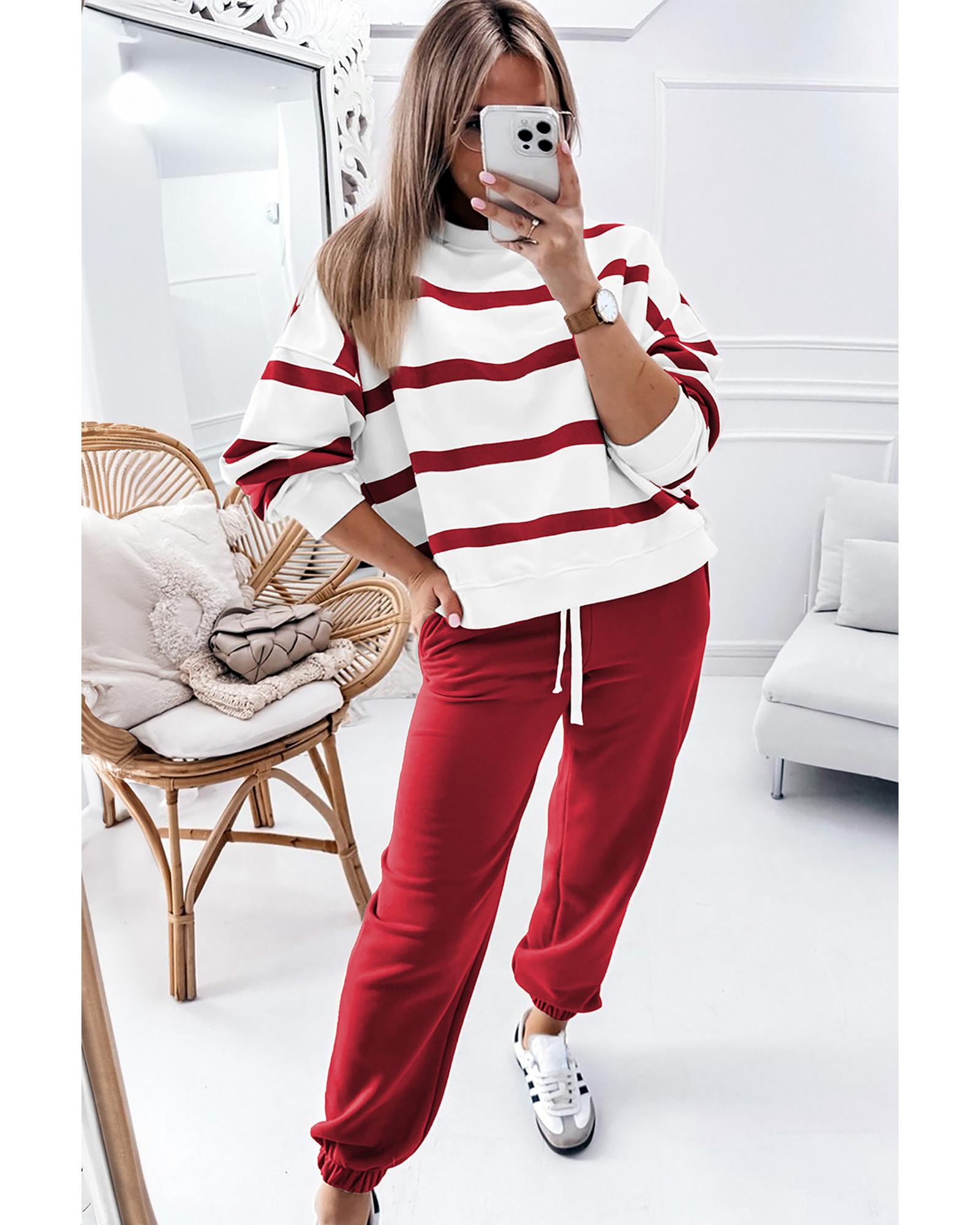 Red Stripe Drop Shoulder Pullover and Jogger Pants Set – L
