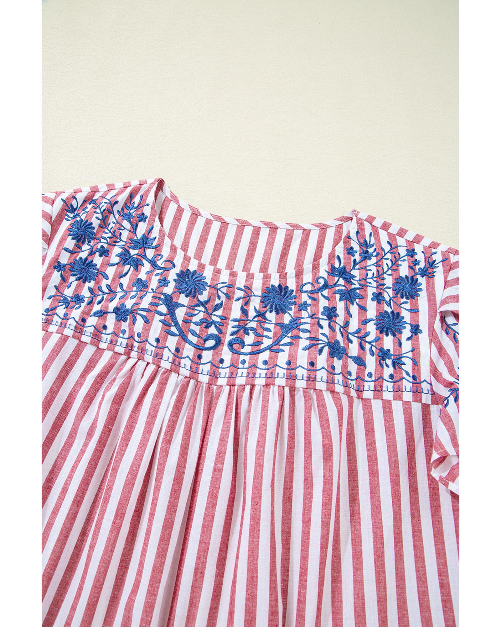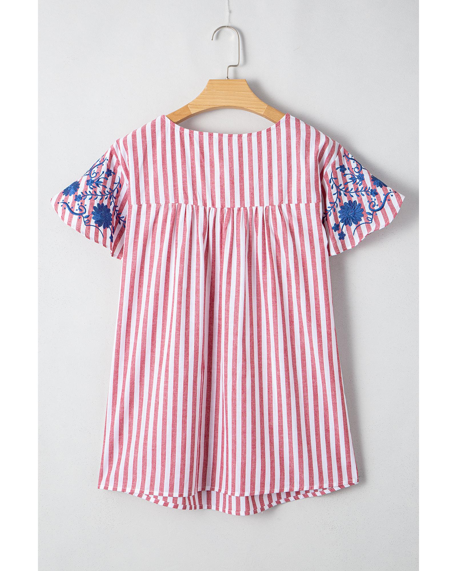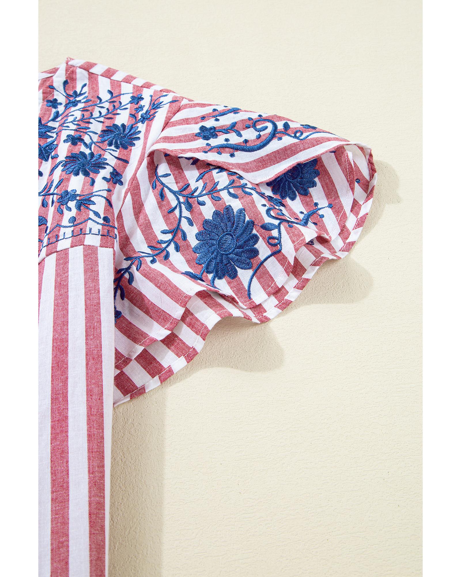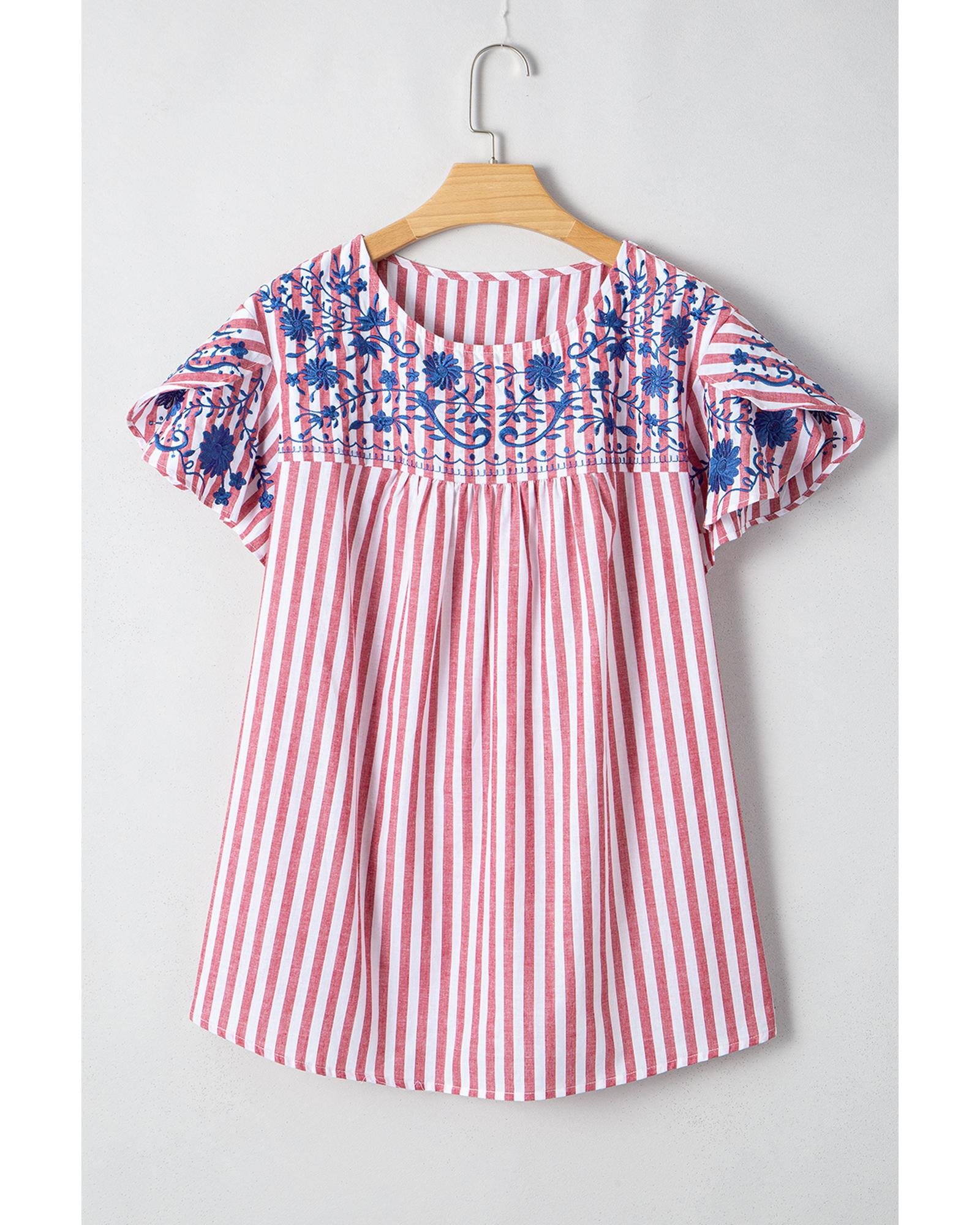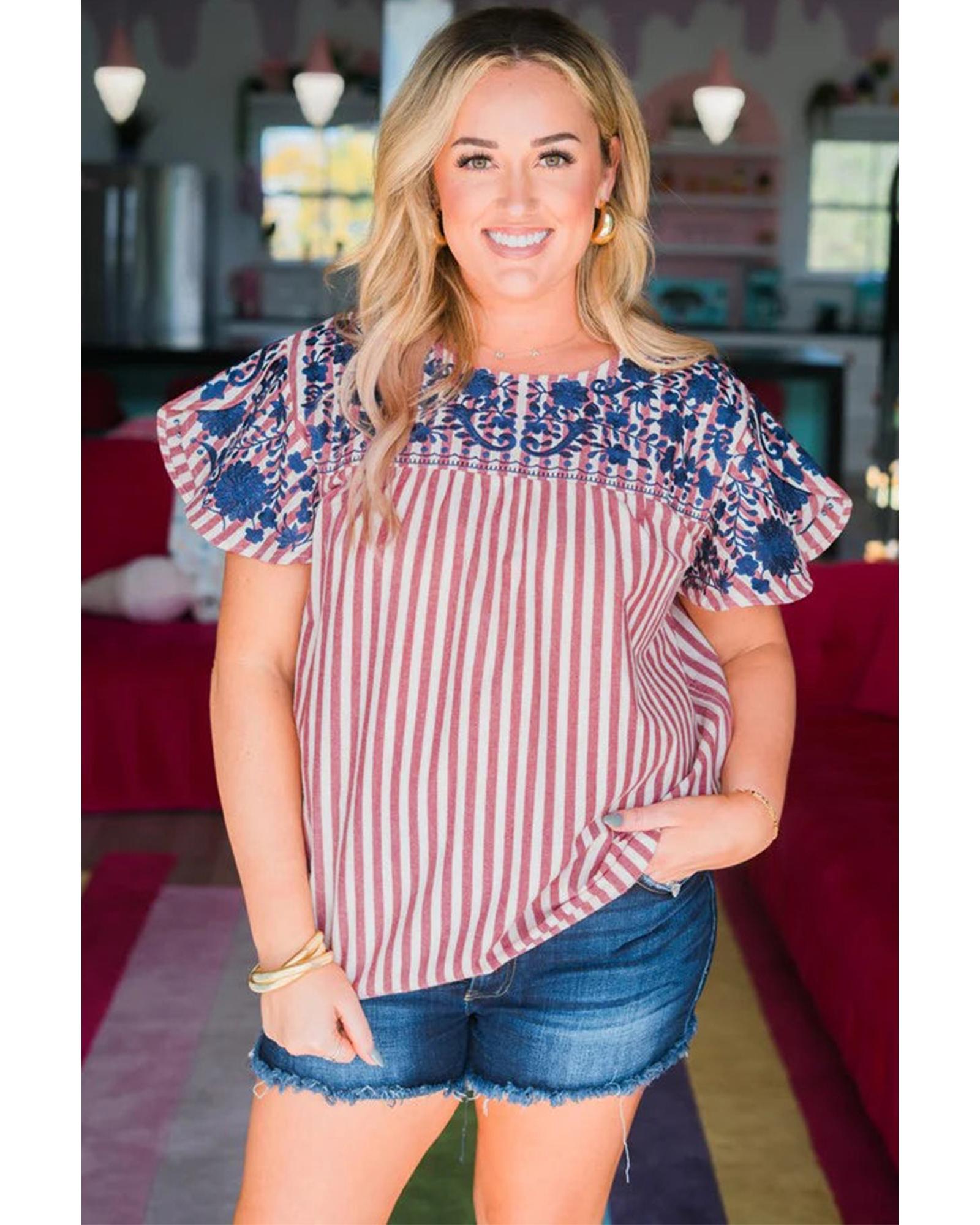 Red Stripe Plus Size Floral Embroidered Petal Sleeve Blouse – 4X