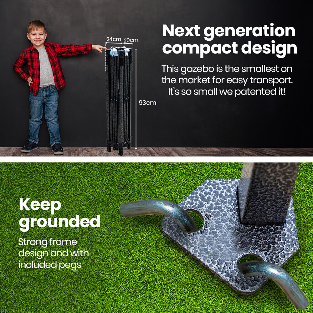 The Red Track 2.2×3.6m Gazebo (with 3 walls included) stands out with the smallest folded size on the market—just 93cm long! This ultra-compact 13kg design makes it incredibly easy for one person to carry, transport, and store, offering unmatched convenience compared to bulkier alternatives. Whether you’re short on space or always on the move, this gazebo’s design ensures portability without compromise.