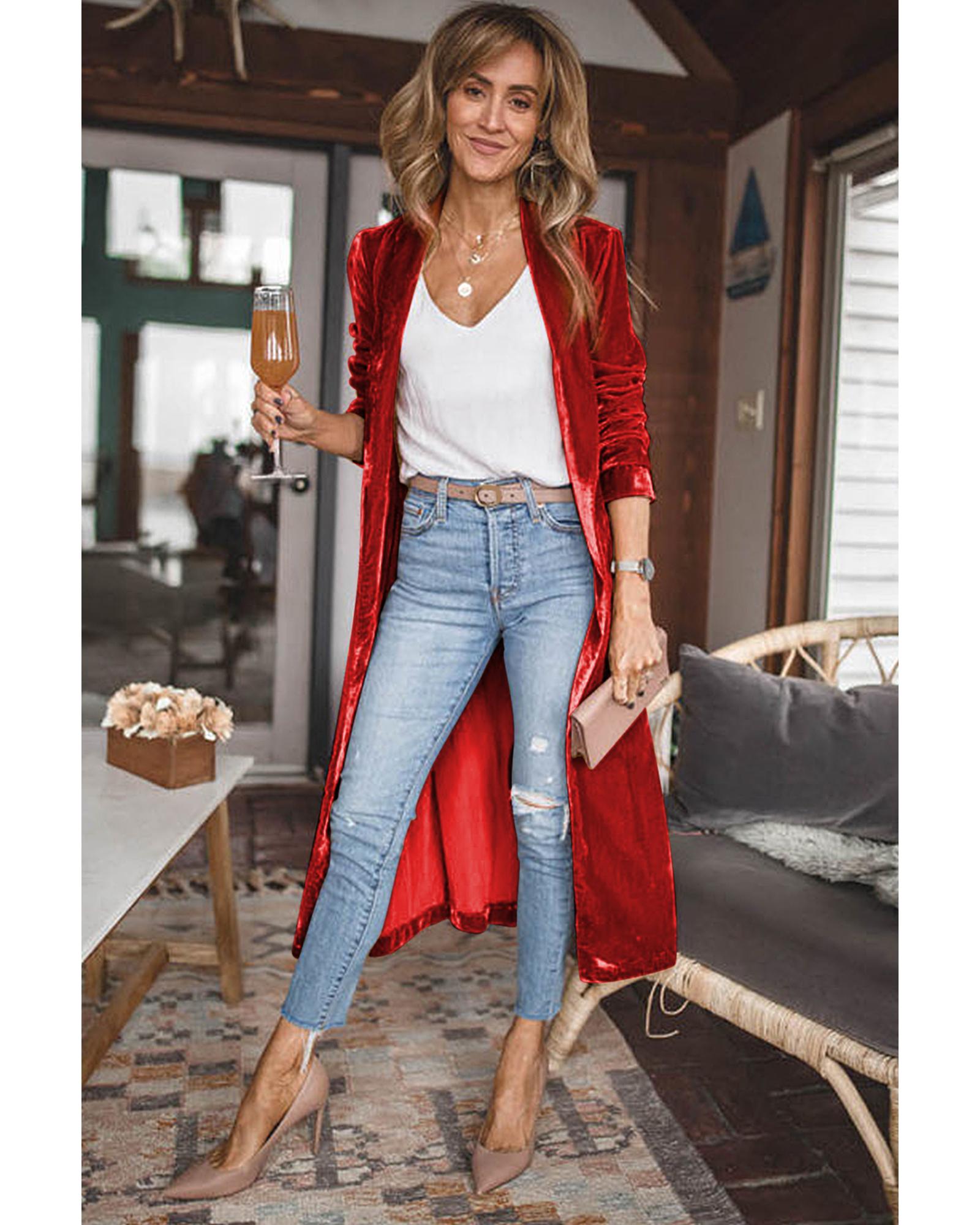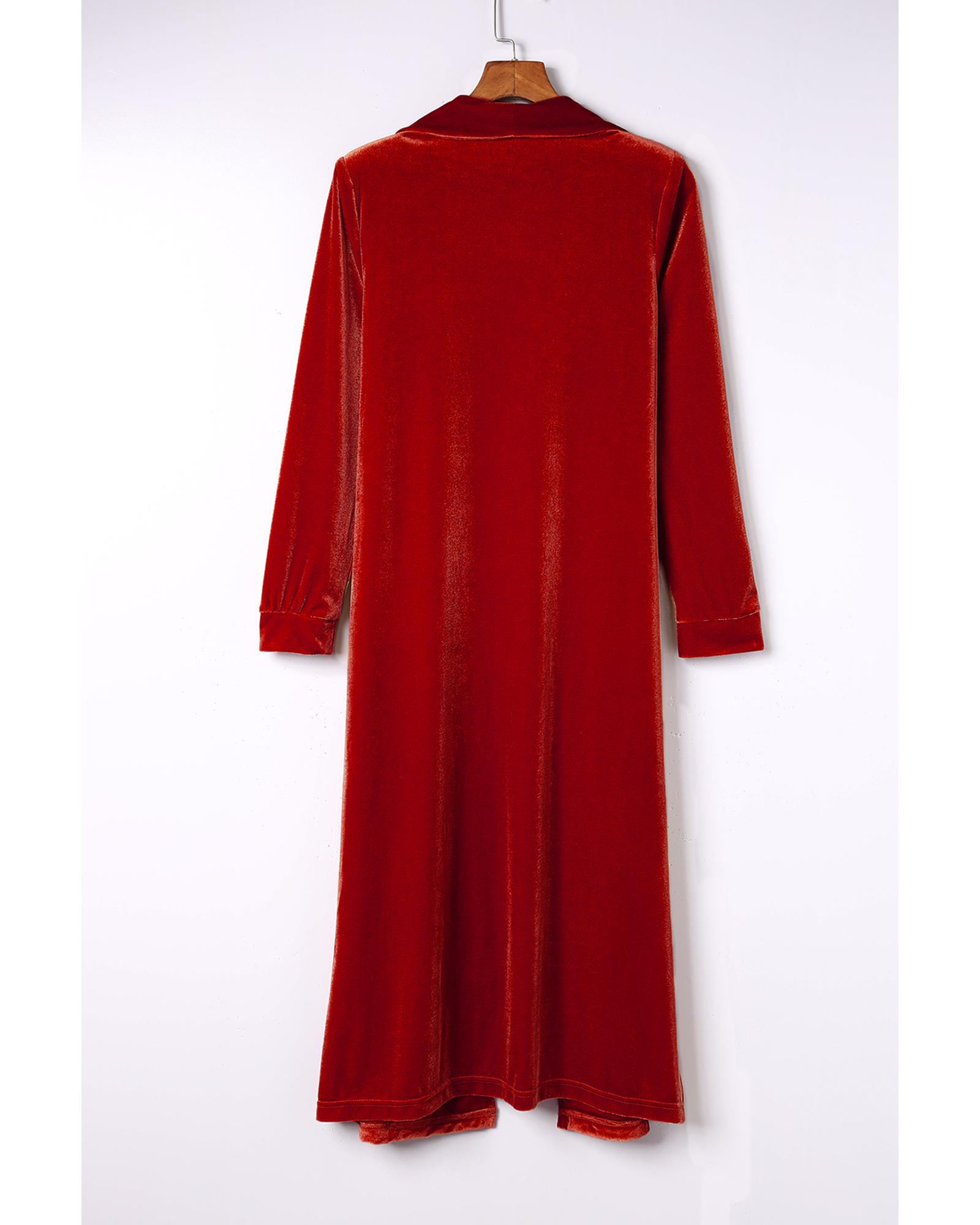Red Velvet Open Front Pocketed Long Duster – XL