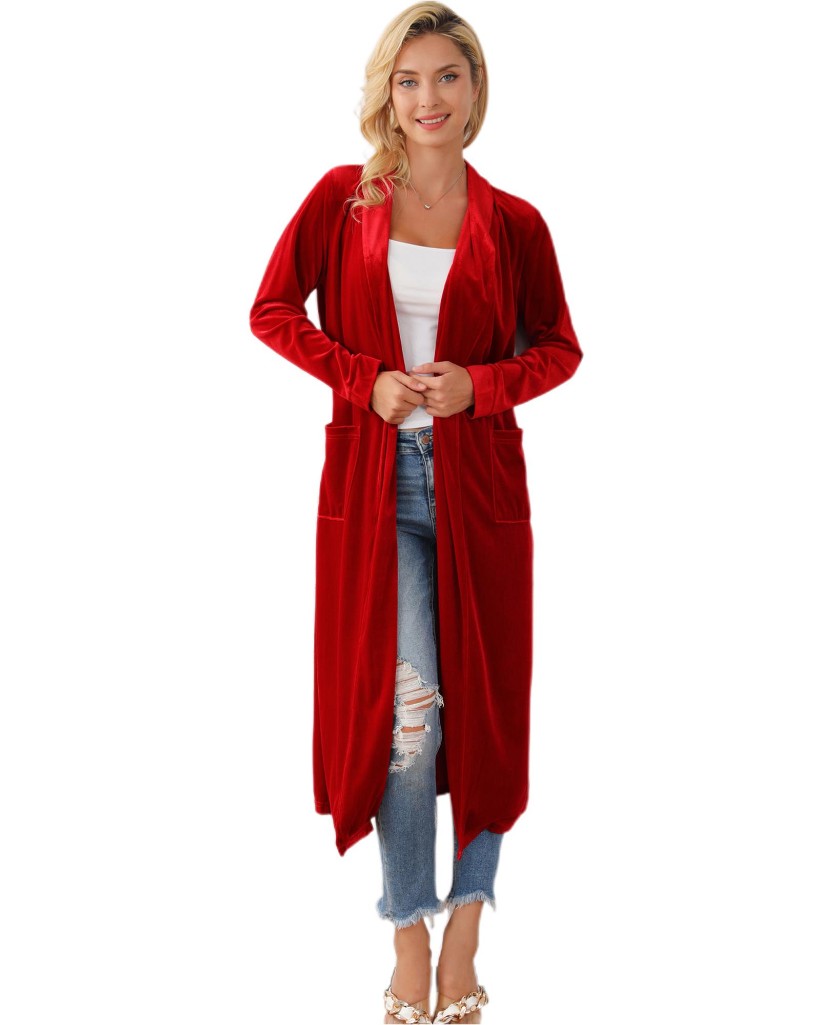 Long cardigan with open front and long sleeves Side pockets for convenience Made of soft lightweight and skin - friendly velvet fabric Perfect for cold days in spring and autumn Versatile and easy to style Available in various sizes
