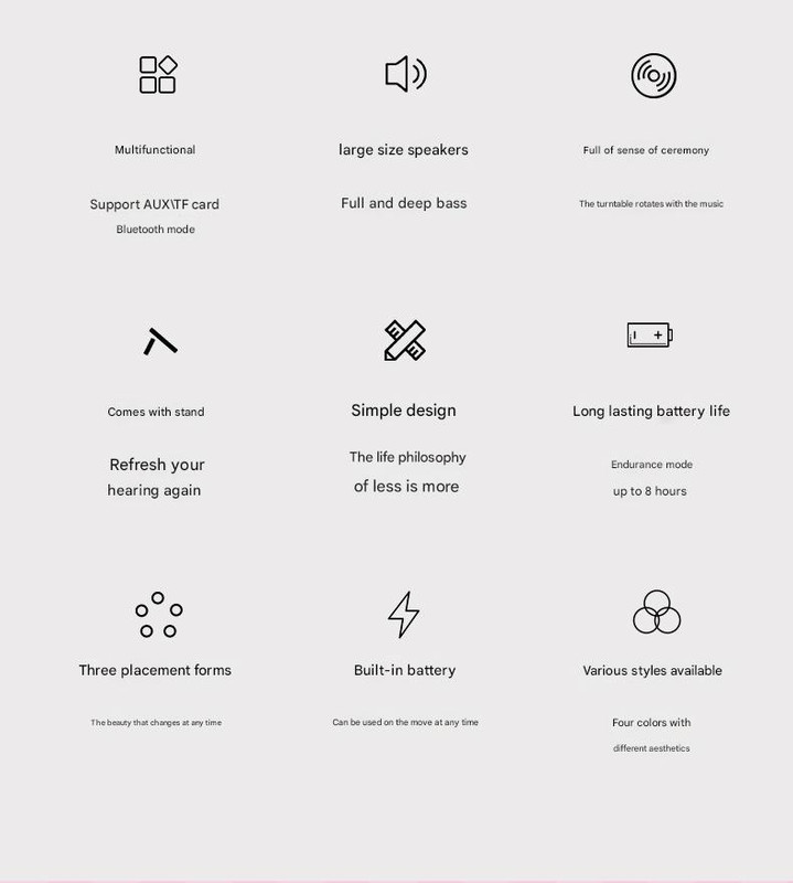 Experience a warm and cozy audio journey with this Retro Phonograph Style Bluetooth Speaker. This beautifully designed speaker embodies a “less is more” philosophy with its simple, light, and fresh aesthetic. It features a unique rotating disc that visually spins with the music, adding a captivating, ceremonial feel to your listening experience. Equipped with Bluetooth 5.3 for stable, original sound transmission up to 10 meters, it also supports AUX and TF card playback, breaking device boundaries. Enjoy rich, full-bodied sound from its large-caliber speaker, delivering satisfying bass. The built-in 1200mAh battery offers long-lasting companionship, providing up to 8 hours of continuous music from dawn till dusk. With three playback modes and multiple finish options, it��s not just the volume that rotates, but a whole interactive musical experience.