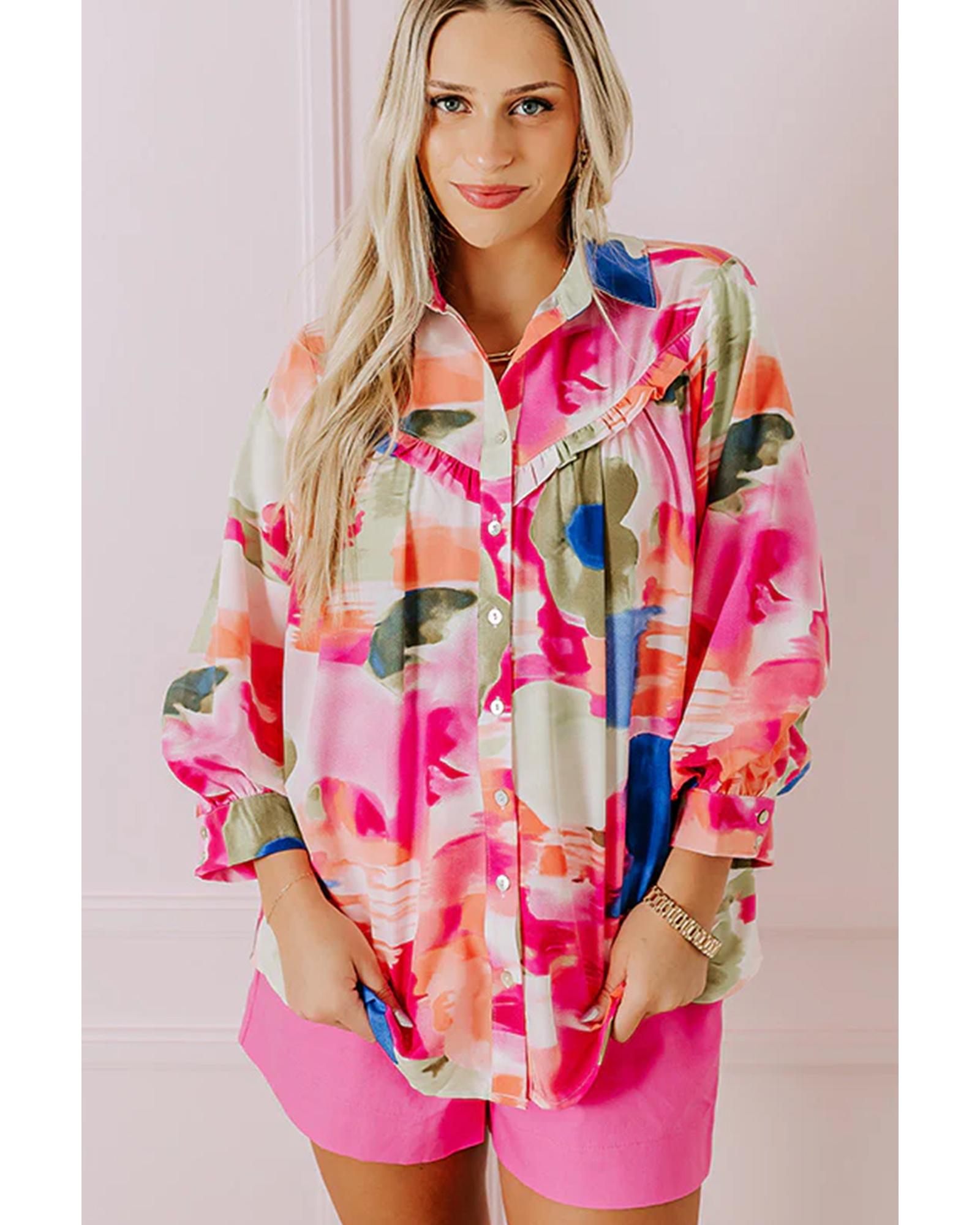 Rose Abstract Print Ruffled Puff Sleeve Shirt – M