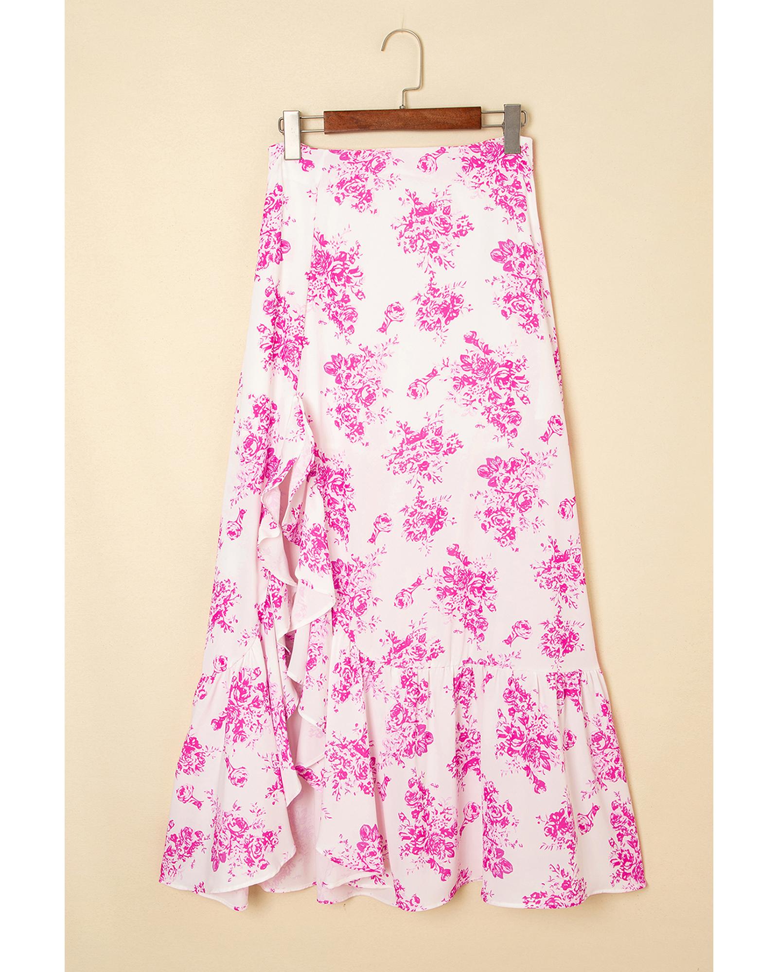 Rose Boho Floral High Waist Ruffle Split Maxi Skirt – M