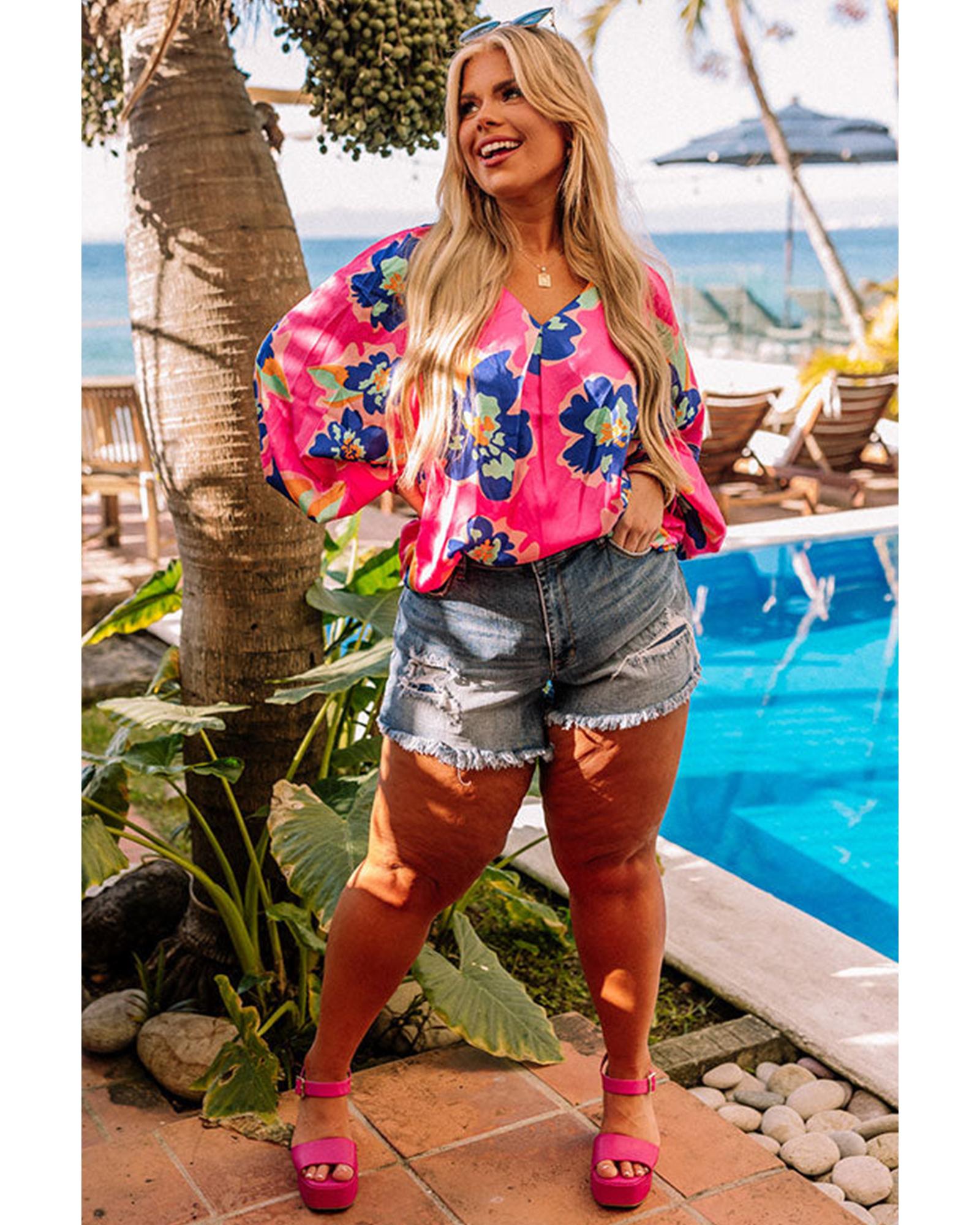 Rose Floral Pattern V Neck Balloon Sleeve Plus Size Blouse – 1X