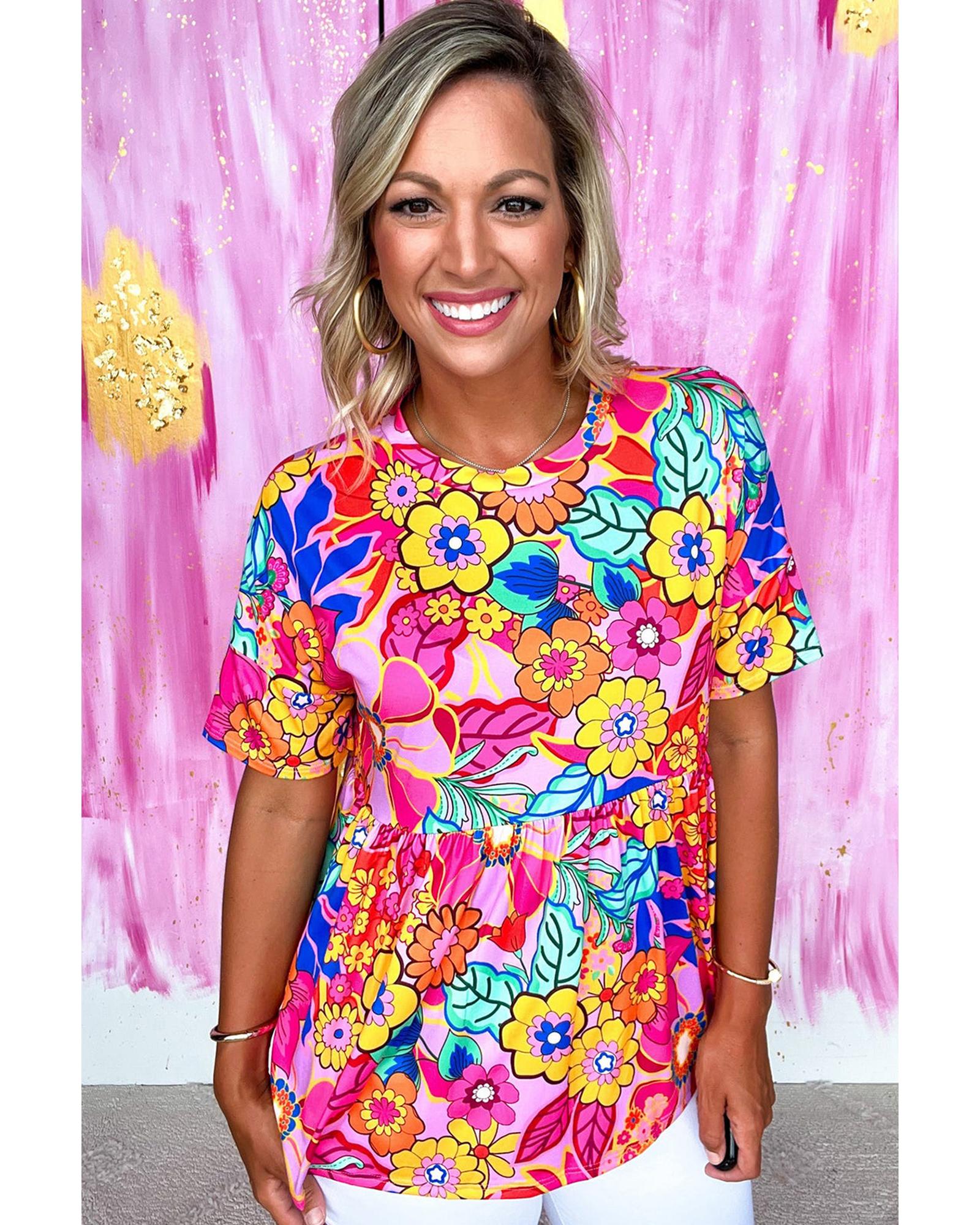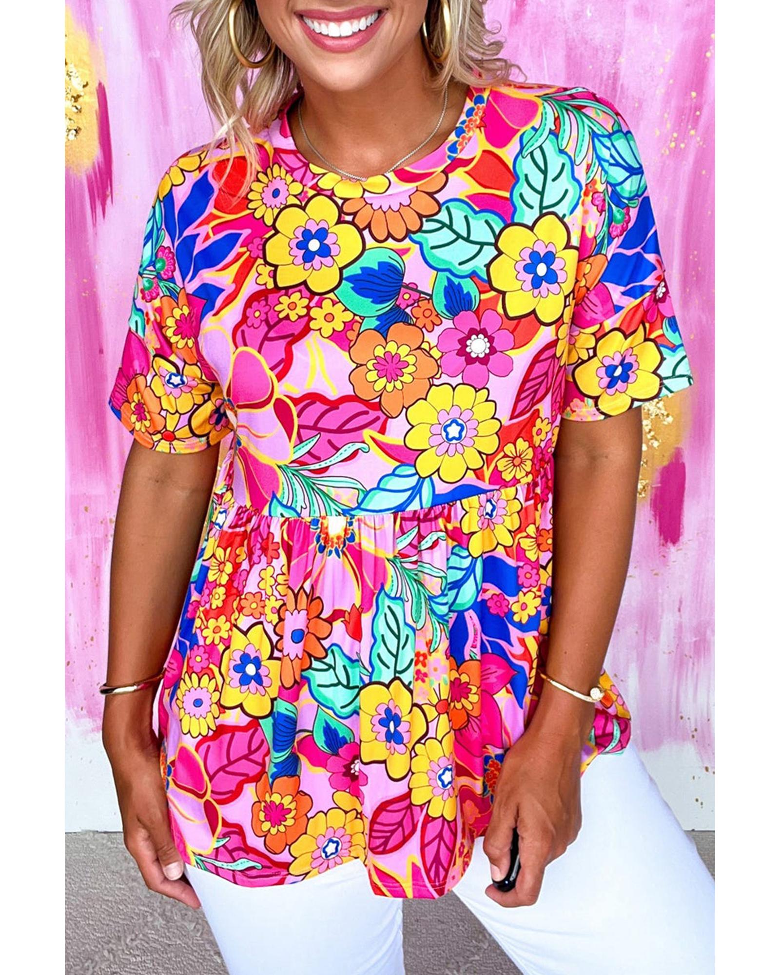 Rose Floral Print Short Sleeve Pleated Babydoll Top – S