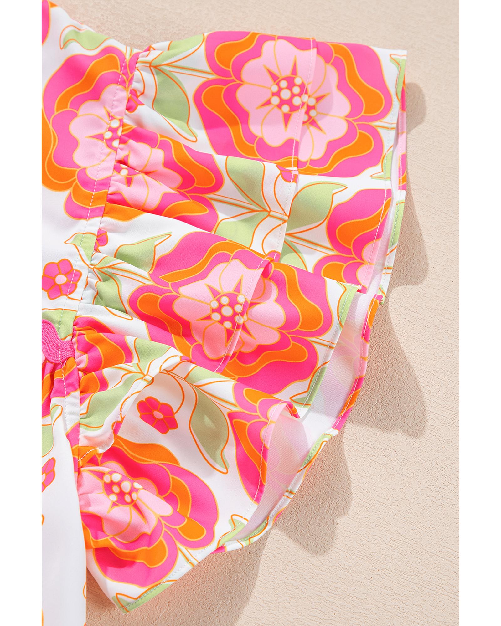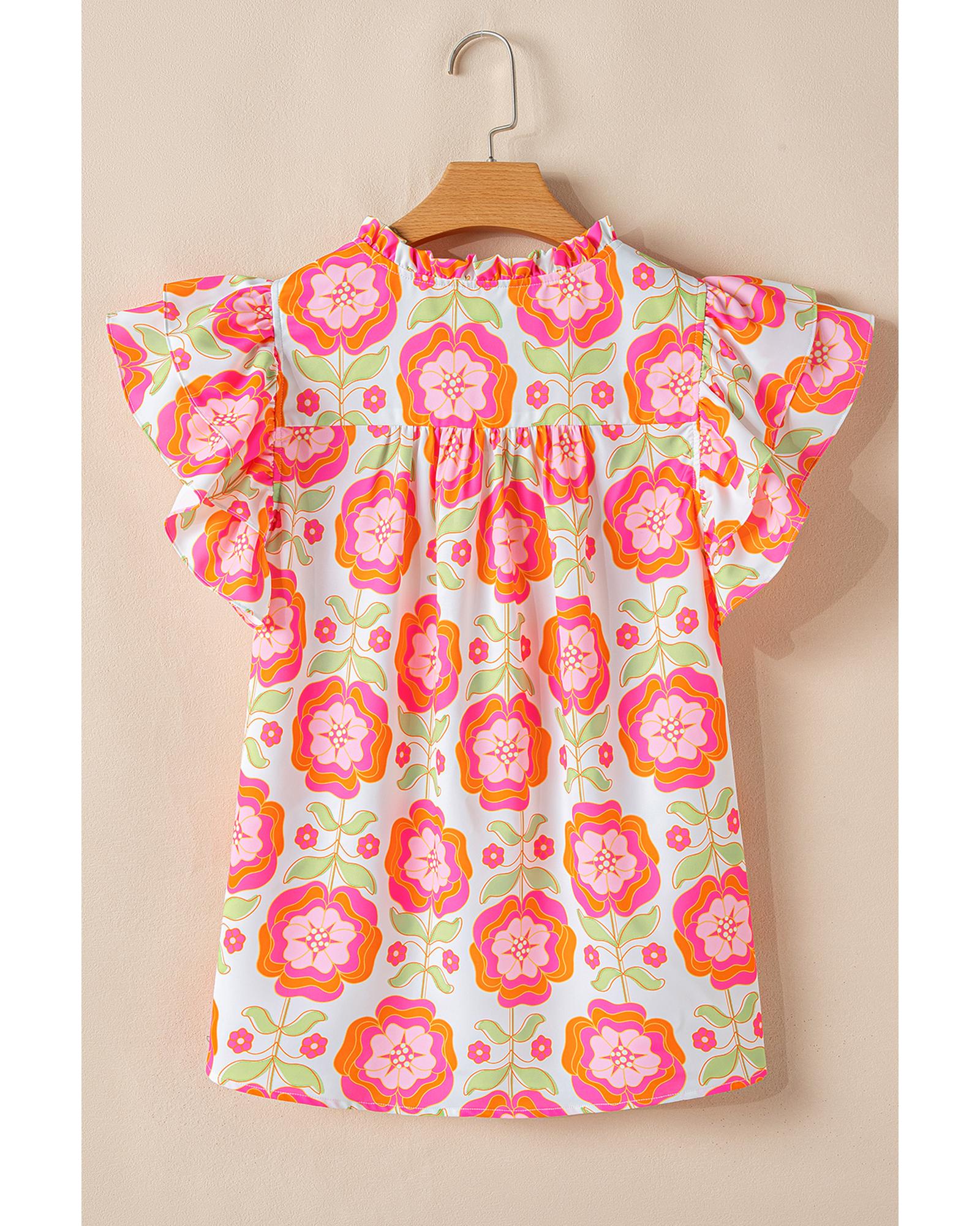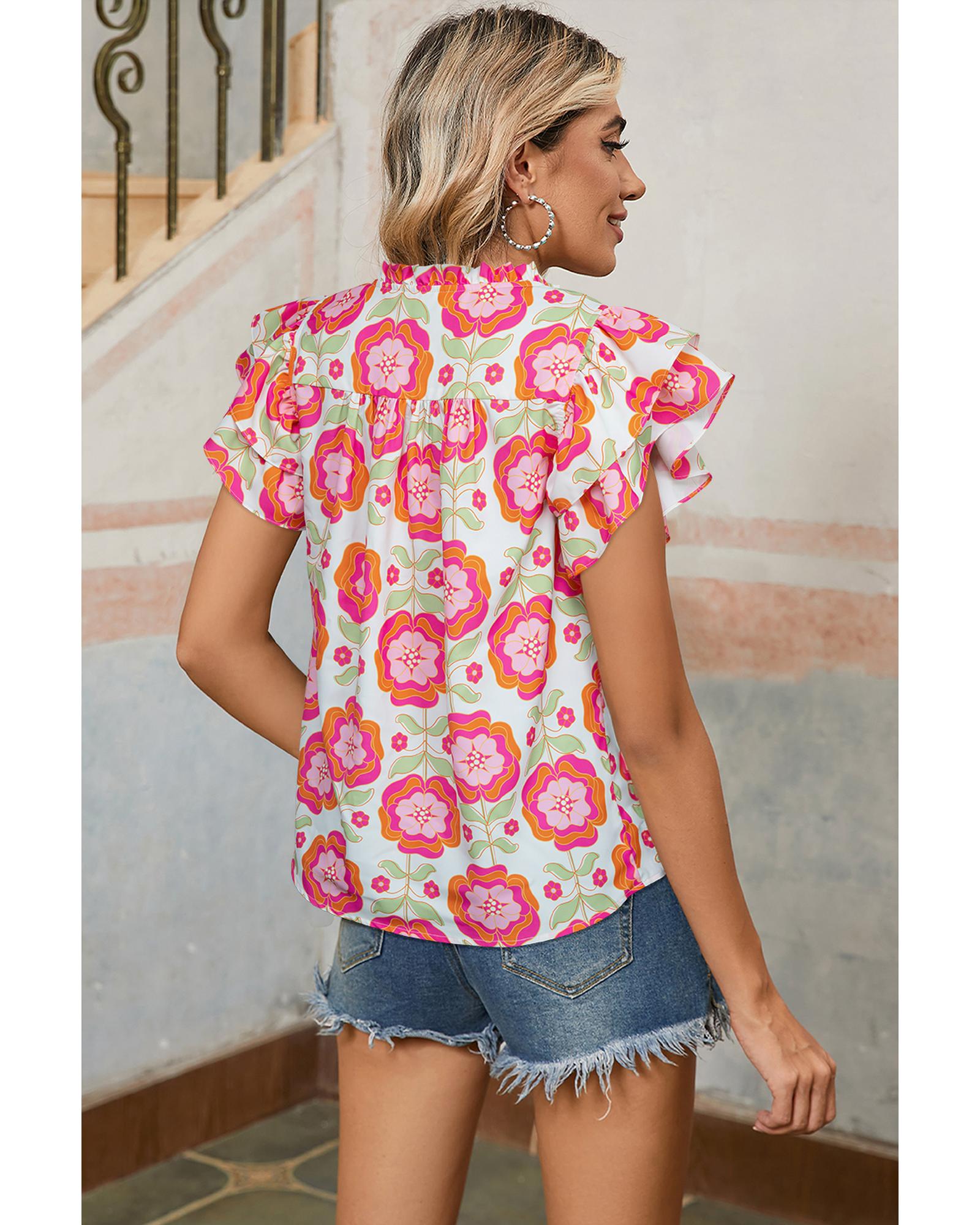 Rose Floral Ruffled Sleeve Ric-rac Trim Split Neck Loose Blouse – L