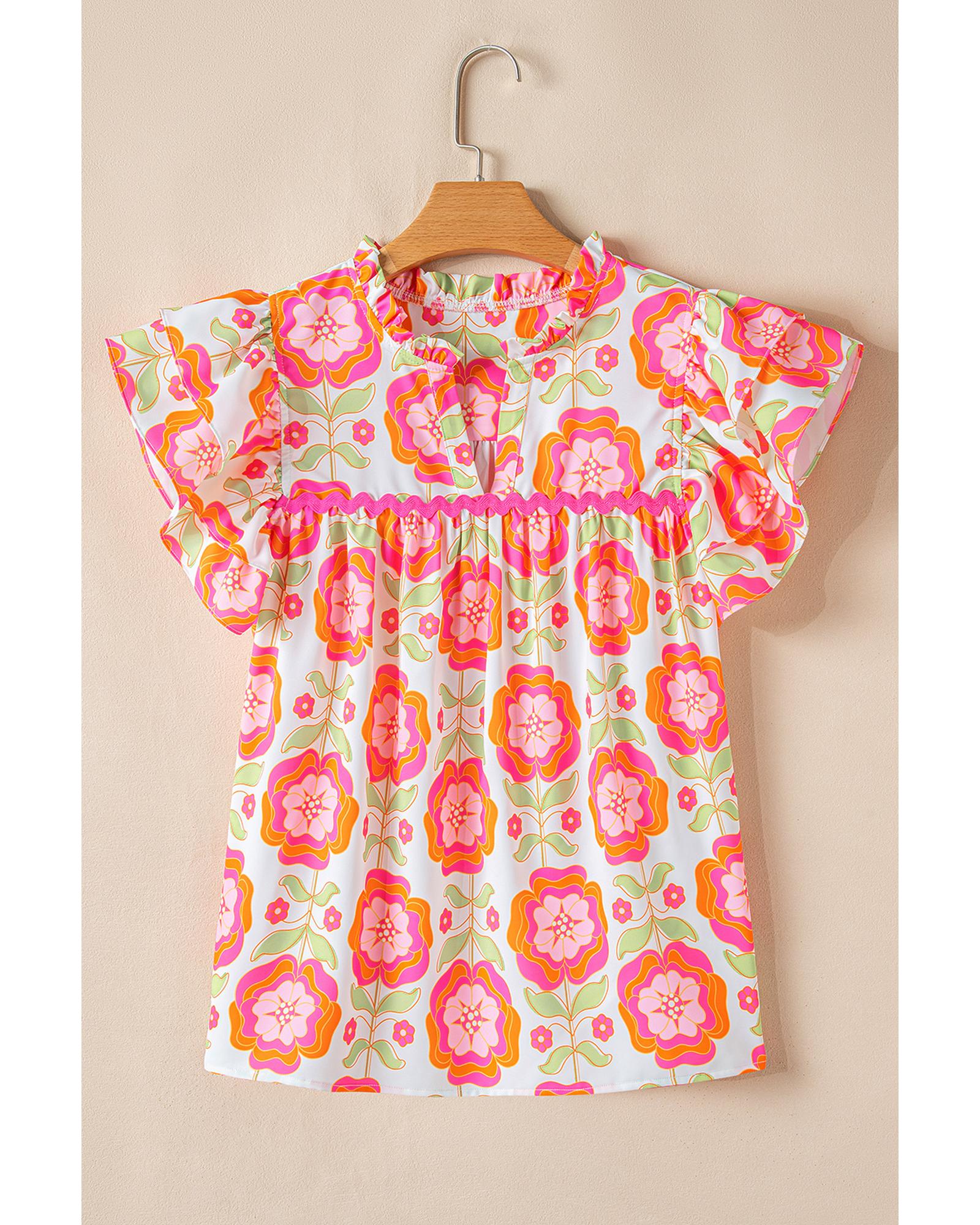 Rose Floral Ruffled Sleeve Ric-rac Trim Split Neck Loose Blouse – M