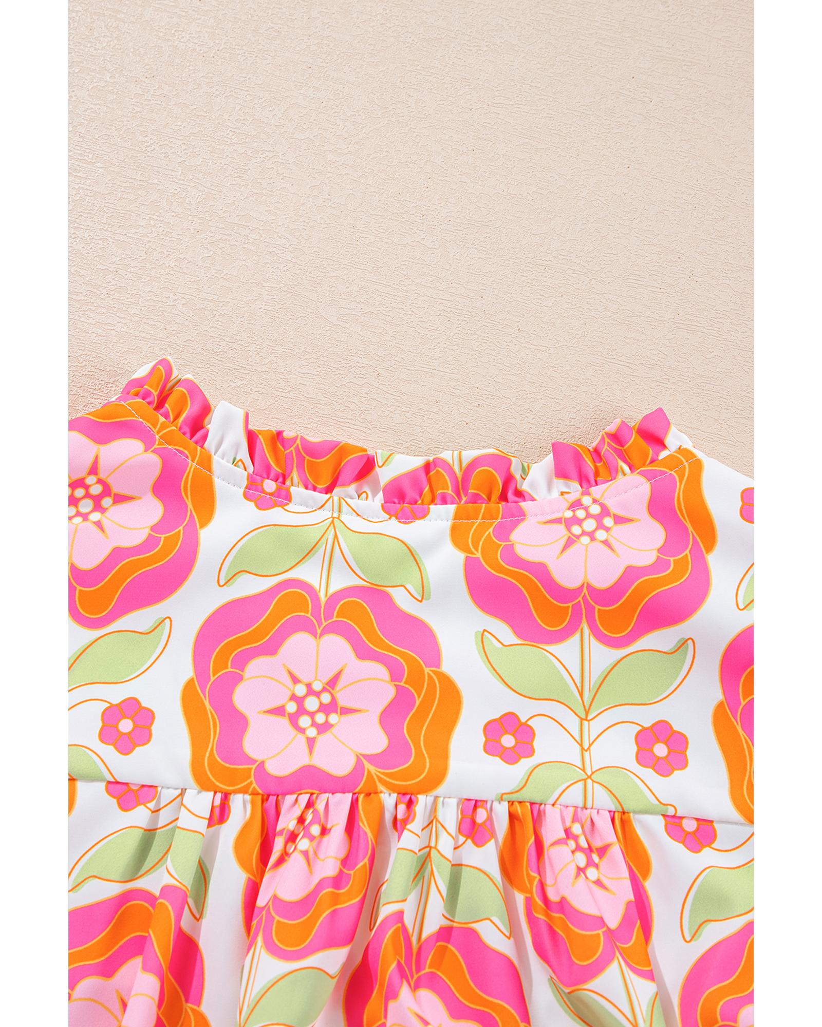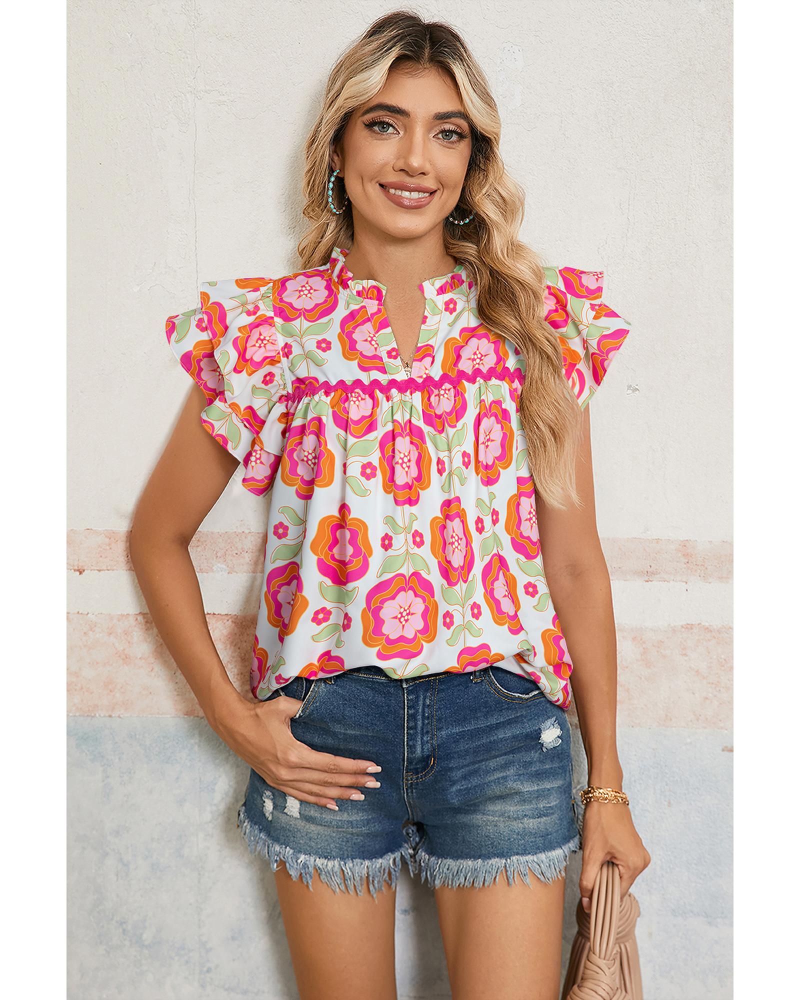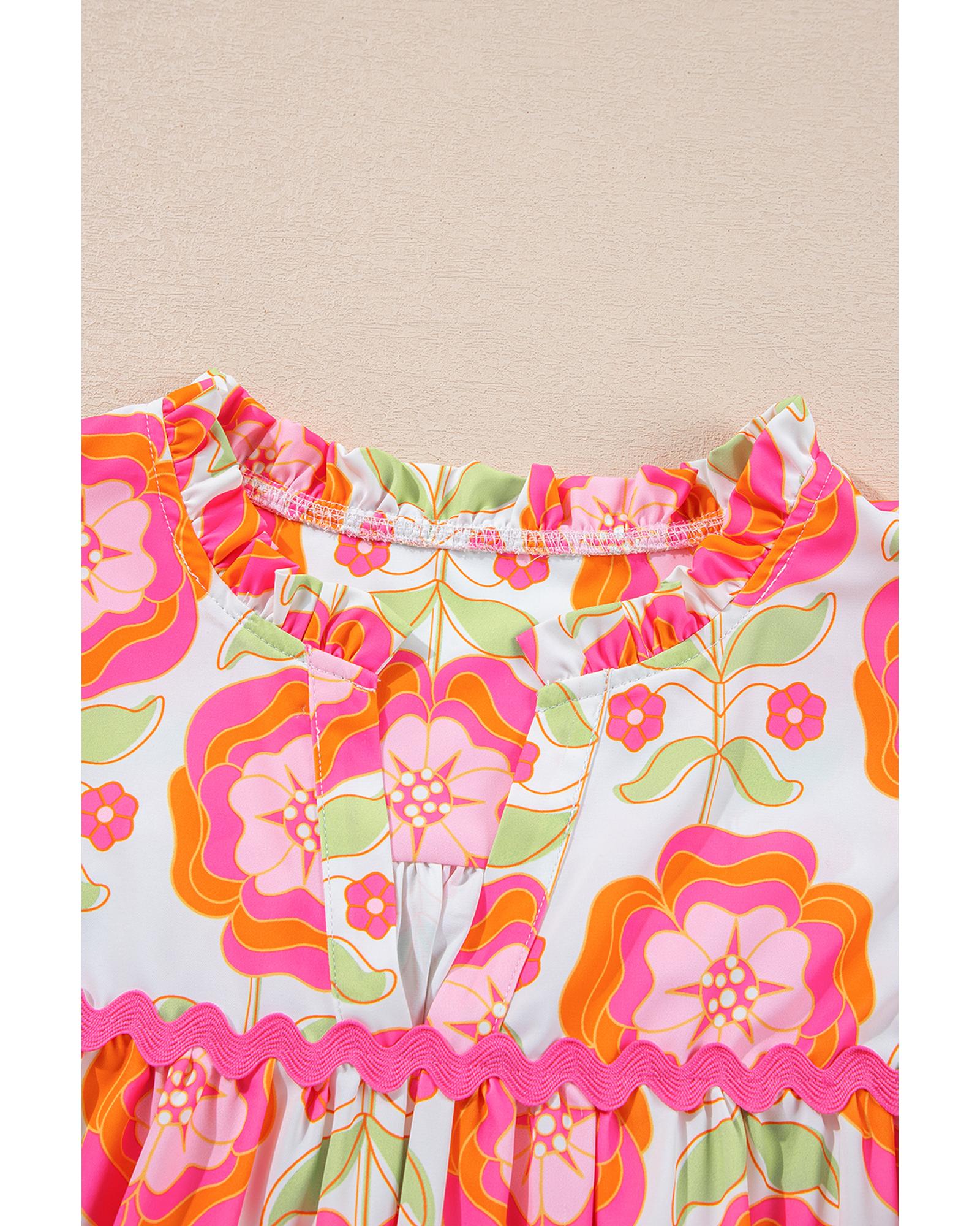 Rose Floral Ruffled Sleeve Ric-rac Trim Split Neck Loose Blouse – XL
