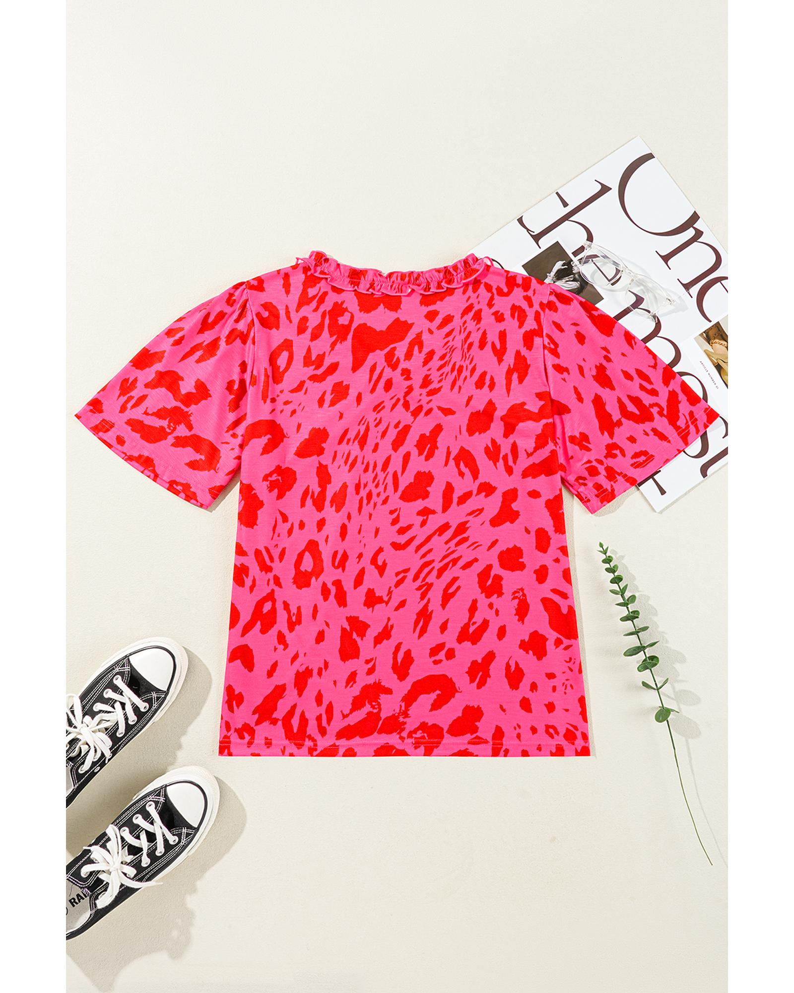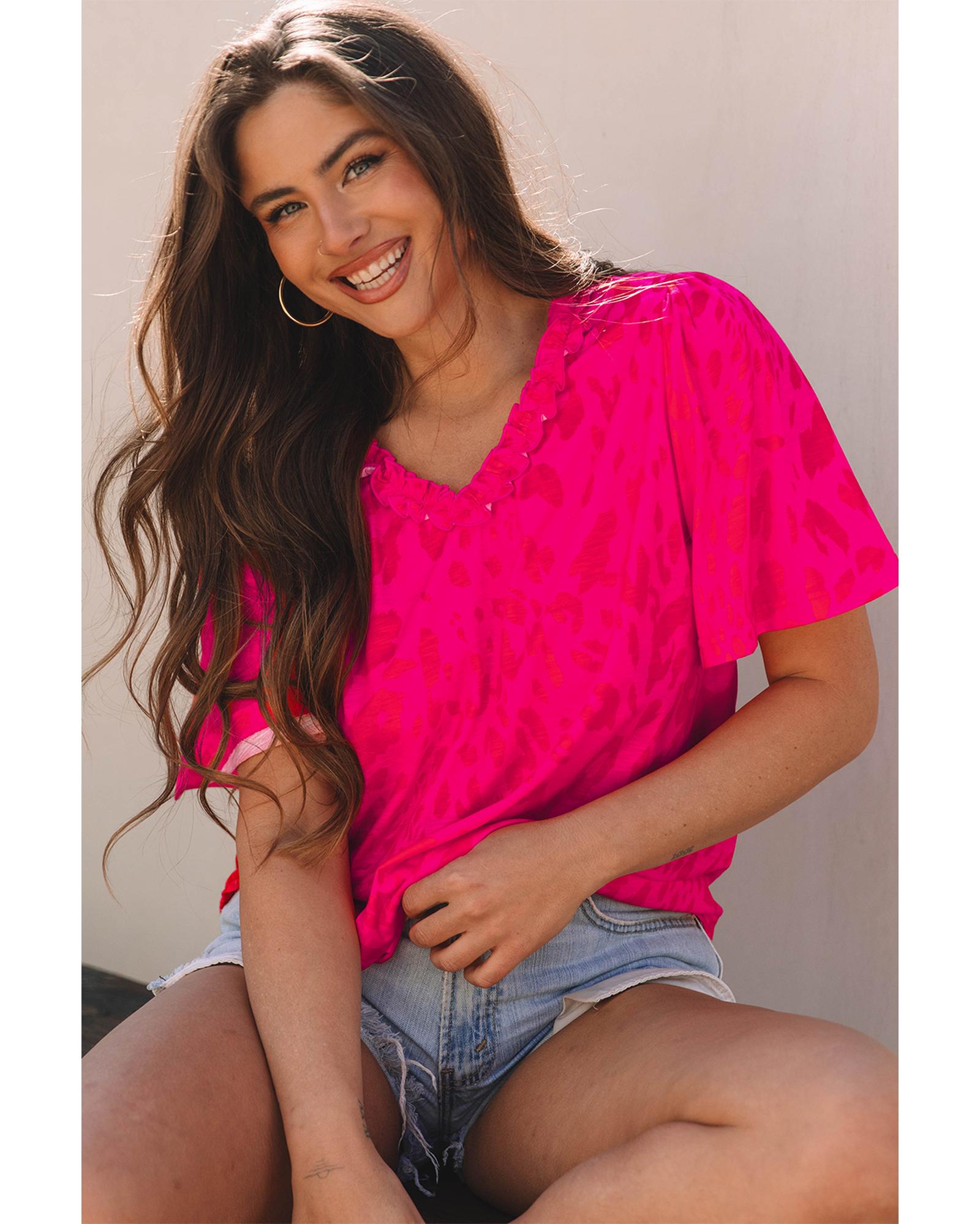 Rose Leopard Frilly V Neck Short Sleeve Blouse – L