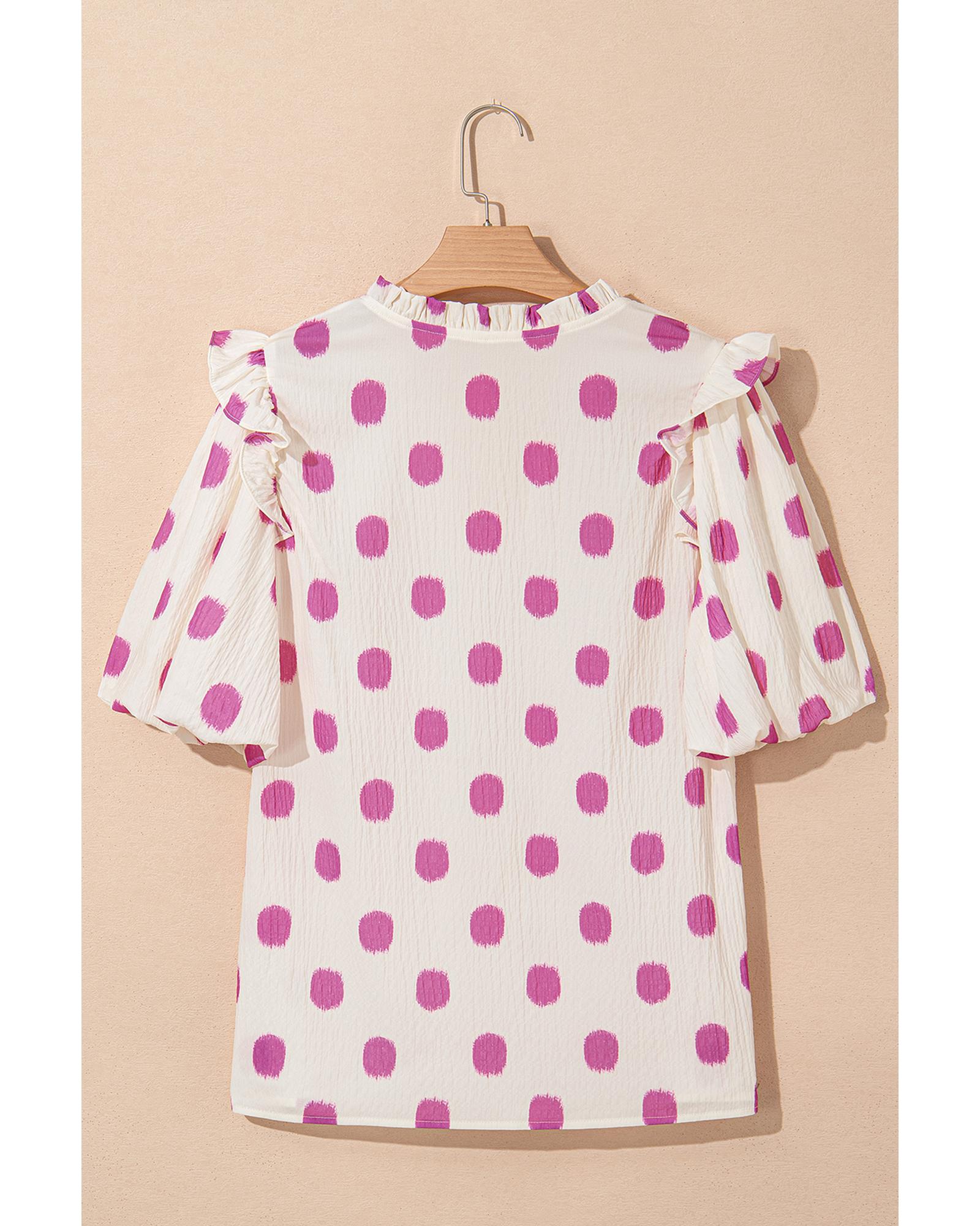 Rose Polka Dot Print Shirred Yoke Notched Neck Balloon Sleeve Blouse – S