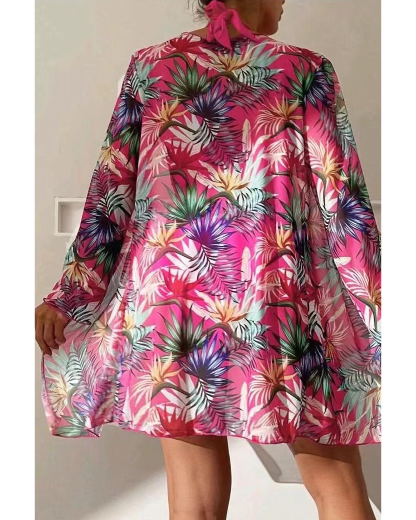 Rose Red 3pcs Tropical Contrast Trim Halter Bikini Set with Cover up – M