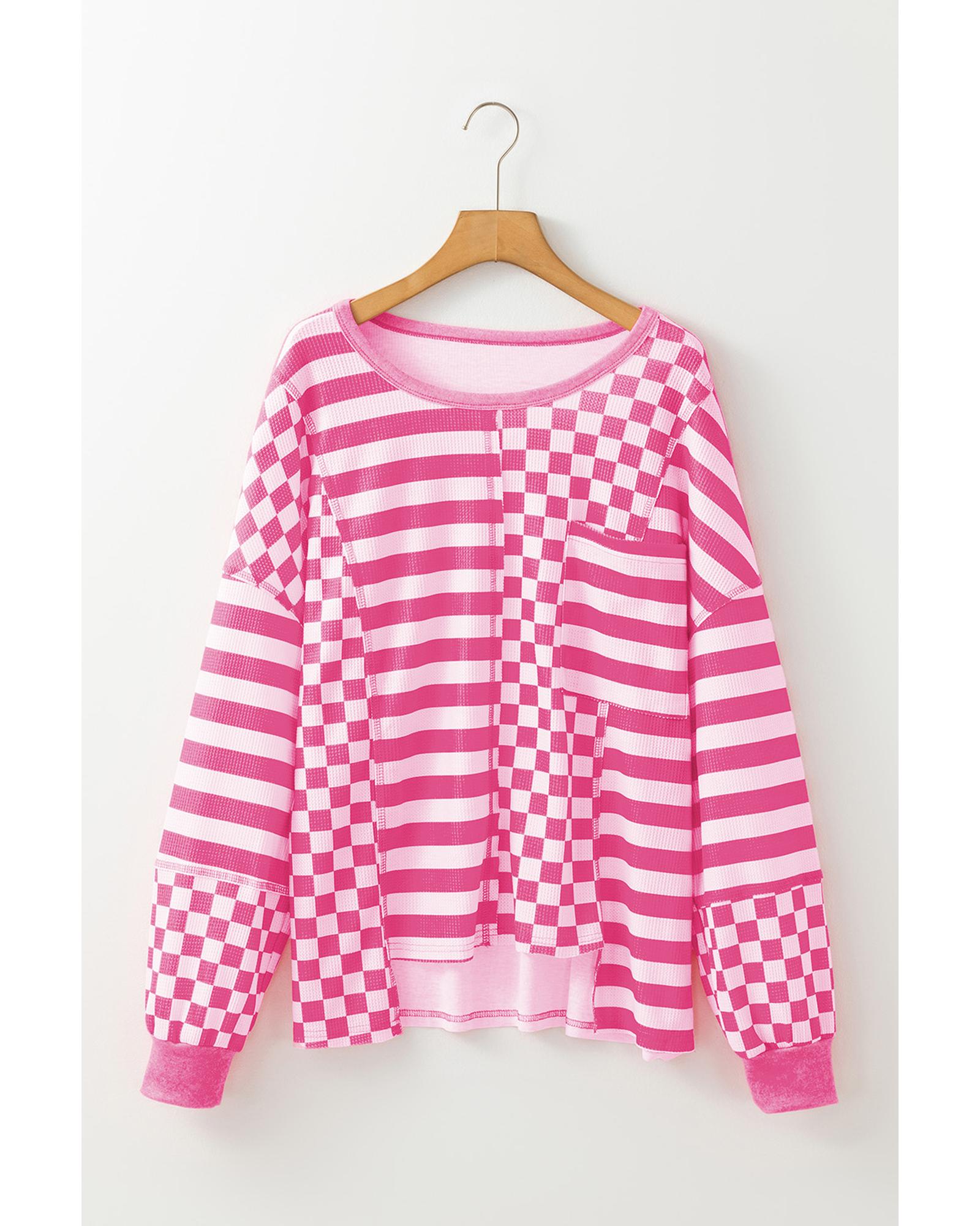 Rose Red Checkerboard Striped Patchwork Lantern Sleeve Pocketed Blouse – S