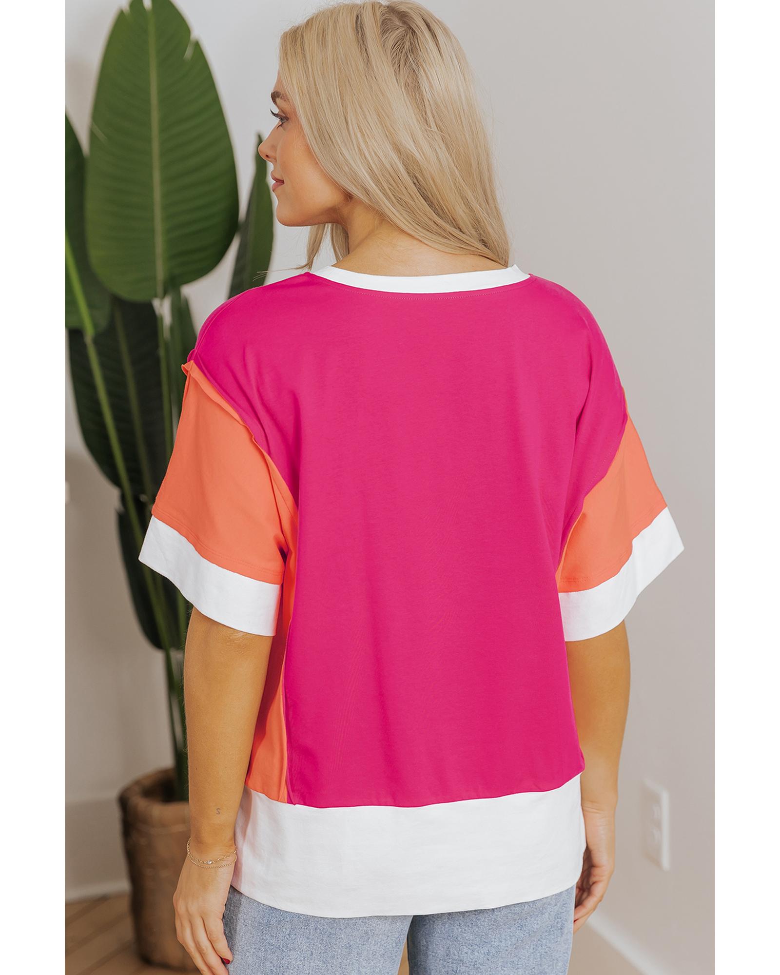 Rose Red Color Block Patchwork Side Slits Loose Fit T Shirt – XL