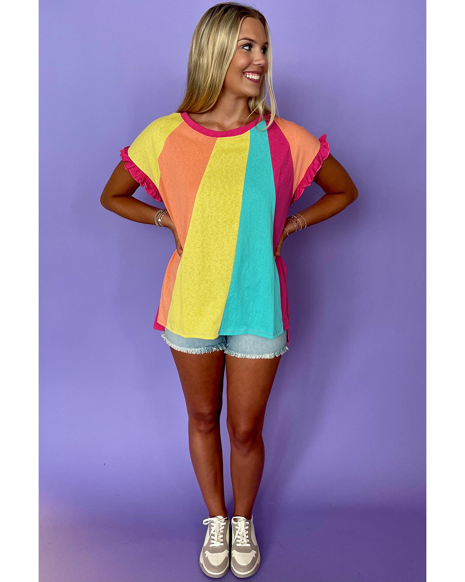 Rose Red Color Block Ruffled Crew Neck Loose Fit T Shirt – L