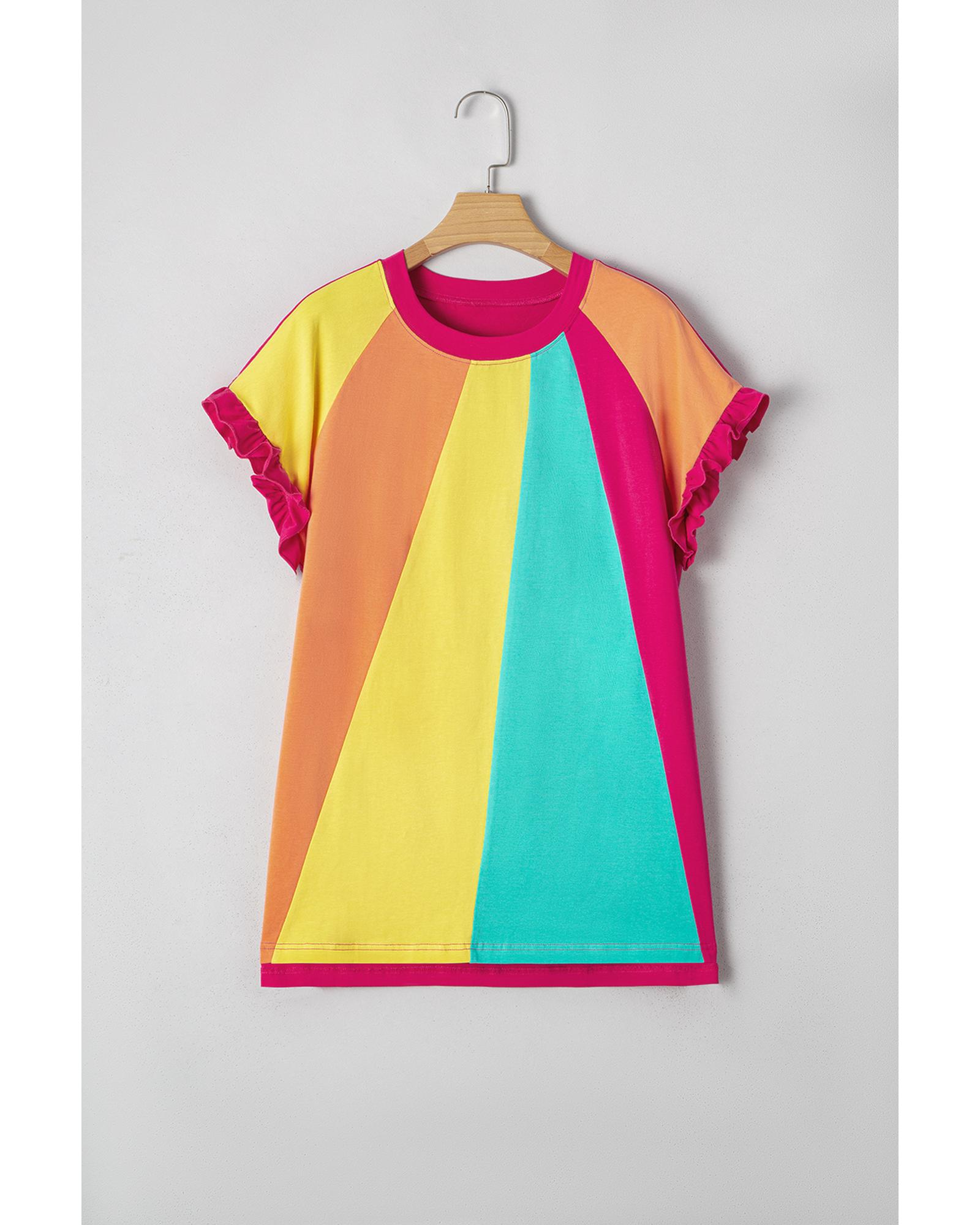 Rose Red Color Block Ruffled Crew Neck Loose Fit T Shirt – S