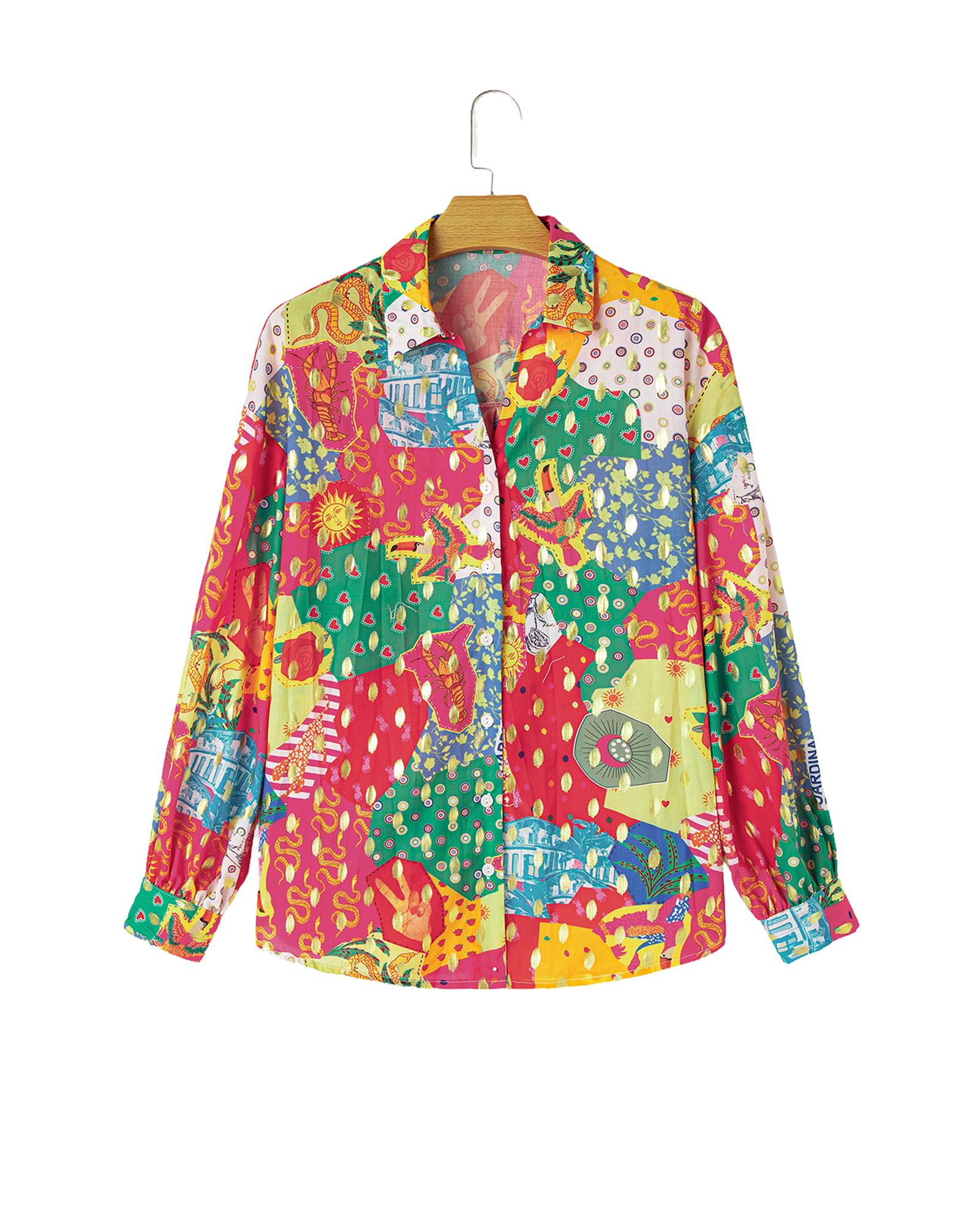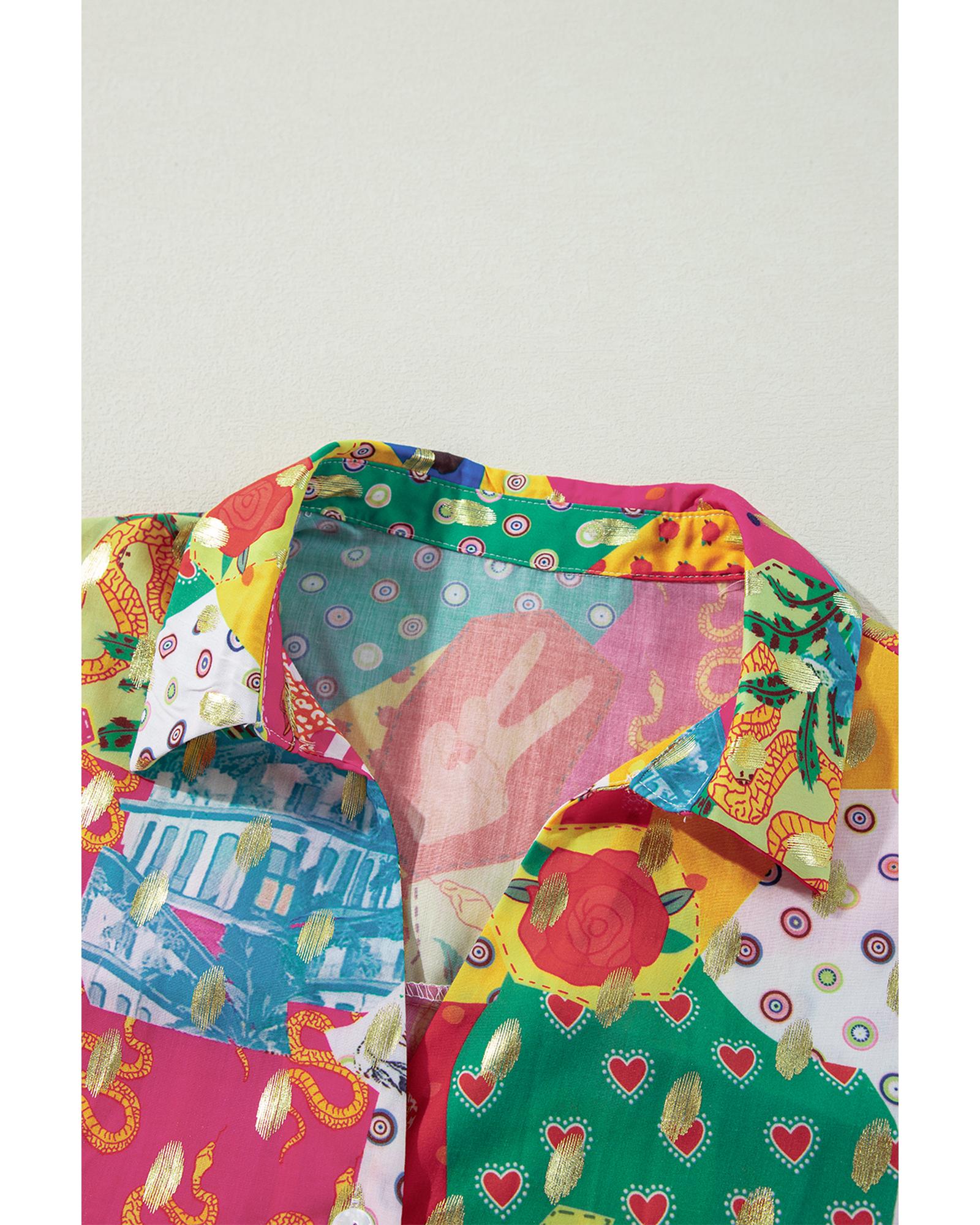 Rose Red Colorblock Abstract Print Button up Loose Shirt – M