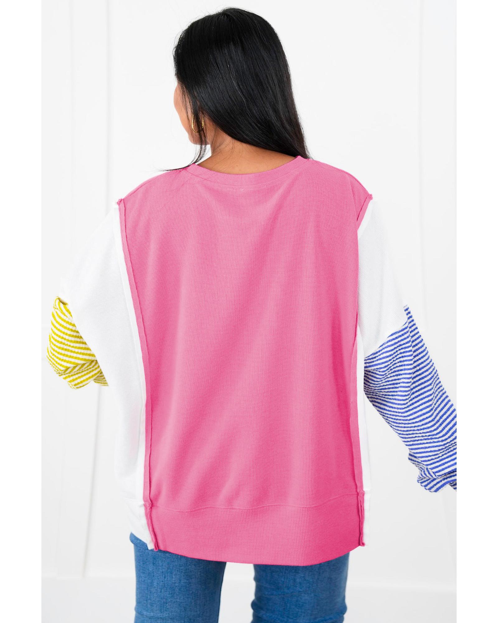 Rose Red Colorblock Patchwork Striped Puff Sleeve Plus Size Top with Slits – 4X