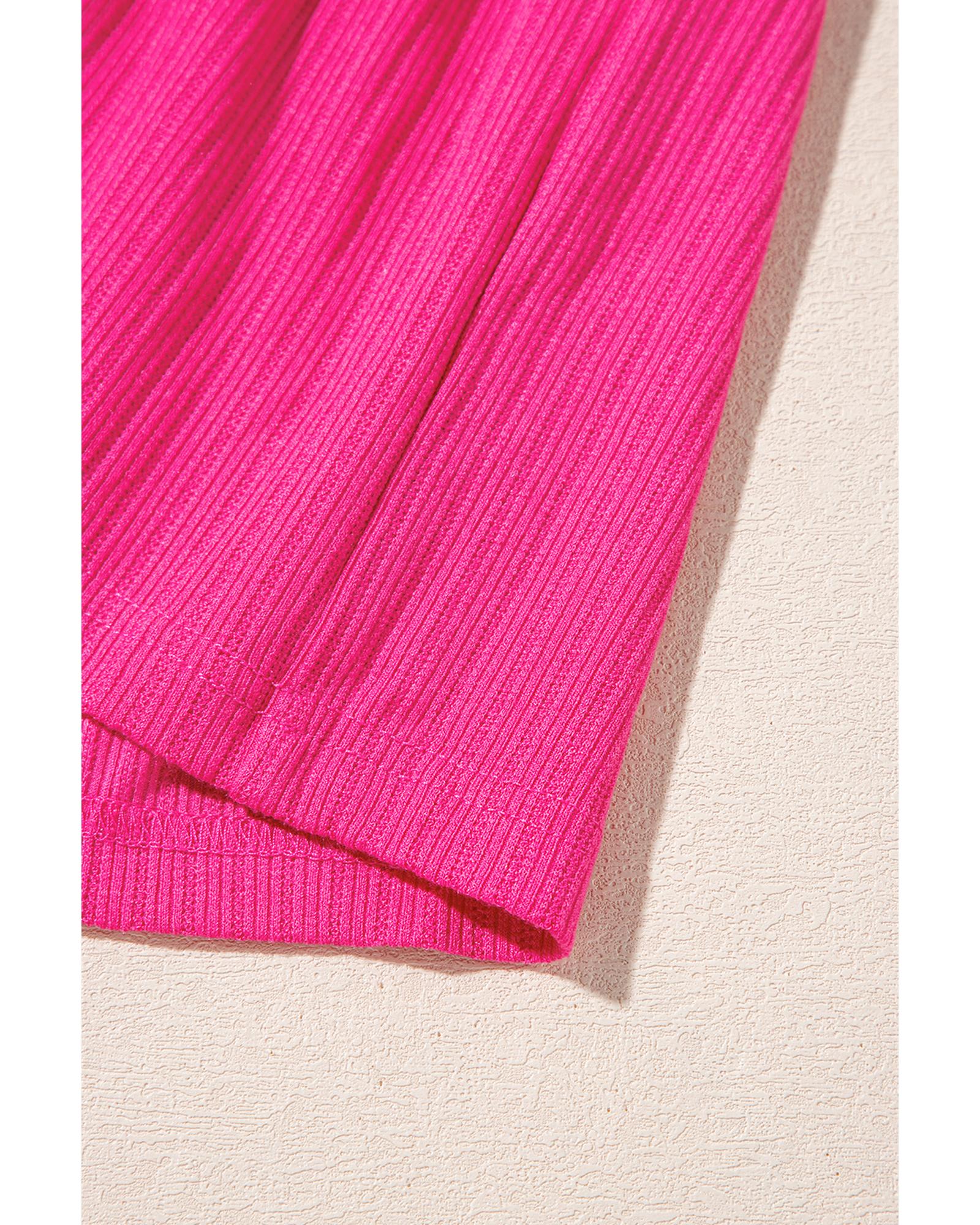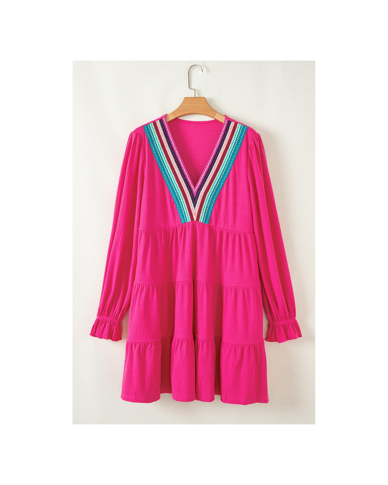 Rose Red Colorful Crochet V Neck Textured Tiered Ruffled Long Sleeve Mini Dress – L