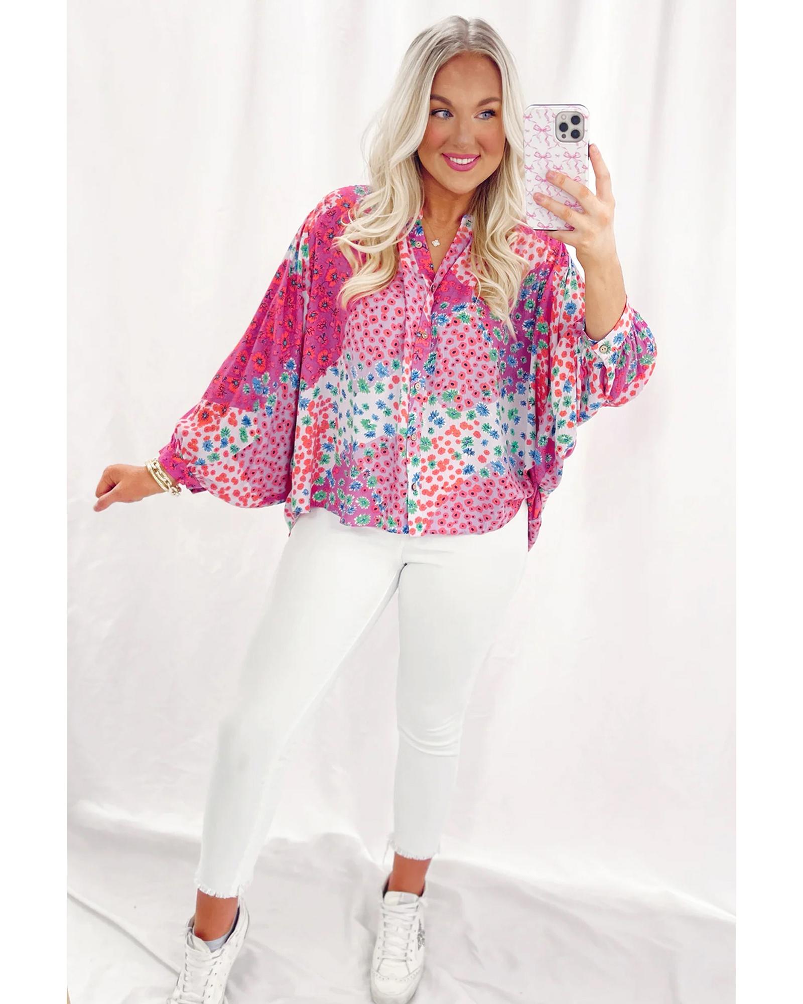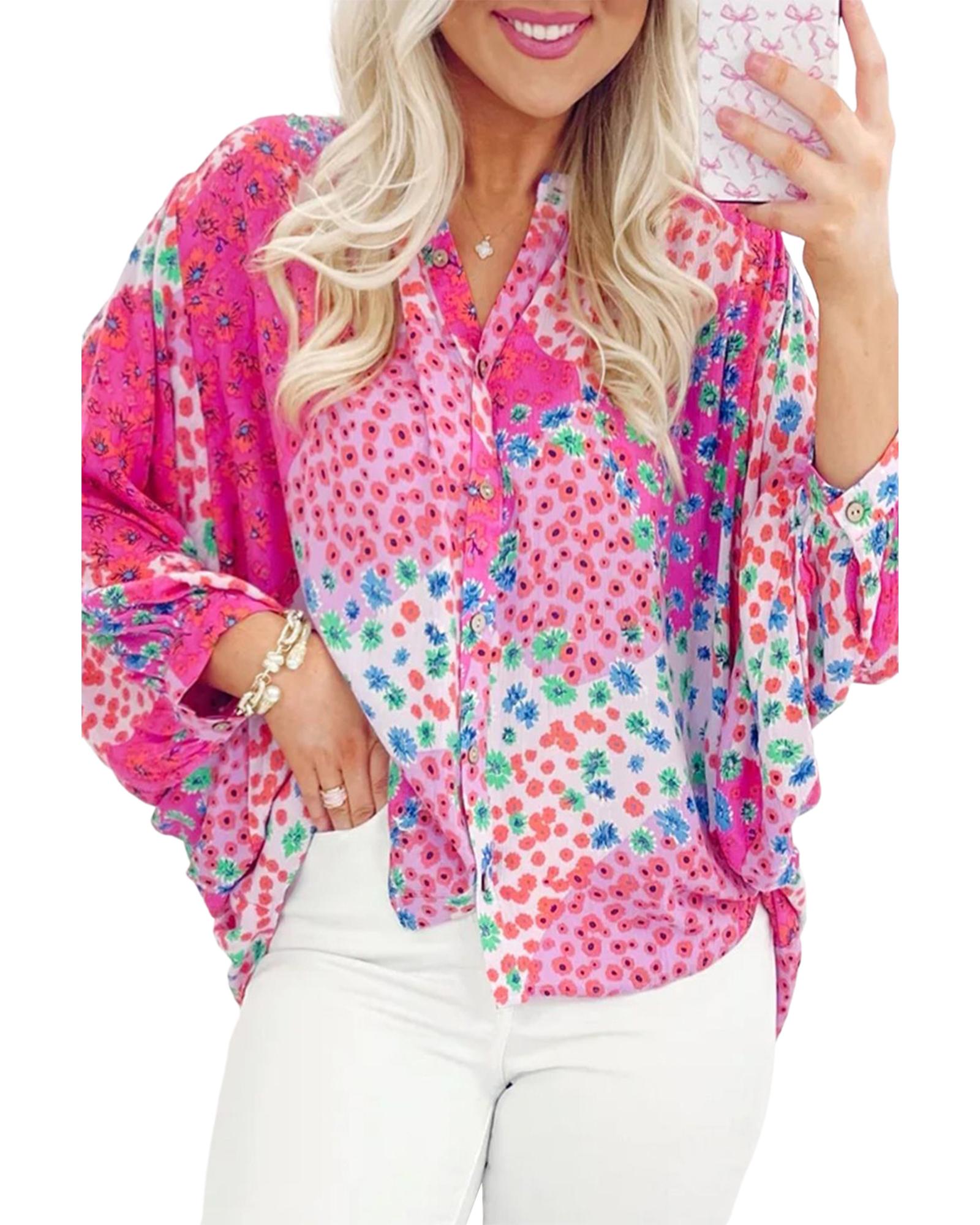 Rose Red Floral Allover Print Buttoned V Neck Oversized Shirt – M
