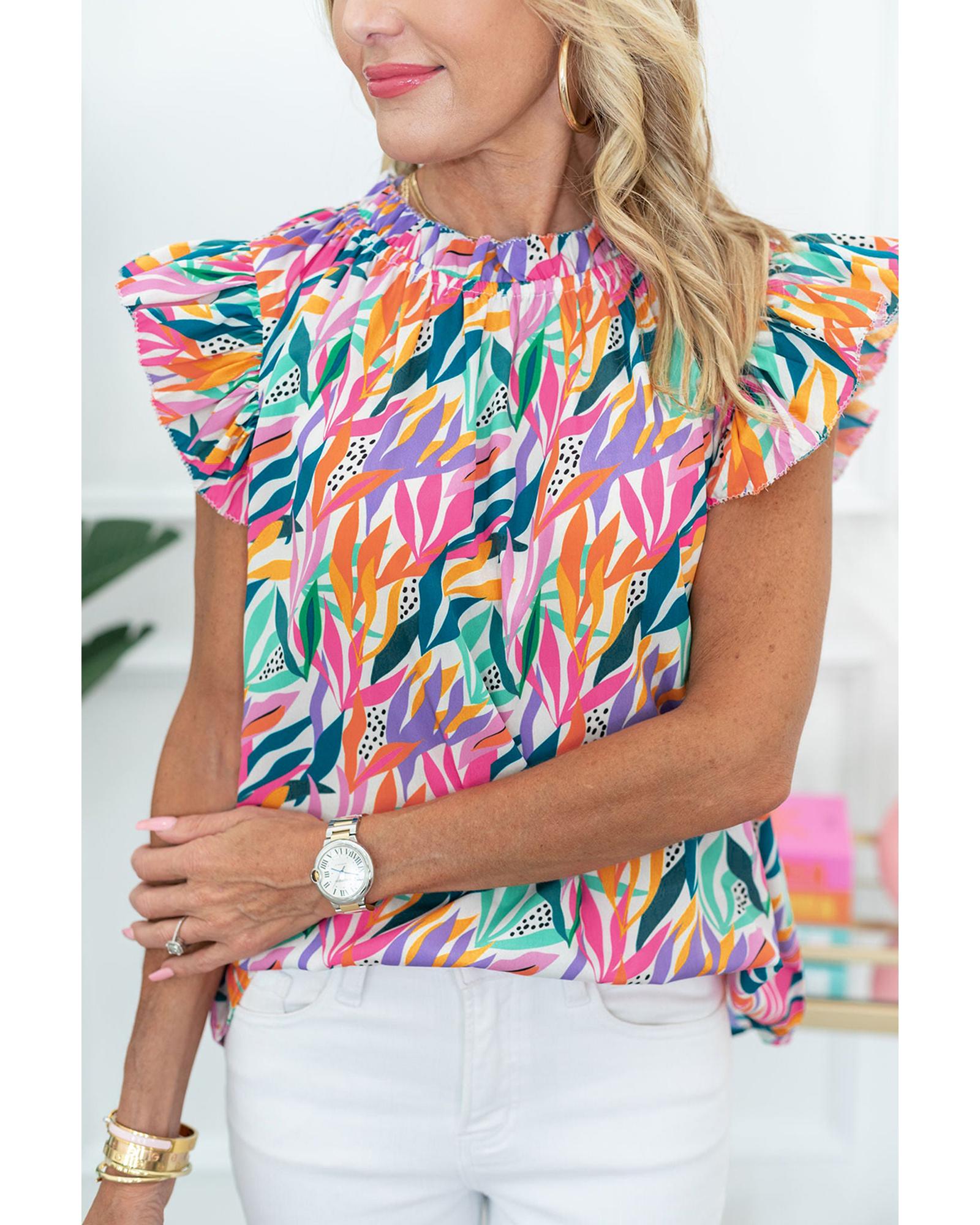 Rose Red Floral Print Ruffled Flutter Sleeve Blouse – L