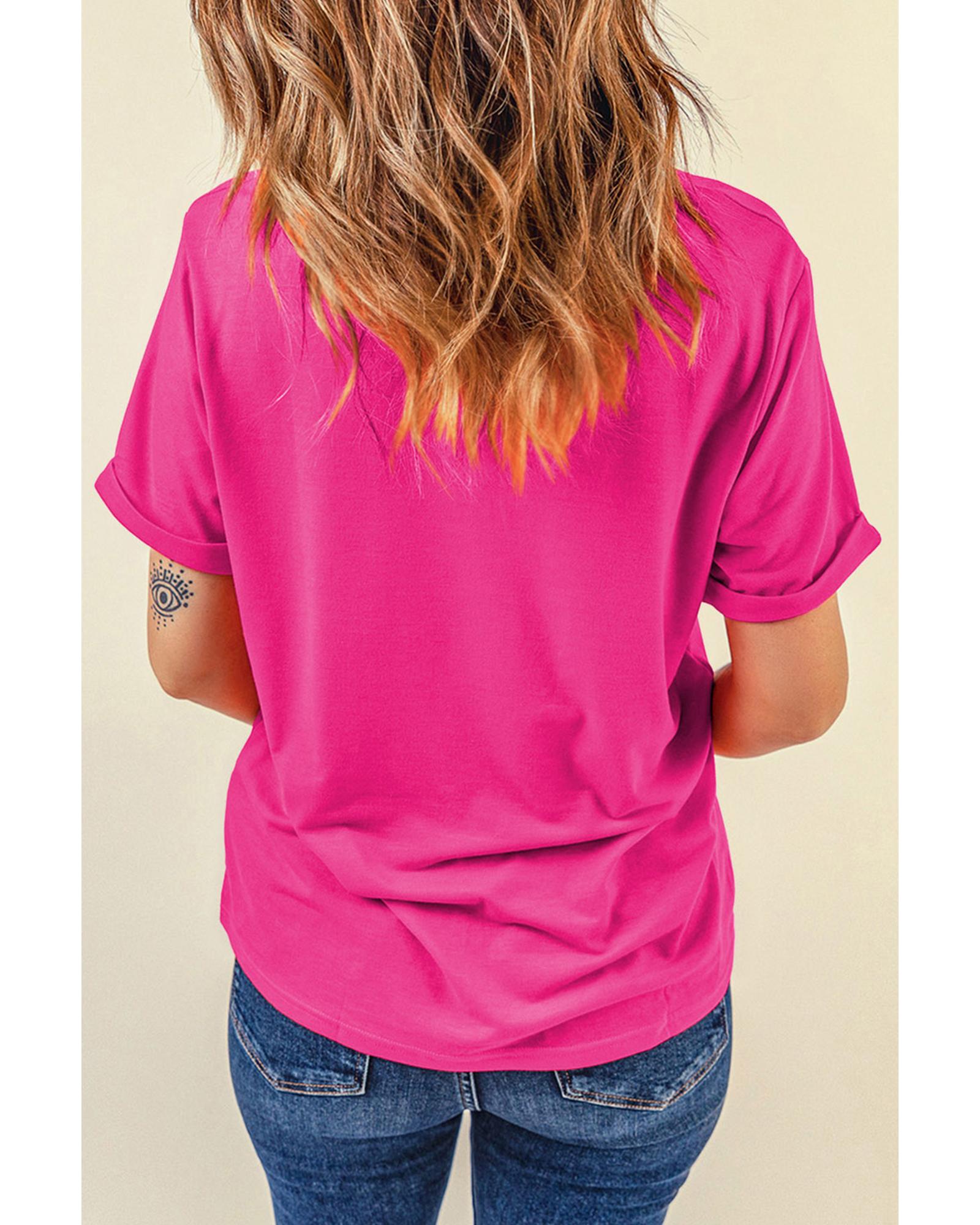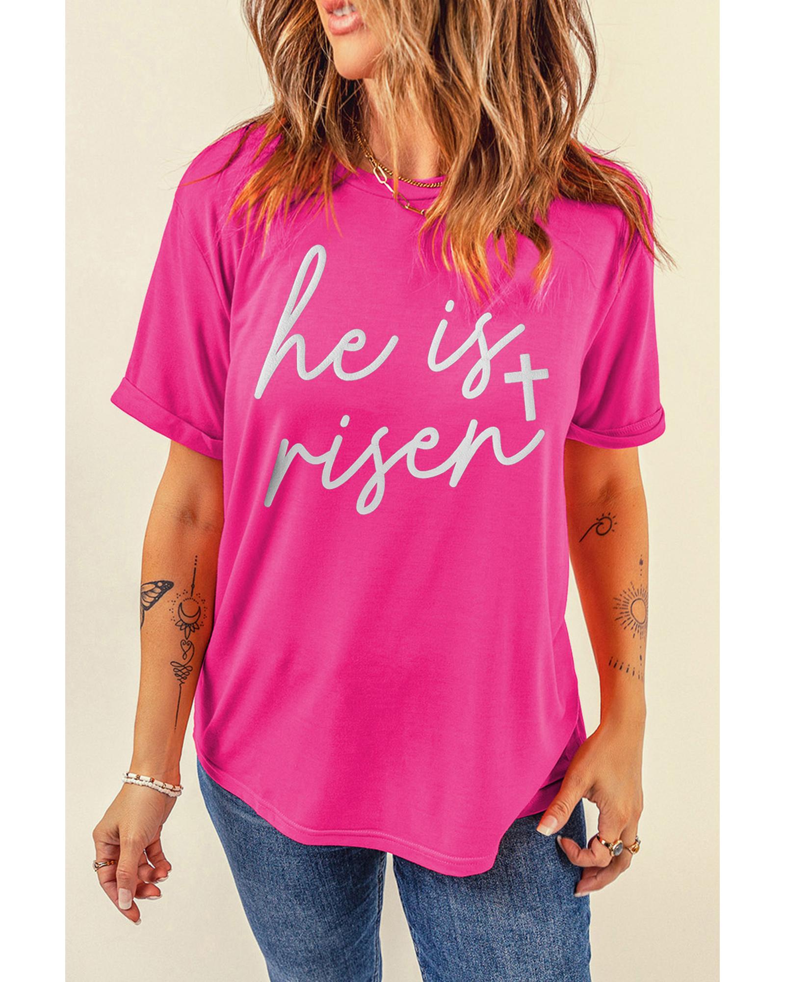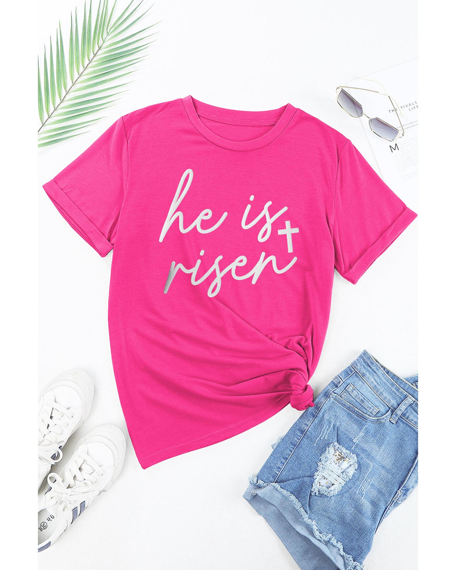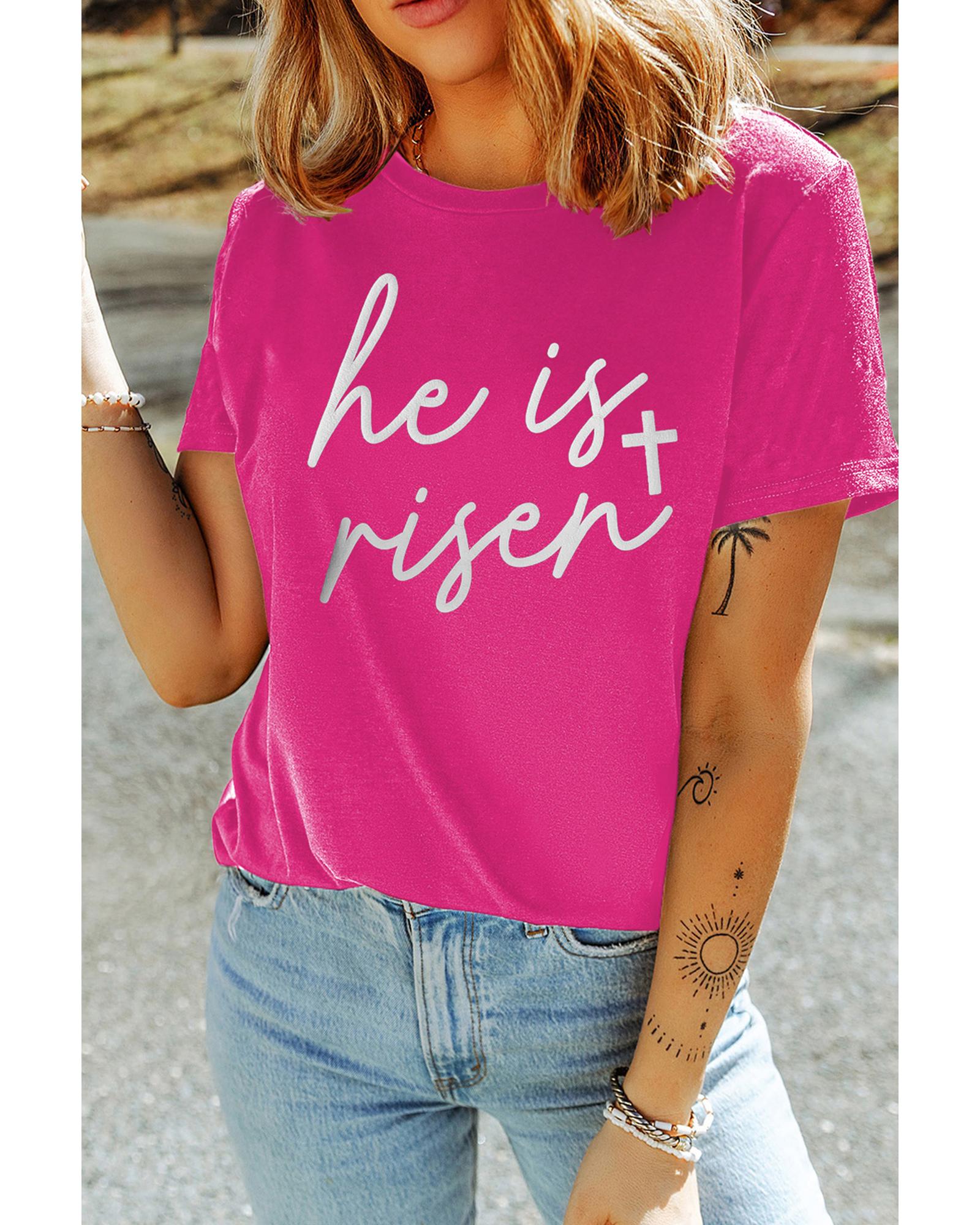 • Rose Red Glitter He is Risen Cross Printed Crewneck Tee