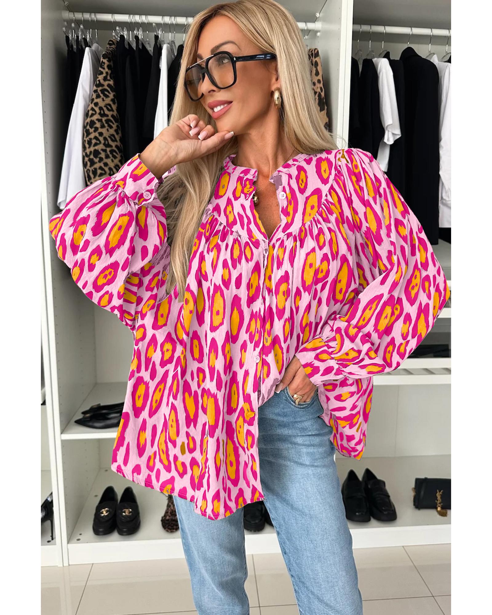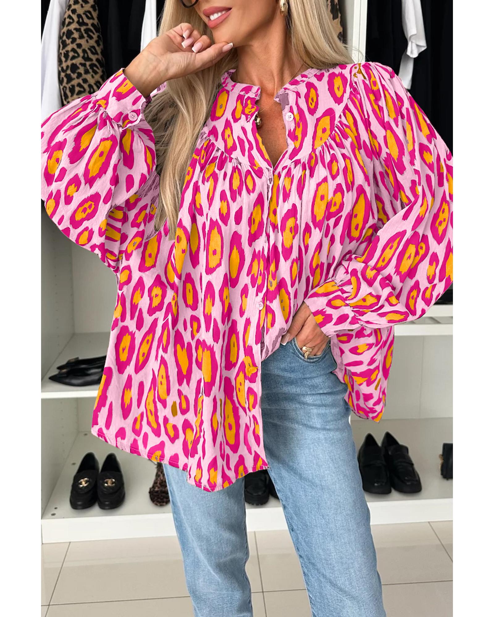 Rose Red Oversized Leopard Print Balloon Sleeve Casual Shirt – L