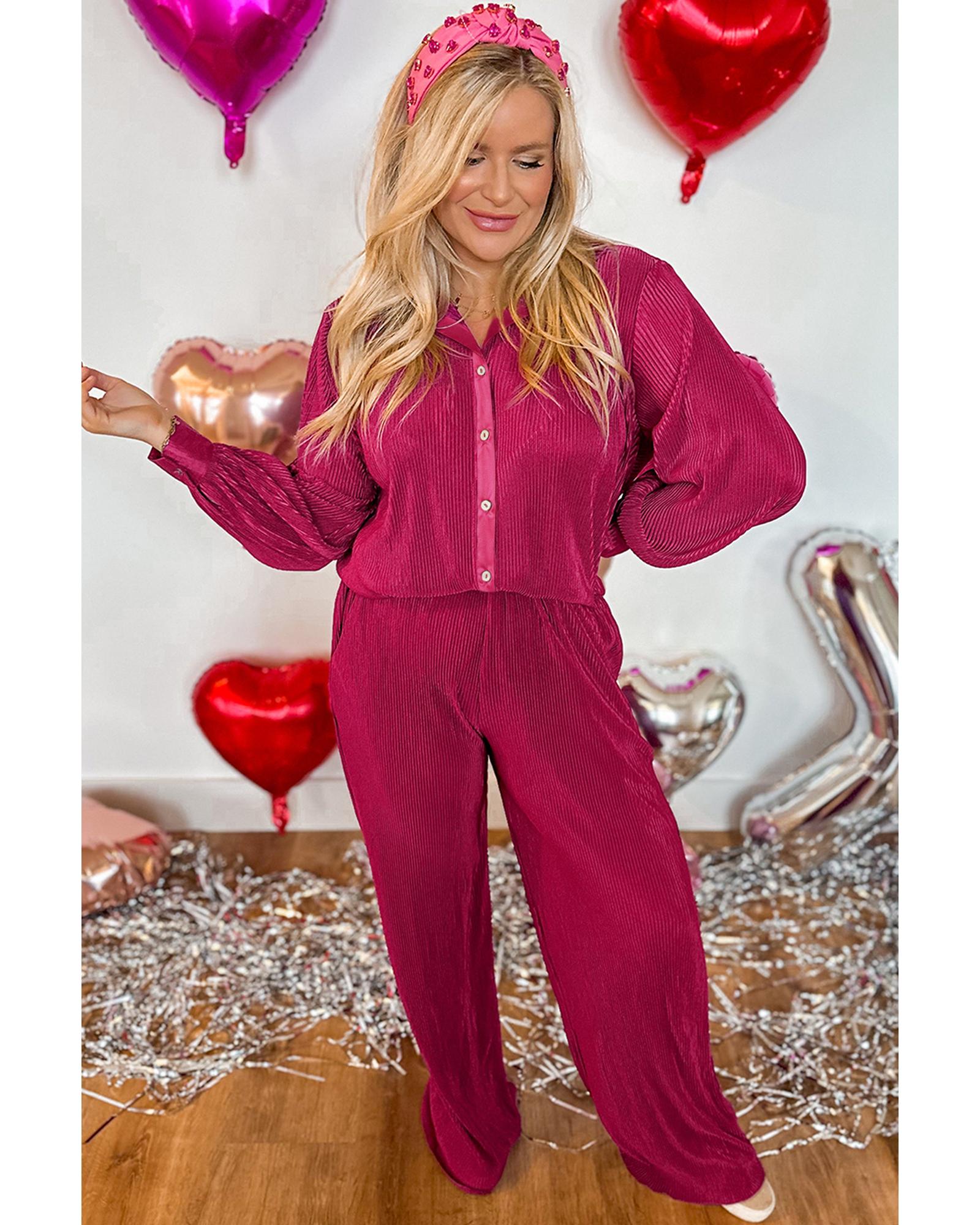 Rose Red Plus Size Ribbed Long Sleeve Shirt and Pants Pajama Set – 3X