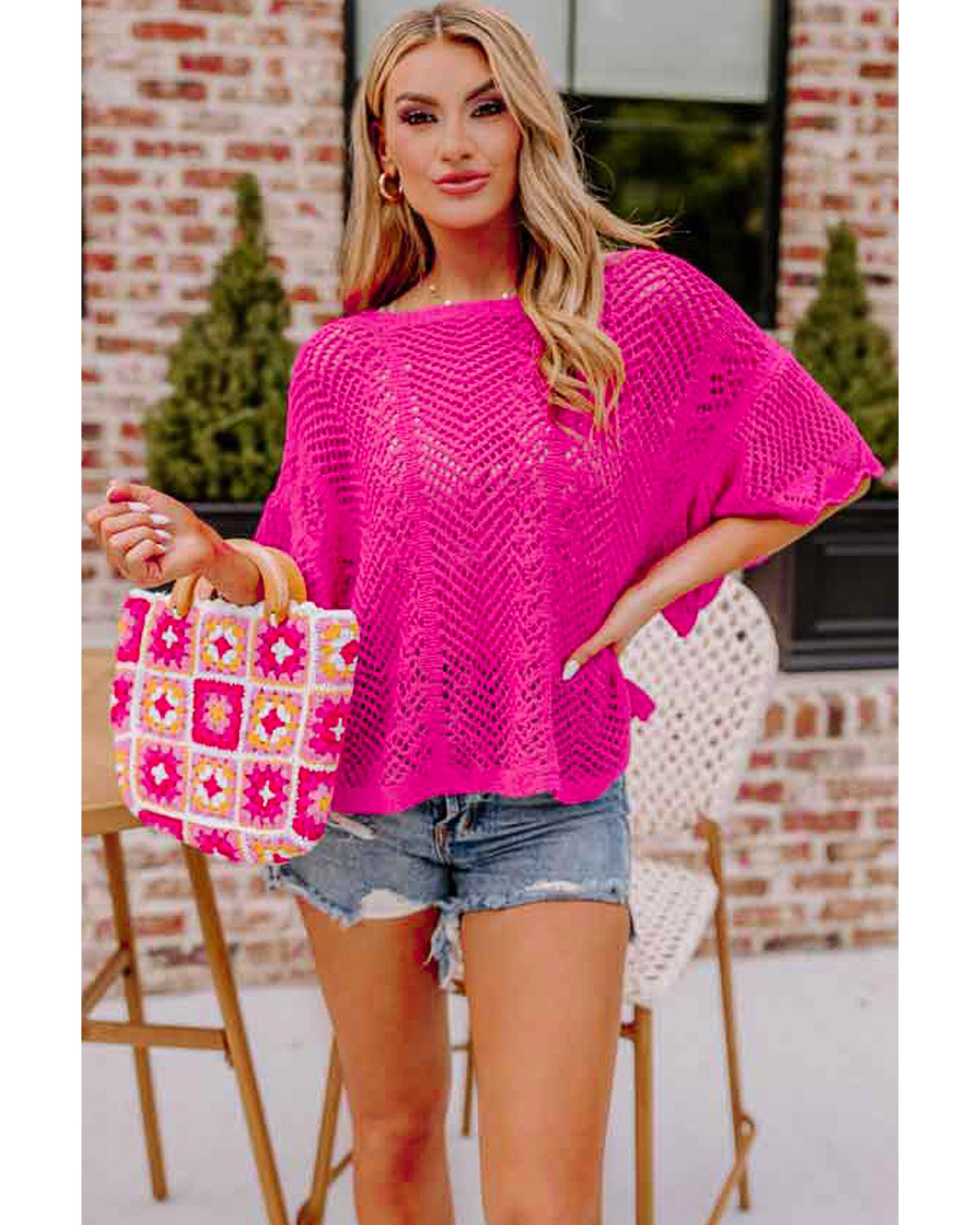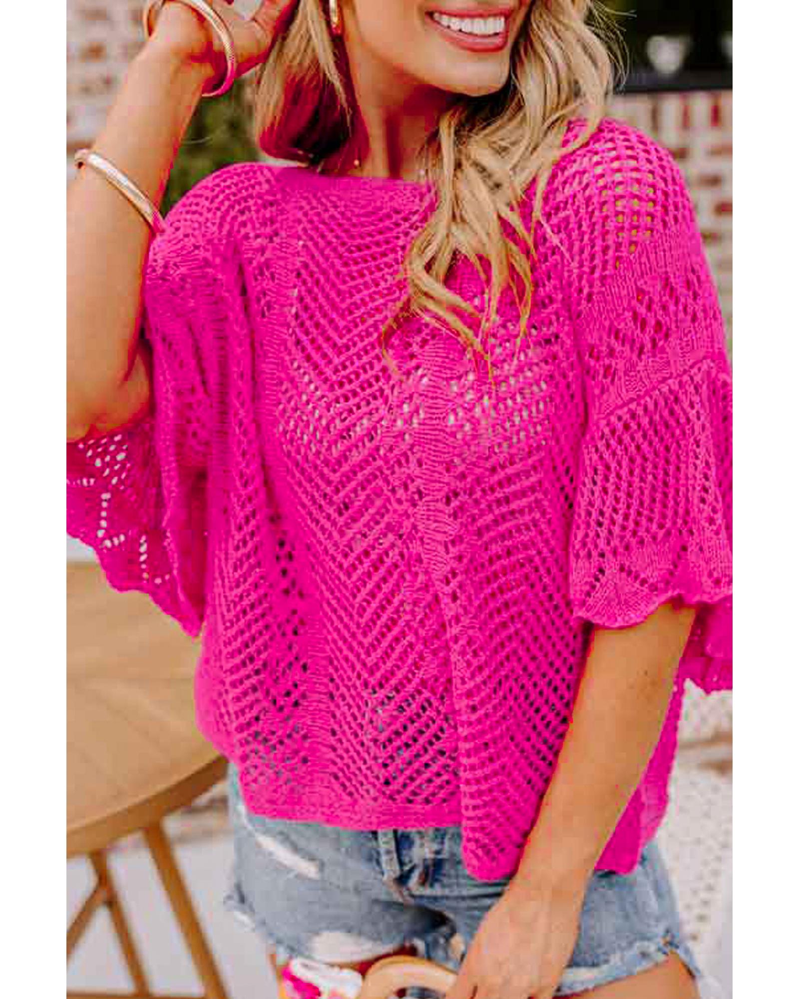 Rose Red Pointelle Knit Scallop Edge Short Sleeve Top – S