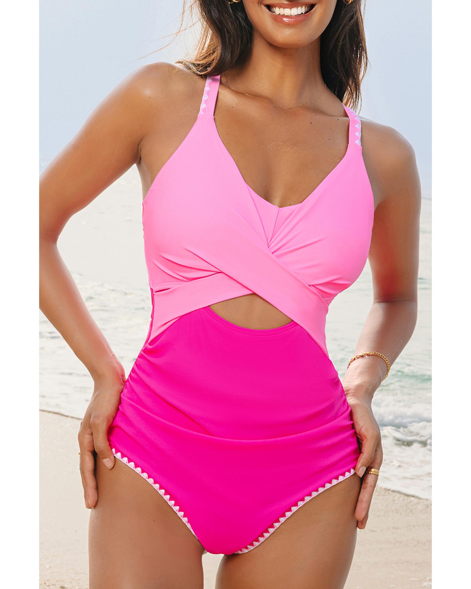 Rose Red Ric Rac Trim Contrasted Patchwork Cutout One Piece Swimsuit – L