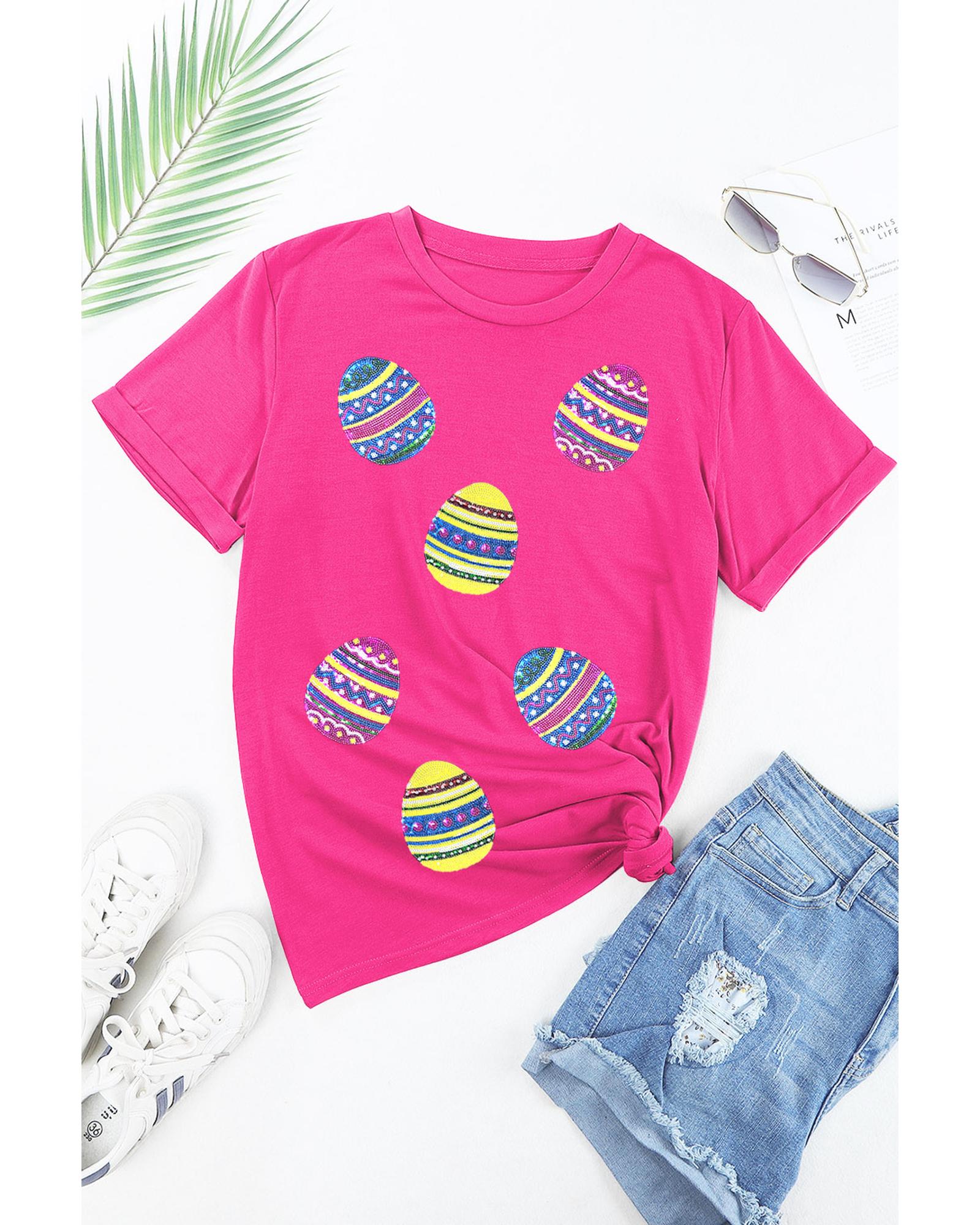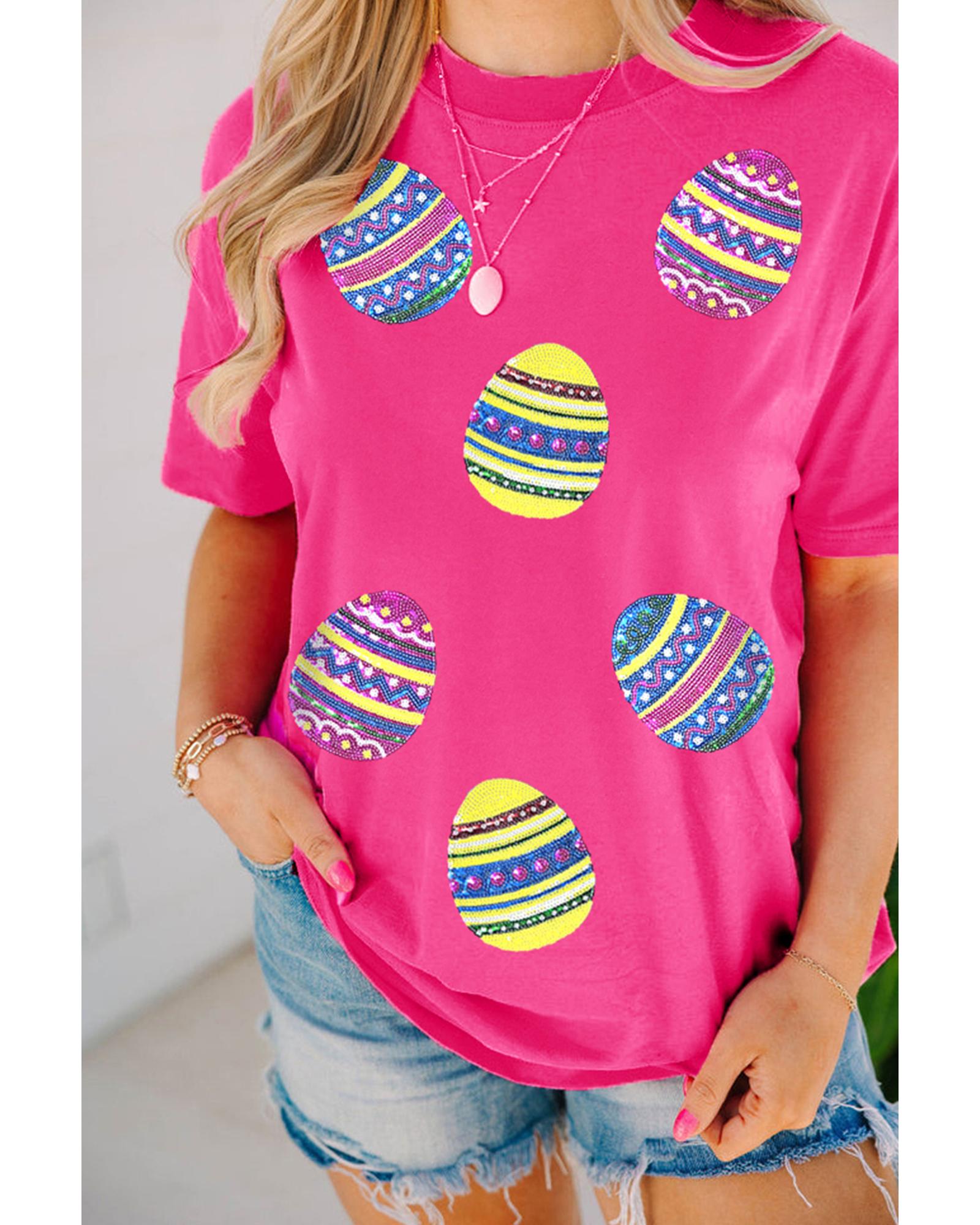 Rose Red Sequin Easter Egg Graphic Casual T Shirt – M