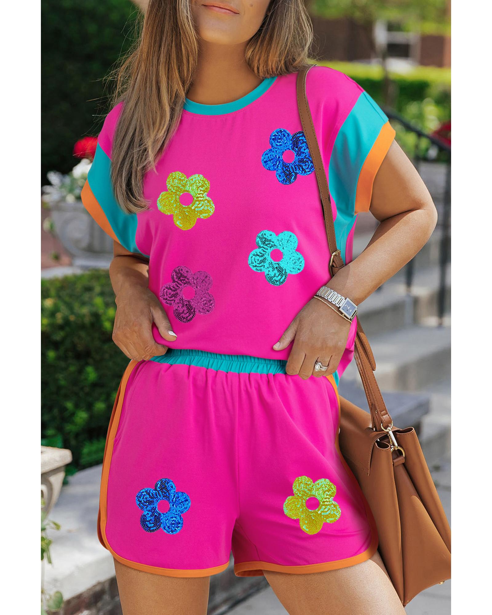 Rose Red Sequined Flower Graphic Colorblock 2 Piece Shorts Set – L