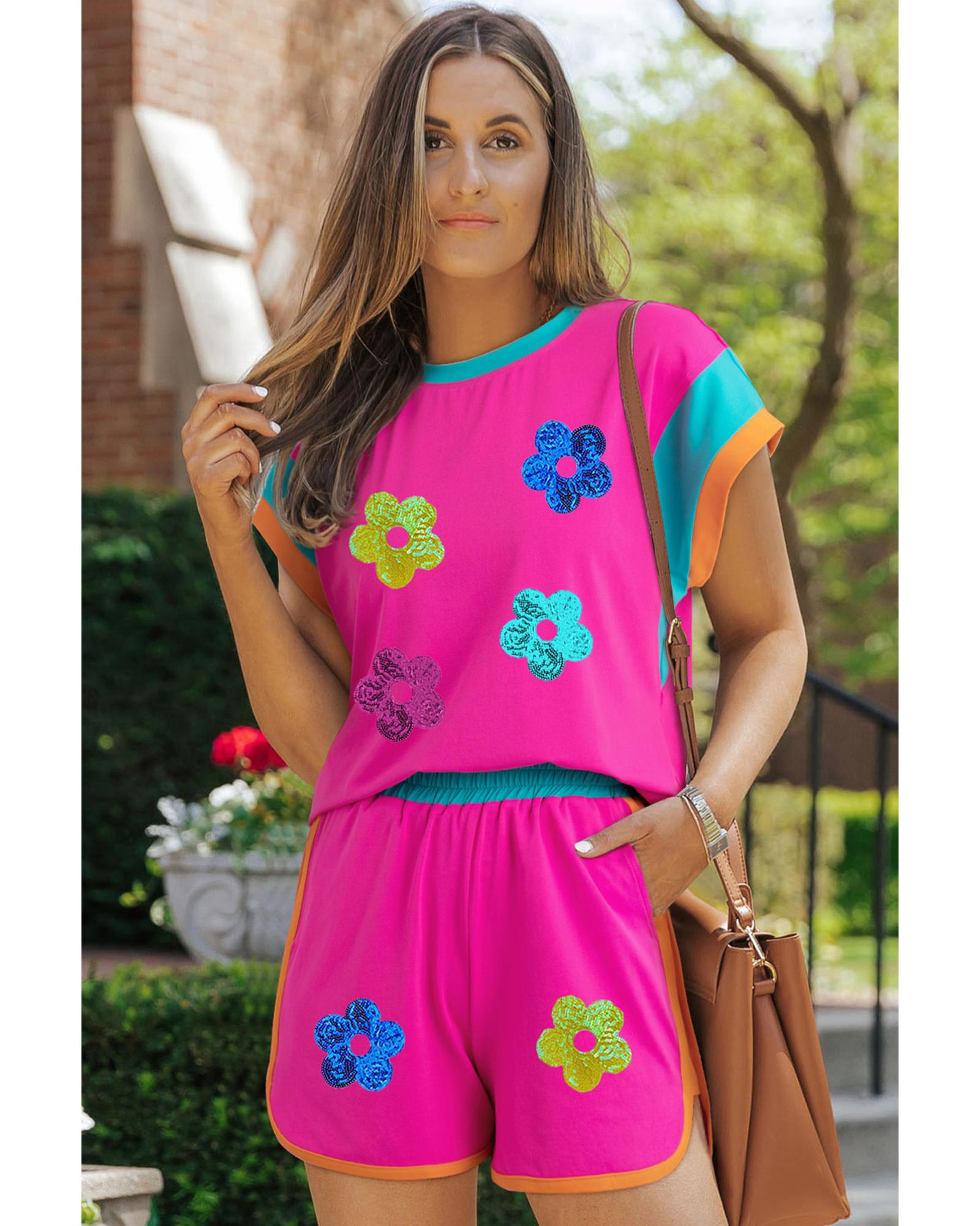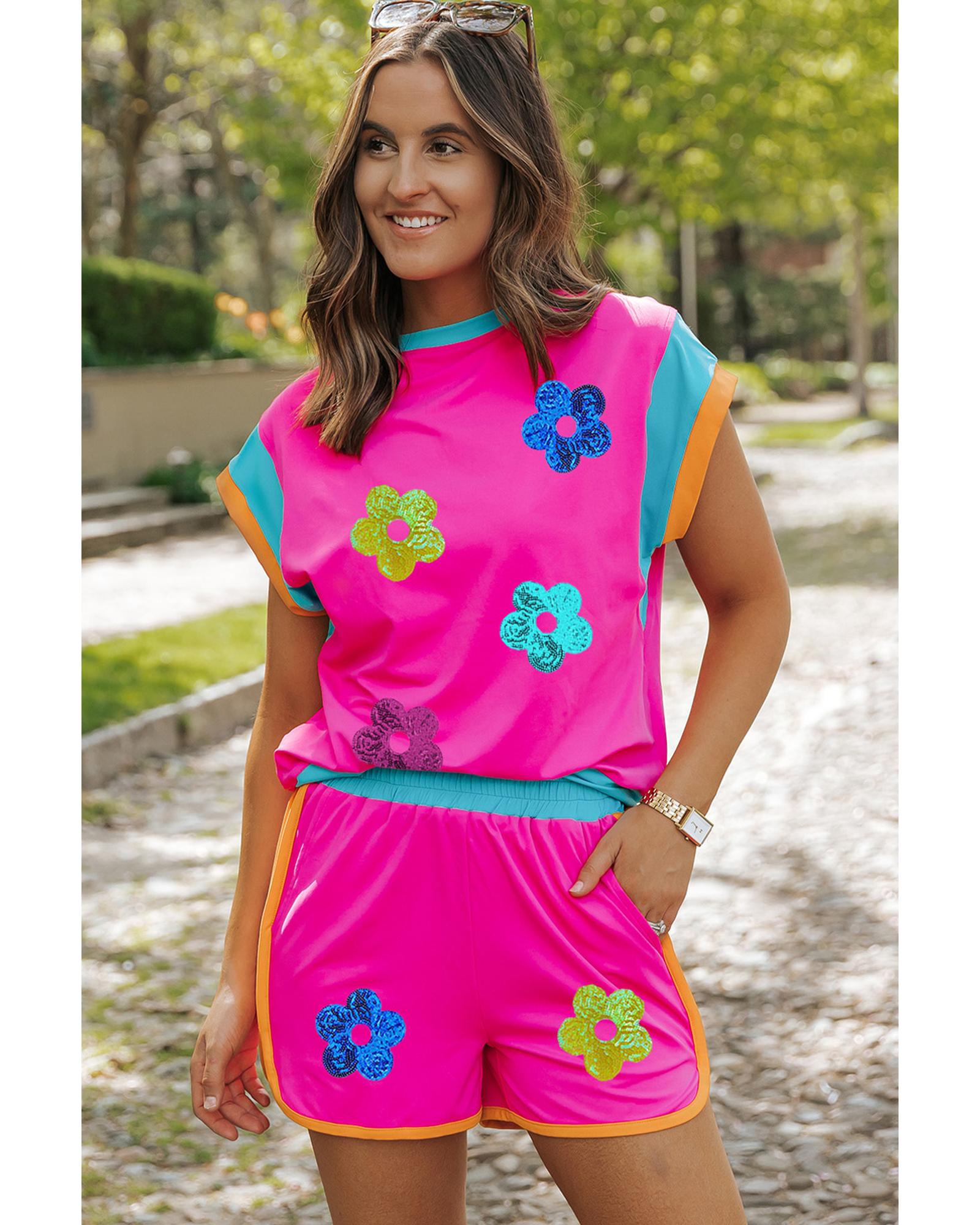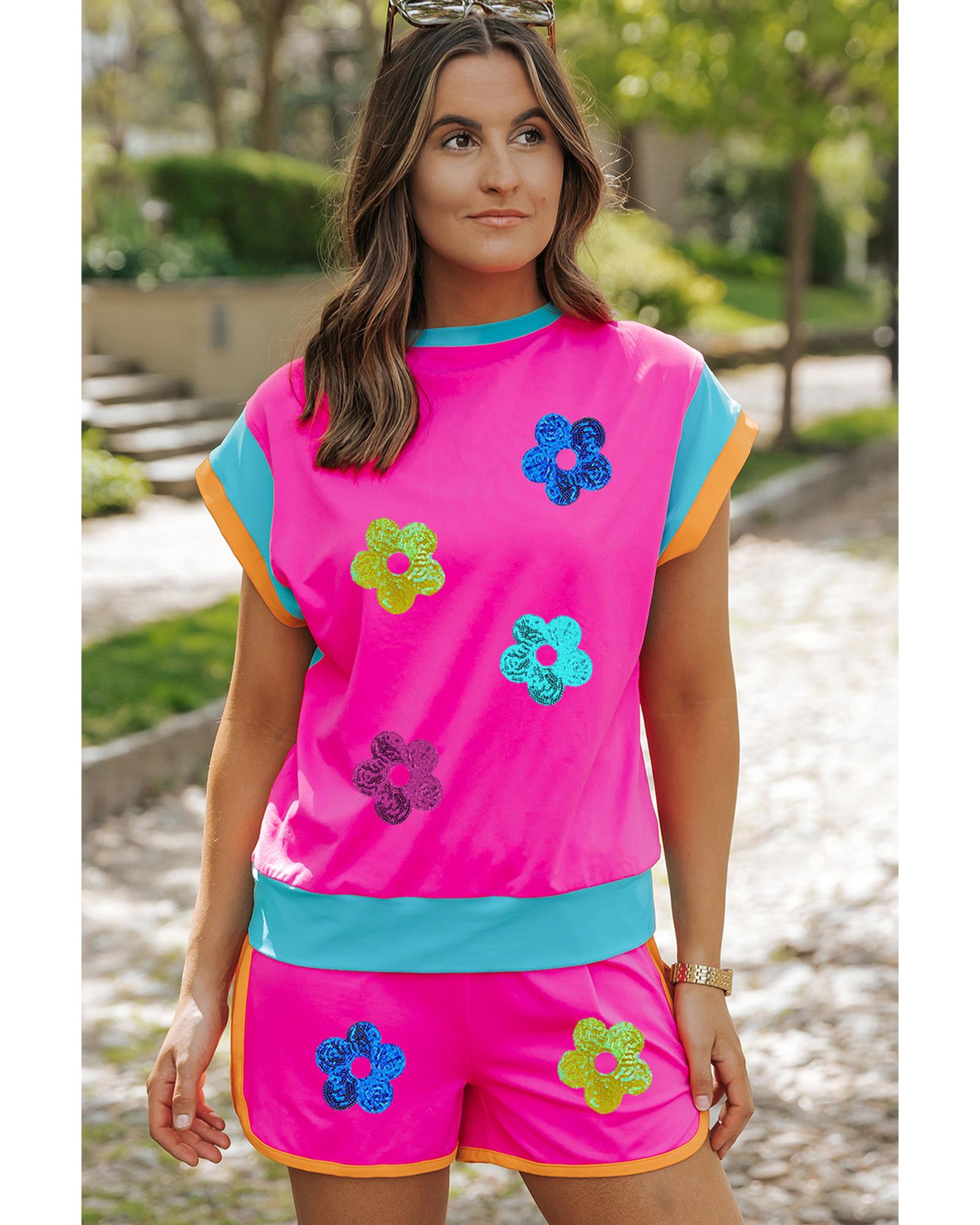Rose Red Sequined Flower Graphic Colorblock 2 Piece Shorts Set – XL