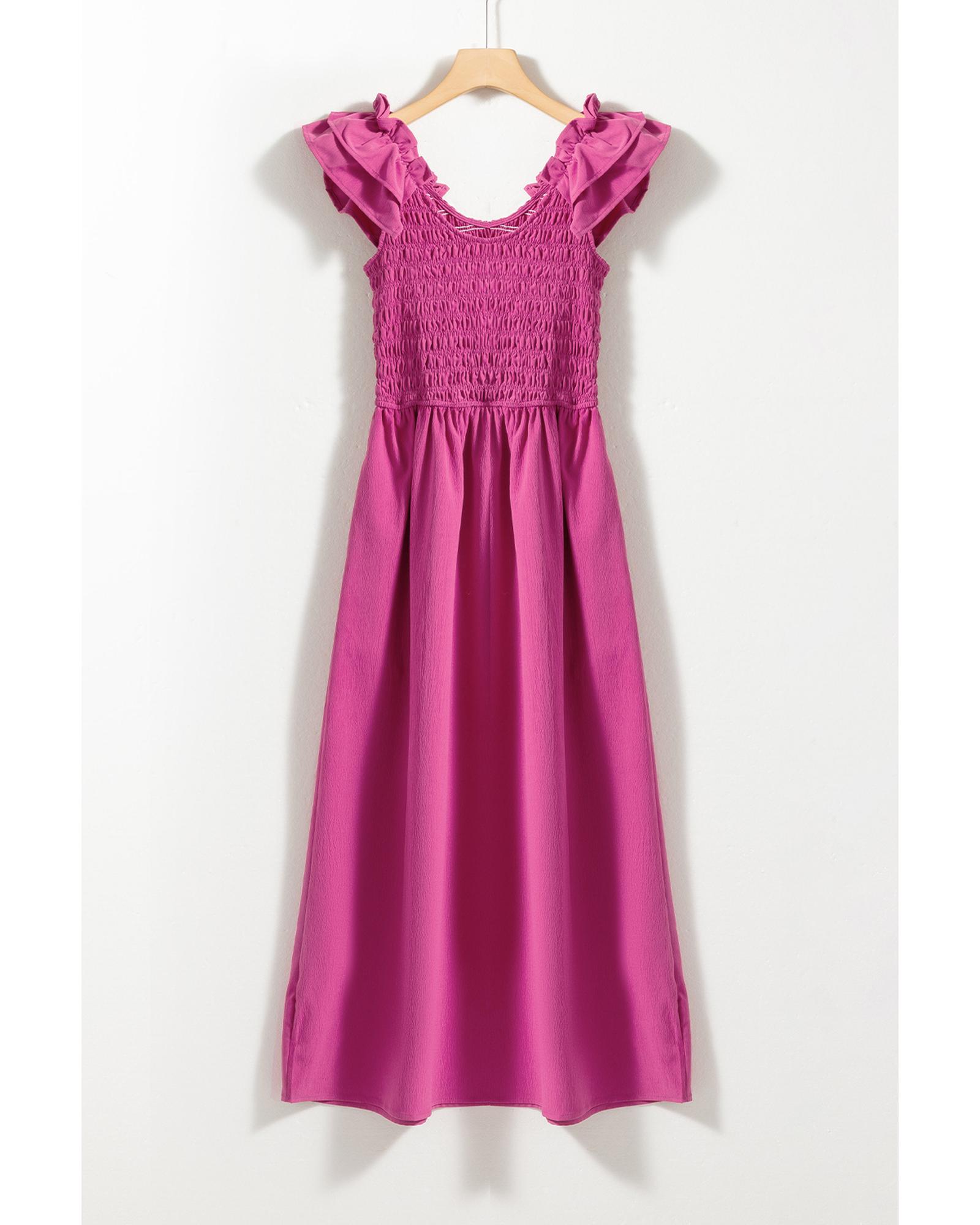 - Rose Red Solid Color Ruffled Straps Smocked Ruched Maxi Dress