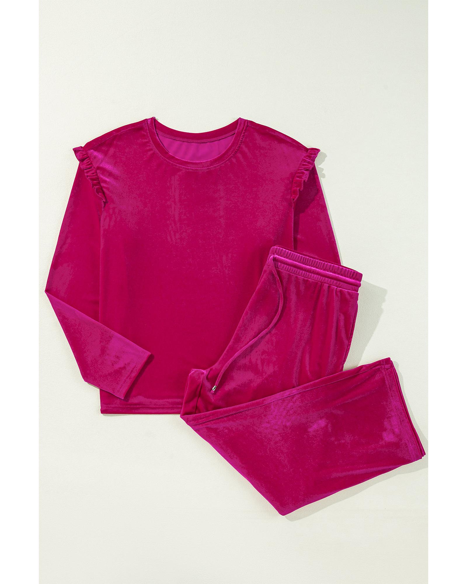 Rose Red Solid Velvet Ruffled Two Piece Pants Set – S
