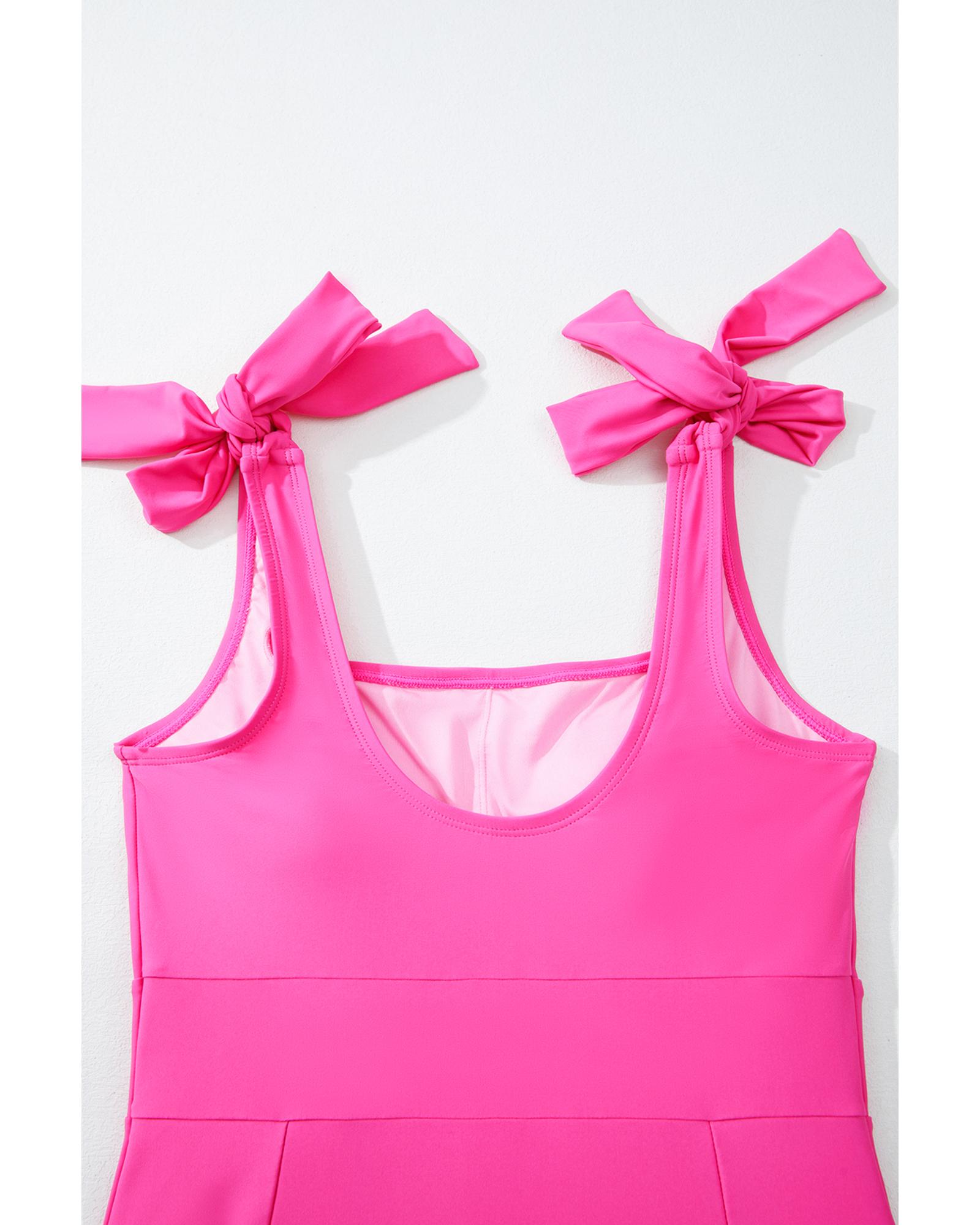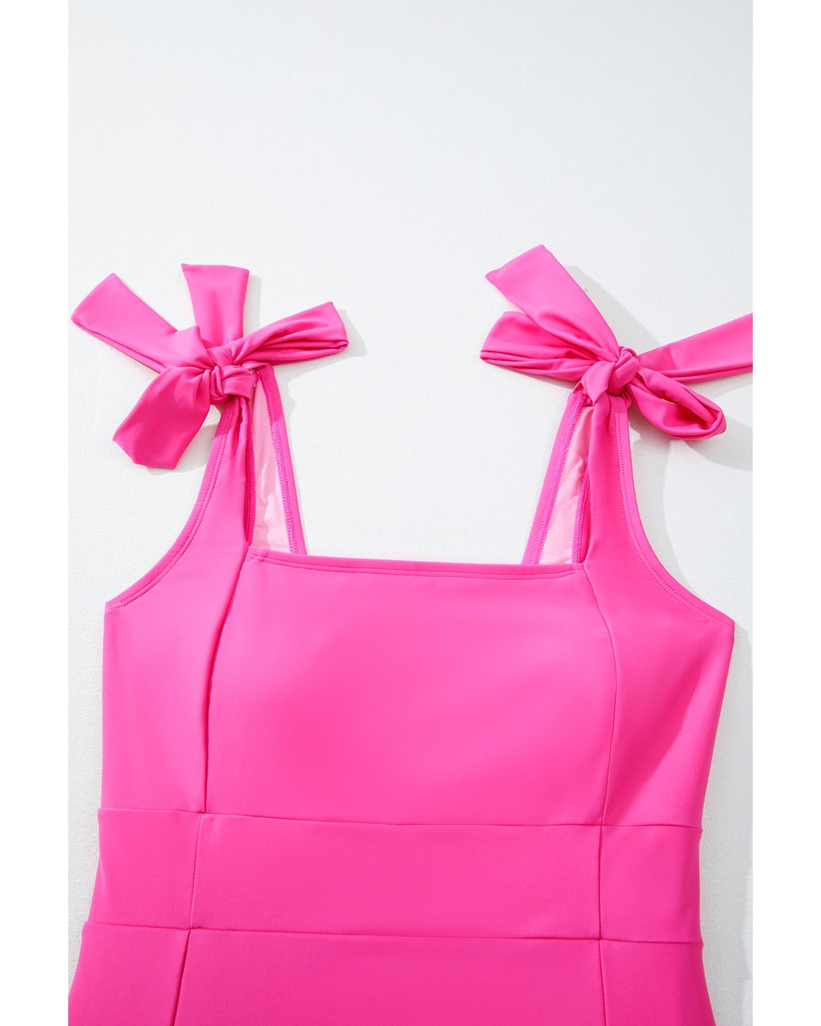 • Rose Red Square Neck Knotted Shoulder Open Back One Piece Swimsuit
